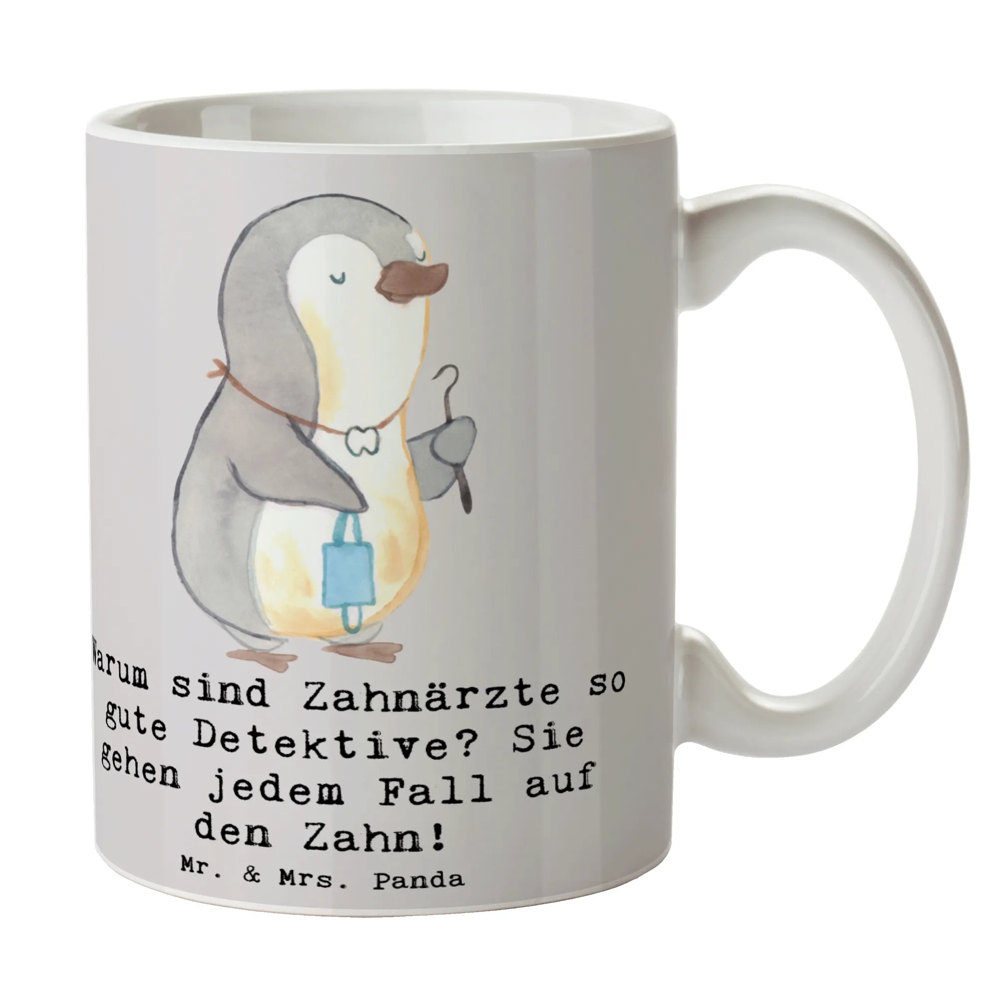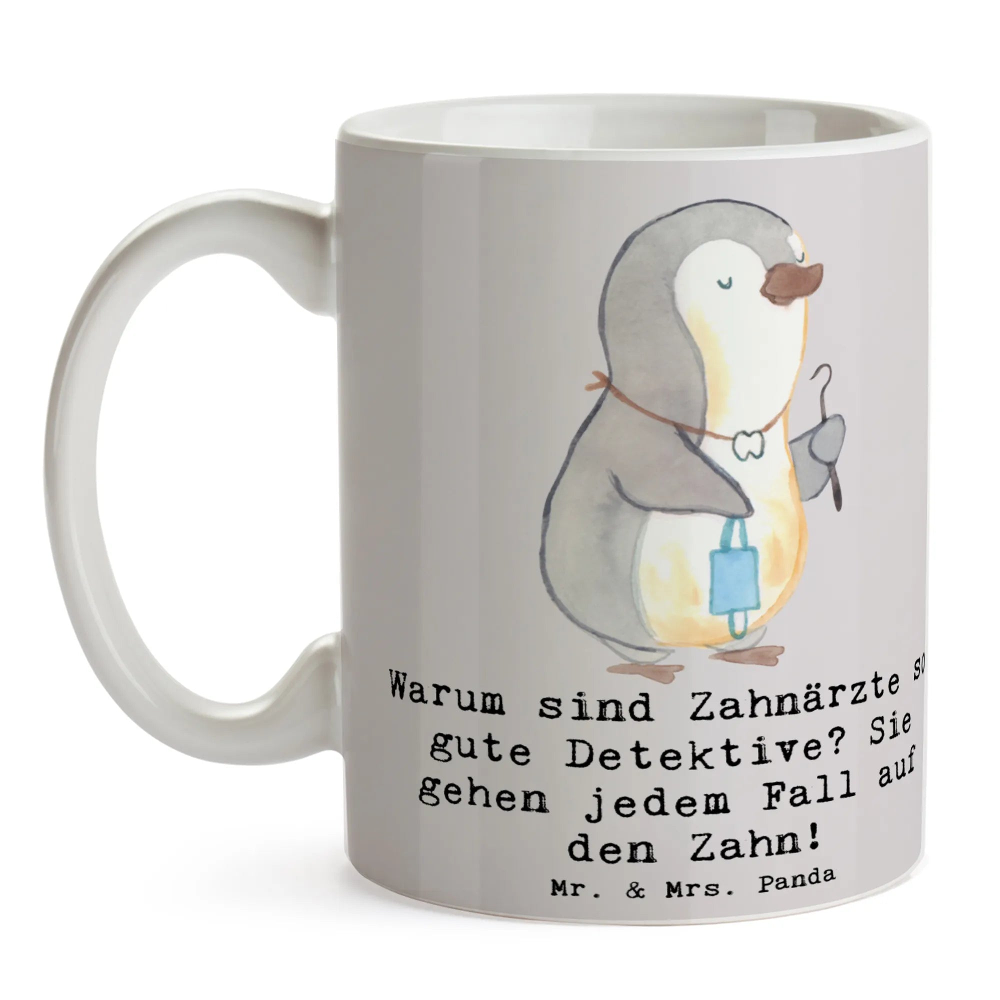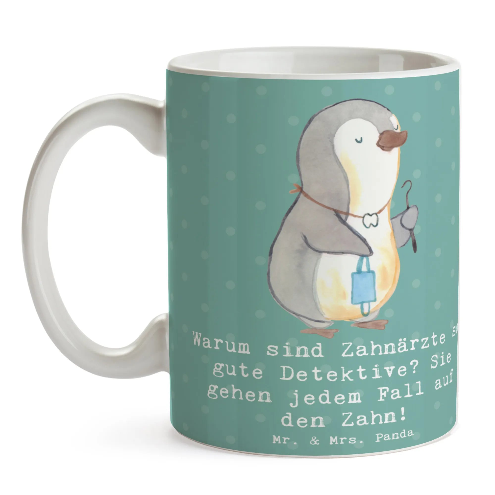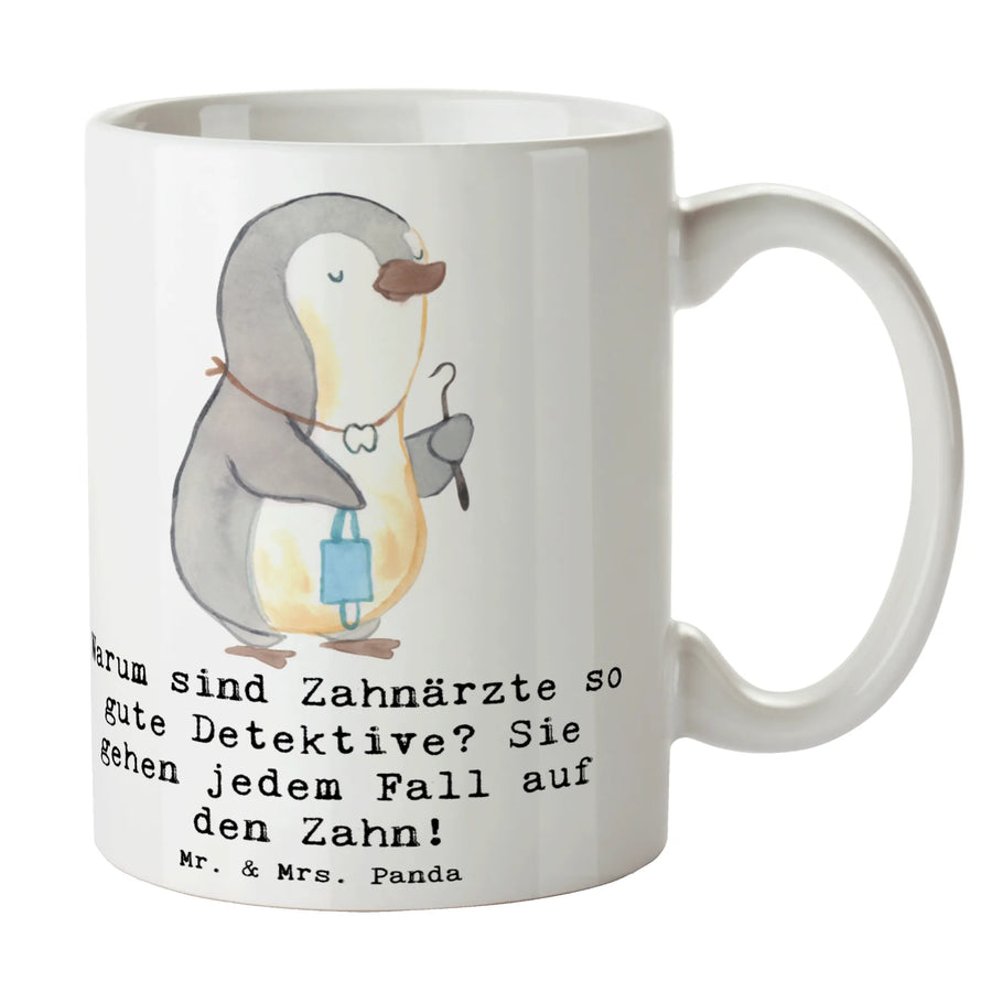 Entdecke die perfekte Tasse für alle Zahnärzte und Zahnarztliebhaber! Diese wunderschöne Keramiktasse von Mr. & Mrs. Panda vereint ein liebevolles Design mit einem witzigen Spruch, der garantiert ein Lächeln in dein Gesicht zaubert: "Warum sind Zahnärzte so gute Detektive? Sie gehen jedem Fall auf den Zahn!" Mit einer Füllmenge von 325 ml ist sie ideal für deinen morgendlichen Kaffee oder einen entspannenden Tee am Nachmittag.