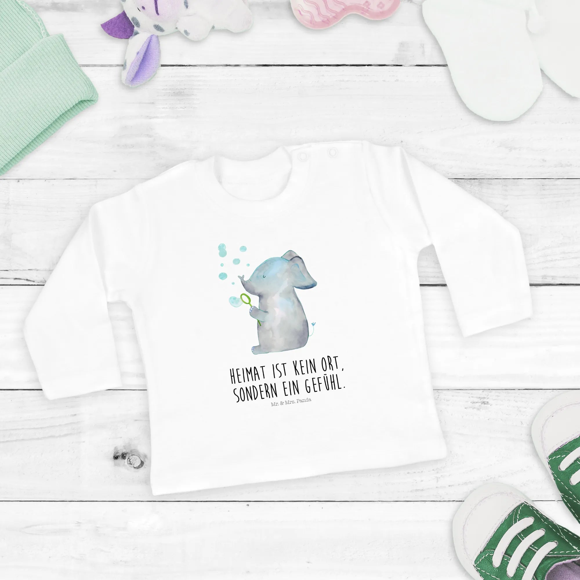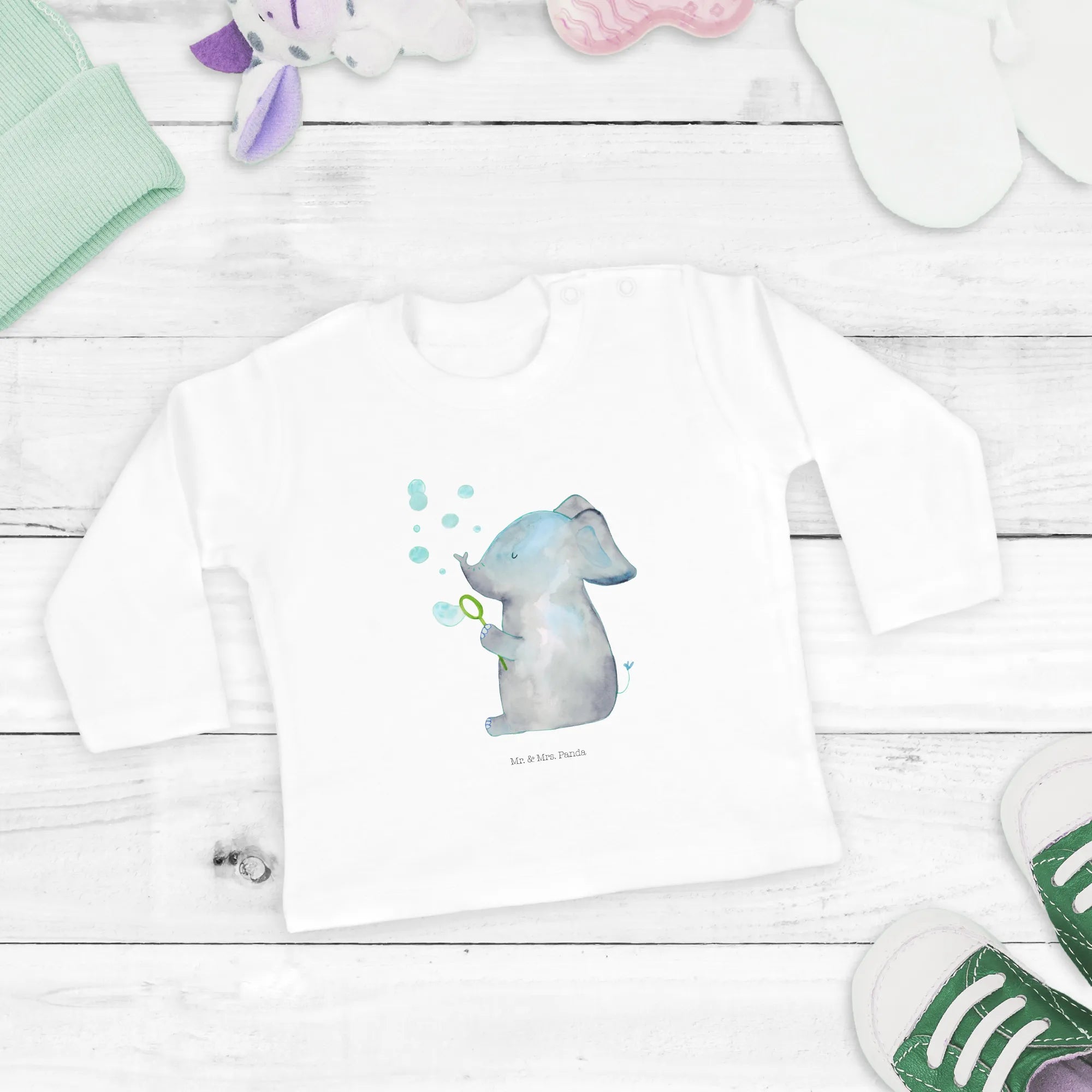 Crafted from 100% organic cotton, this long-sleeve shirt is soft against your baby's sensitive skin, ensuring they feel cozy throughout their adventures, whether they're playing or napping. The precious elephant, affectionately designed by Mrs. Panda, invites you into a cheerful small world filled with sweet little animals. Imagine your baby, giggling and reaching out delightfully at the bubbles floating around, making this clothing item a staple for fun and love.