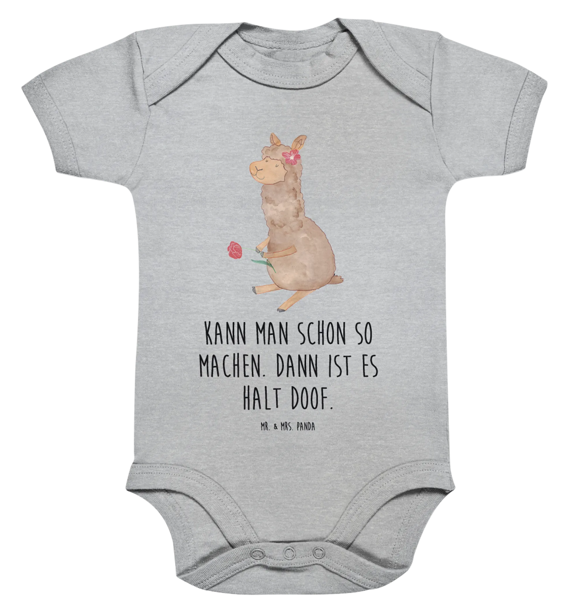 Imagine a sweet little one snuggling in a baby body adorned with a playful alpaca carefully drawn by Mrs. Panda. The cute alpaca, happily holding two beautiful flowers, is not only a delightful design but also a reminder to cherish nature's beauty. This lovely motif is perfect for baby boys and girls alike, making it a versatile addition to any baby’s wardrobe. The heather grey background serves as a soothing canvas, allowing the whimsical alpaca to stand out beautifully, making your little one the star of every gathering.
