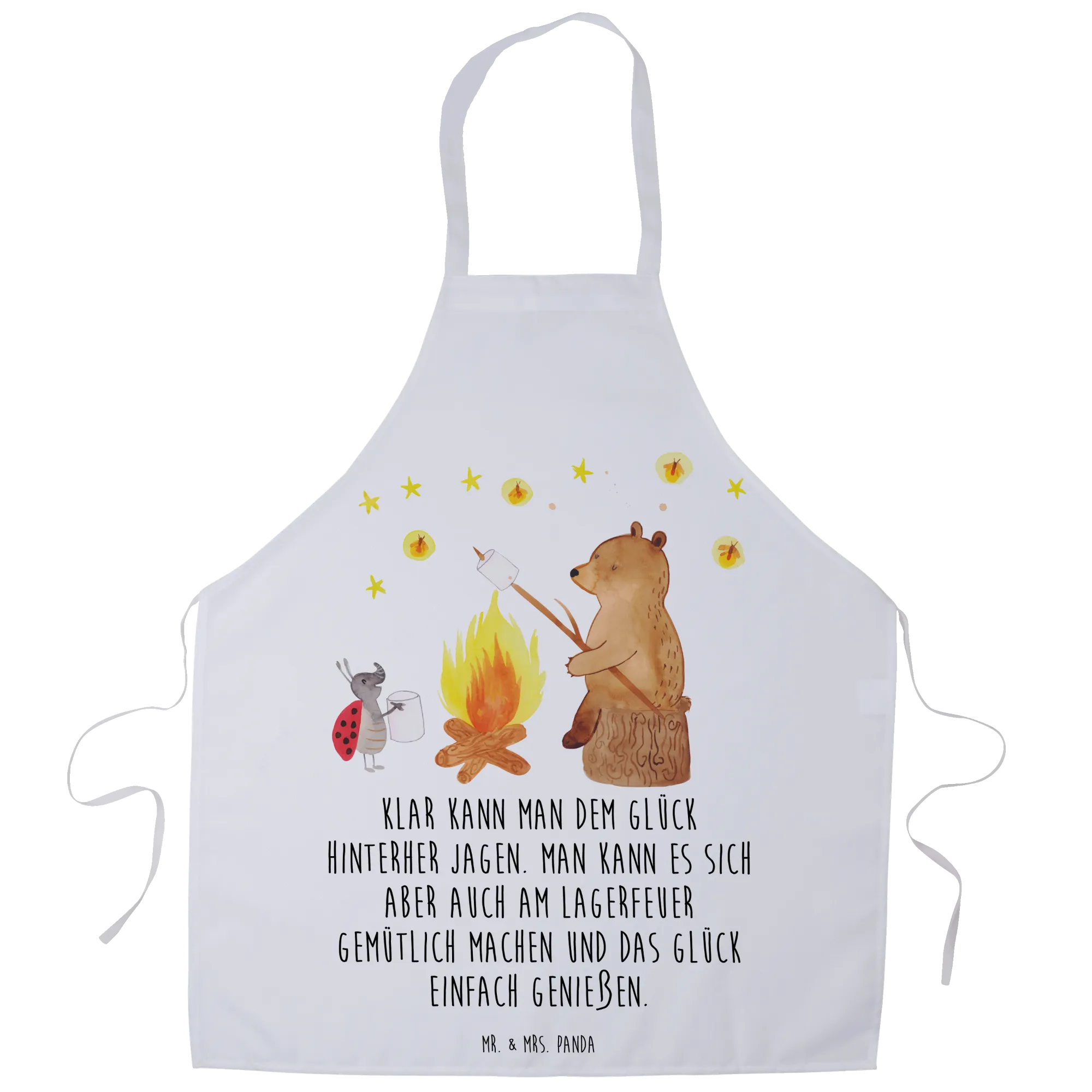 Imagine pulling your favorite dishes out of the oven while donning this enchanting apron featuring a delightful illustration of a bear and a ladybird relaxing by a cozy campfire. The bear, perched on a tree stump, is holding a marshmallow over the flames, and the ladybird is keeping watch, leaning on a bucket. The magical, starry backdrop adds to its charm, making it not only practical but also an invitation to unwind in the kitchen.