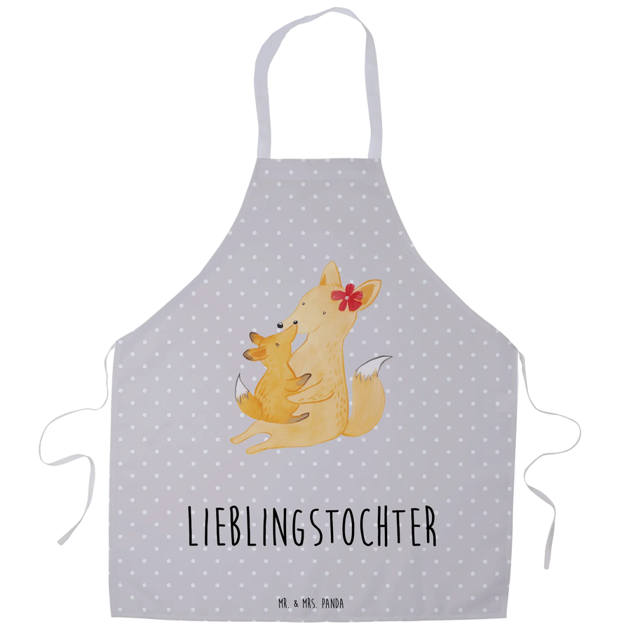 The scene depicted on the apron features a heartwarming illustration of a mother fox lovingly embracing her young, both sporting that adorable yellow-orange fur with white-tipped tails, radiating pure joy and affection.