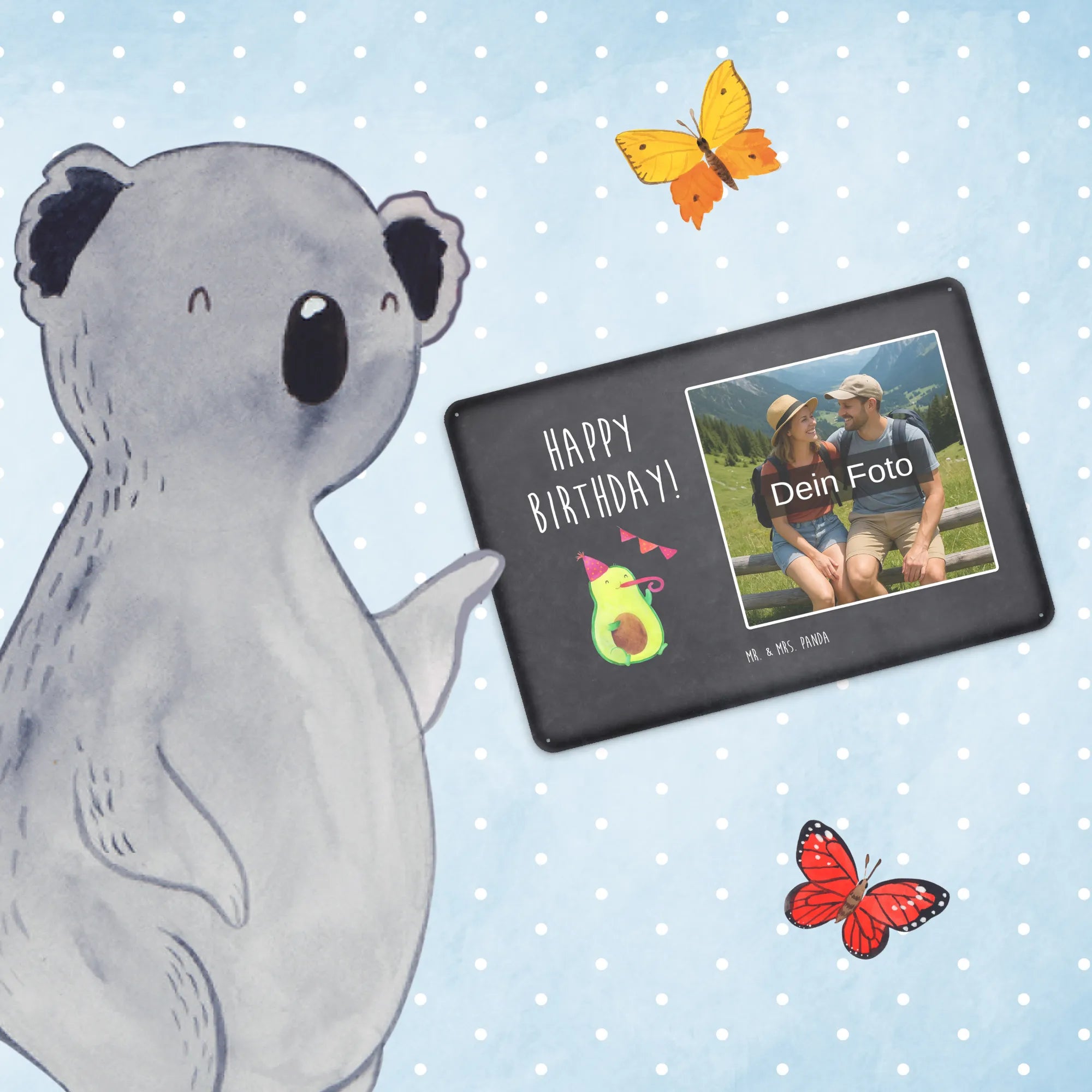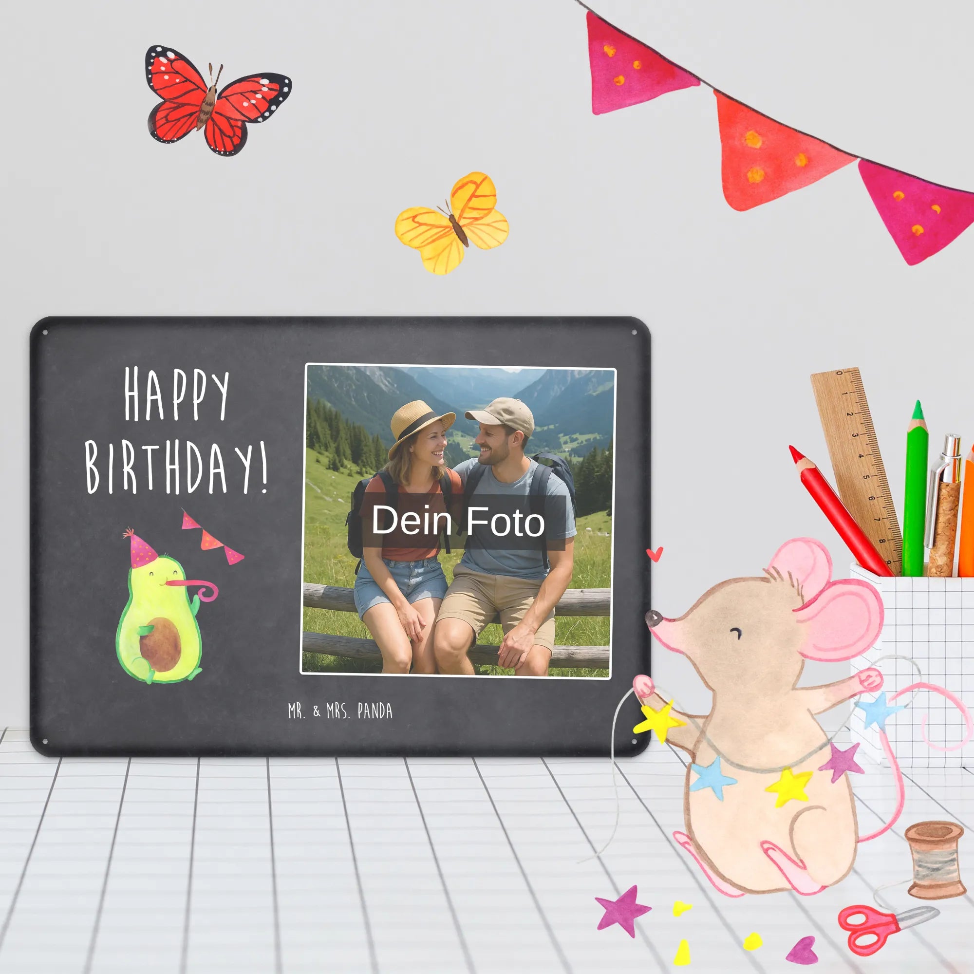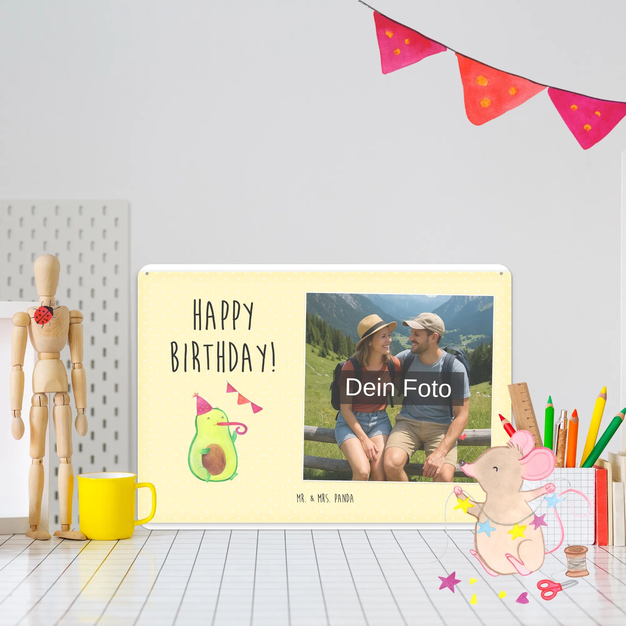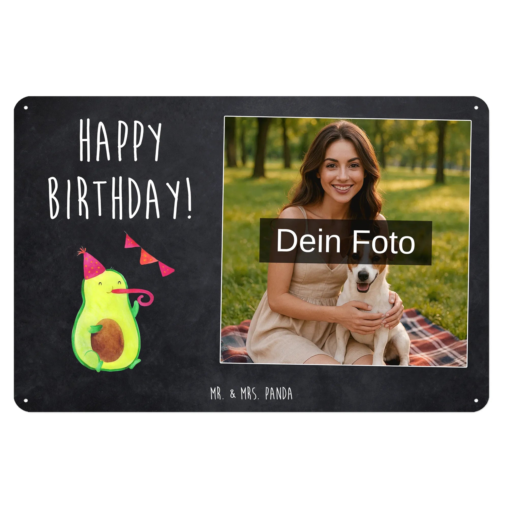 Suchst du ein freches, persönliches Geschenk zum Geburtstag? Unser Personalisiertes Foto Blechschild „Avocado Birthday“ von Mr. & Mrs. Panda verbindet süßes Design mit deiner eigenen Fotopersonalisierung. Eine fröhliche Avocado mit Partyhut und Partypfeife plus der Slogan „Happy Birthday!“ – so wird jede Wand, jede Tür und jeder Raum zum Party-Hotspot. 🎉🥑