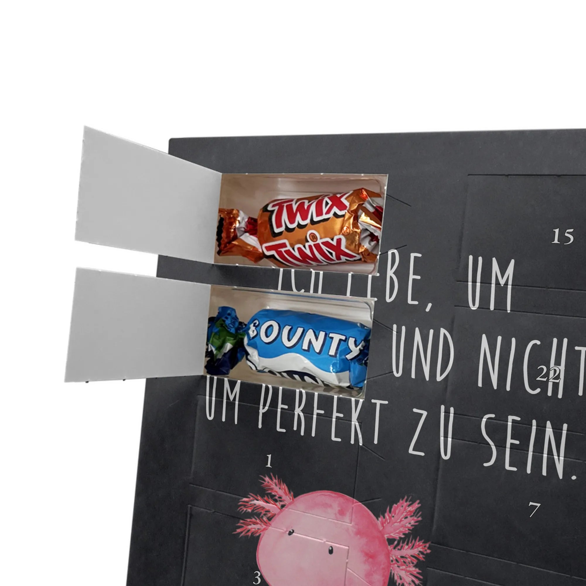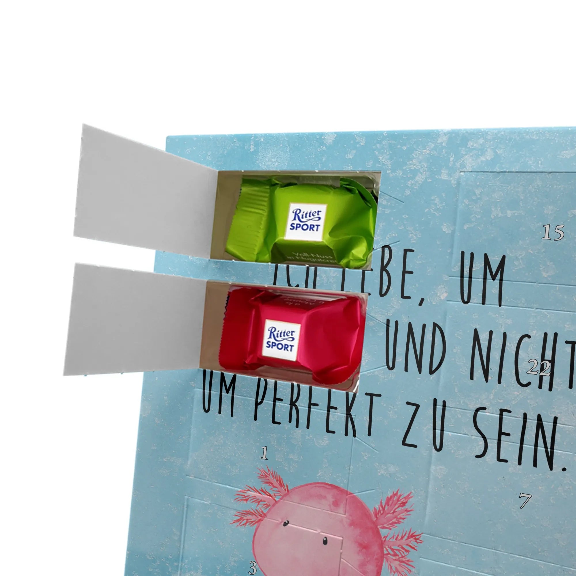 Wunderschöner Personalisierter Schoko Foto Adventskalender von Mr. & Mrs. Panda – das perfekte Geschenk für deine Liebsten! Dieser Adventskalender ist liebevoll gestaltet, bedruckt mit wunderschönen Motiven & Sprüchen von Mr. & Mrs. Panda und personalisierbar mit einem Foto deiner Wahl. Achte bitte auf hohe Auflösung: Lade ein Foto in guter Qualität und ausreichender Auflösung hoch, damit das Druckergebnis klar und brillant wird. Achte auf den richtigen Bildausschnitt, damit keine wichtigen Details abgeschnitten werden. Wir empfehlen, den Kalender-Rahmen vorher anzusehen, um zu wissen, wie dein Foto platziert wird. Lade nur Bilder hoch, bei denen du die Bildrechte besitzt oder die Erlaubnis hast. Die Fotos werden weder aufbereitet noch zugeschnitten. Rücknahme bei personalisierten Foto Artikeln ist ausgeschlossen. Der Kalender besticht durch brillante Druckqualität mit seidenmatter Oberflächenveredelung und bedruckte Seitenflächen. Maße: 325 mm x 225 mm x 27 mm. Besonderheit: Kann aufgehängt oder aufgestellt werden – ganz wie du möchtest. Gefüllt ist der Kalender mit Ritter Sport Schokowürfeln in leckeren Geschmacksrichtungen: Mousse au Chocolat, Schoko Crisp, Voll-Nuss in Nougatcreme, Karamell Duo, Joghurt und Erdbeer-Joghurt. Ein zauberhaftes, persönliches Geschenk, das Vorfreude bereitet und jeden Tag im Advent versüßt!