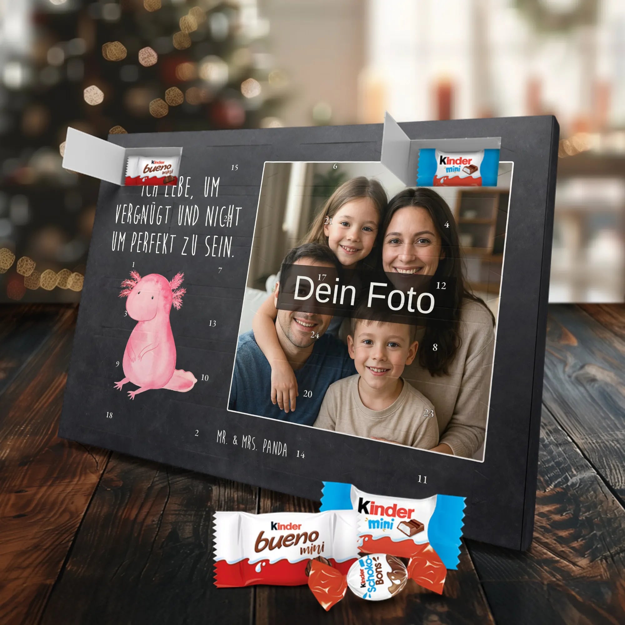 Personalisierter Schoko Foto Adventskalender von Mr. & Mrs. Panda – ein liebevoll gestaltetes Geschenk, das Vorfreude und Genuss vereint. In diesem personalisierten Schoko Foto Adventskalender kannst du dein Lieblingsfoto einsetzen und so jeden Tag im Dezember mit einem kleinen Lächeln öffnen. Der Kalender ist bedruckt mit unseren typischen Mr. & Mrs. Panda Motiven und süßen Sprüchen, die perfekt zu deinem Foto passen. Achte bitte bei der Bildauswahl auf hohe Auflösung, damit der Druck klar und brillant wird. Wähle einen passenden Bildausschnitt, damit keine wichtigen Details abgeschnitten werden. Lade nur Bilder hoch, bei denen du die Bildrechte besitzt oder die Zustimmung der abgebildeten Personen vorliegt. Die Fotos werden weder nachbearbeitet noch zugeschnitten; Rücknahme bei personalisierten Foto-Artikeln ist ausgeschlossen. Die Druckqualität ist brillant mit einer seidenmatten Oberflächenveredelung und bedruckten Seitenflächen für ein rundum schönes Erscheinungsbild. Maße: 355 mm x 245 mm x 11 mm. Praktisch: Du kannst den Adventskalender entweder aufstellen oder an die Wand hängen. Gefüllt ist der Kalender mit kinder® Schokolade – genauer: kinder® Schoko-Bons, kinder® Bueno mini und kinder® Schokolade mini. Bitte beachte: Um das beste Druckergebnis zu erzielen, lade ein hochwertiges Foto hoch und kontrolliere vor dem Bestellen den Bildausschnitt. Dieser Adventskalender ist das perfekte, persönliche Geschenk für Familie, Freunde oder für dich selbst – voller Liebe, süßer Überraschungen und dem unverwechselbaren Mr. & Mrs. Panda Charme.