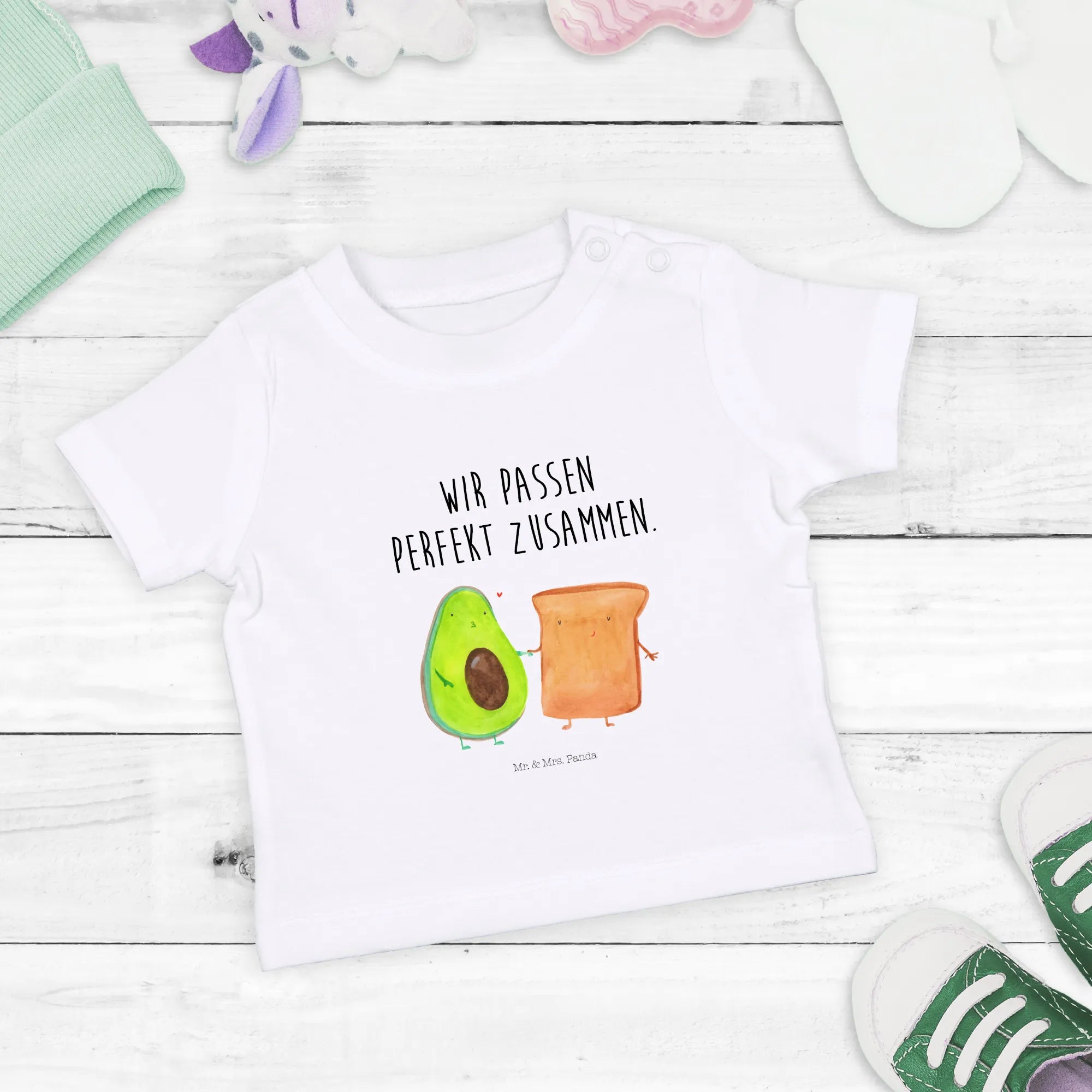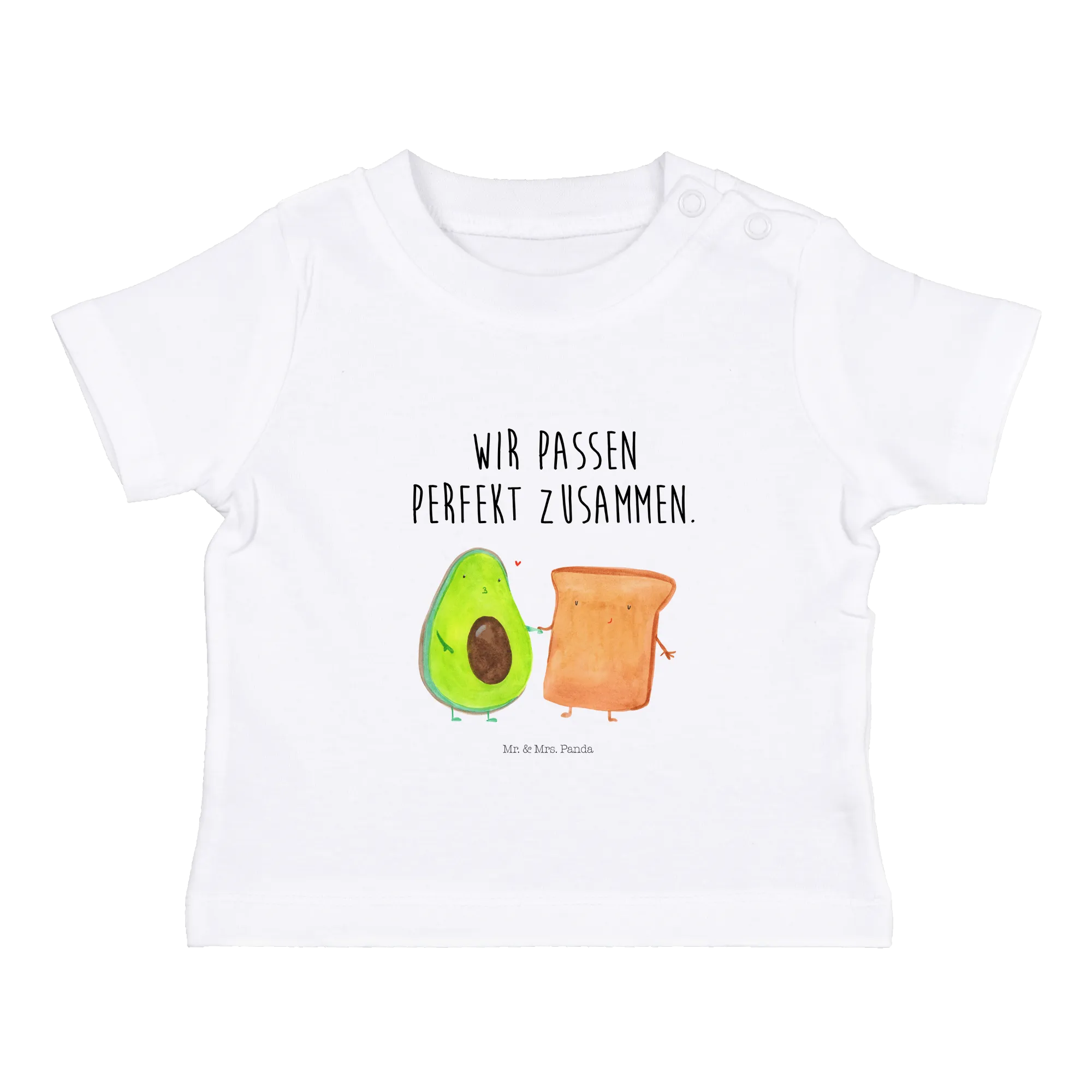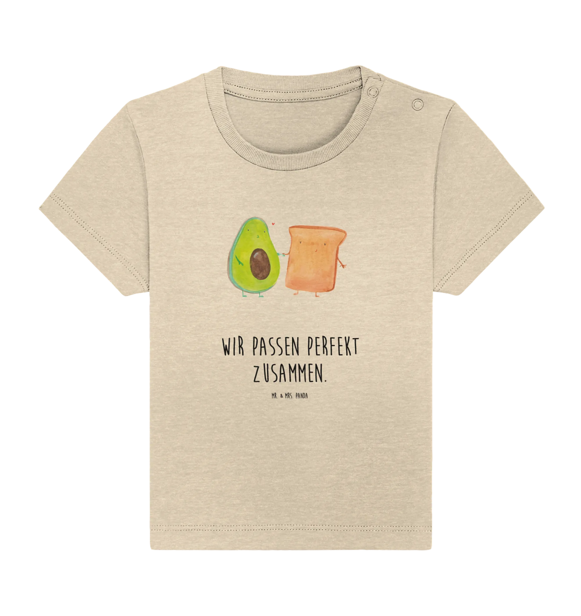 Welcome to the world of Mr. & Mrs. Panda, where cuteness knows no bounds! Our Organic Baby Shirt featuring the adorable motif of an avocado holding hands with a sweet toast is the perfect gift for your little one or as a delightful present for expectant parents.