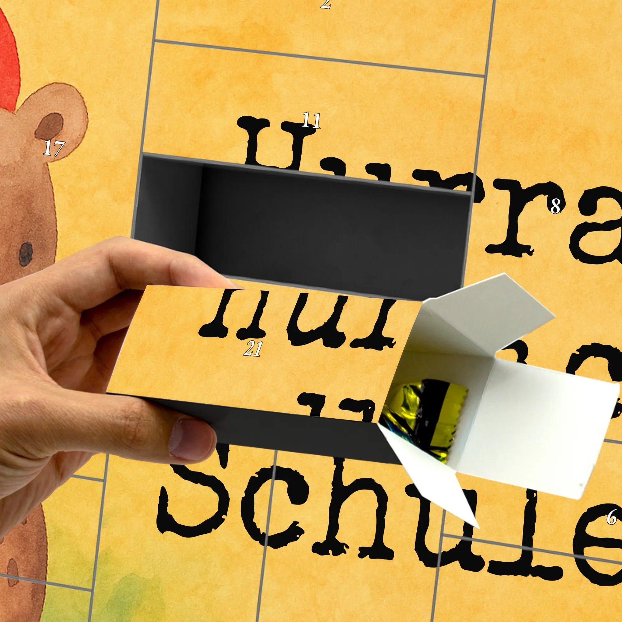 Unser befüllbarer Adventskalender „Bär mit Schultüte“ von Mr. & Mrs. Panda vereint Vorfreude, Wärme und liebevolle Illustration. Der niedliche Bär hält seine prall gefüllte Schultüte und begrüßt den kommenden Schulanfang mit dem fröhlichen Spruch „Hurra! endlich Schule!”. Ein wunderbares Einschulung Geschenk, das jeden Dezembertag zu etwas Besonderem macht.