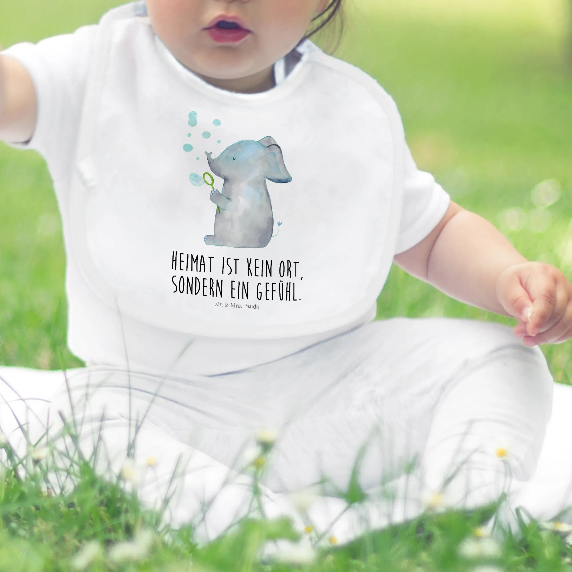 Der entzückende Elefant, der Seifenblasen pustet, bringt fröhliche Stimmung und eine Portion gute Laune in den Alltag. Mit dem Spruch "Heimat ist kein Ort, sondern ein Gefühl" wird dieses Babylätzchen zu einem echten Liebesbeweis! Es macht das Füttern und die Zeit mit dem kleinen Liebling noch schöner und einfacher – und schützt gleichzeitig die Kleidung vor nassen Flecken und Essensresten.