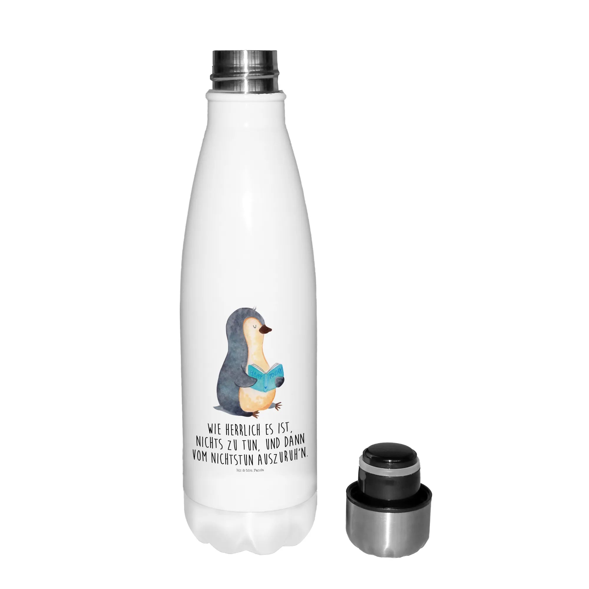 Unsere Thermosflasche „Pinguin Buch“ aus der Pinguin - Kollektion von Mr. & Mrs. Panda verbindet bezauberndes Design mit praktischer Funktion. Das handgezeichnete Motiv zeigt einen süßen Pinguin, der in sein Buch vertieft ist – ein treuer Begleiter für entspannte Lesestunden, Ferien am Meer oder gemütliche Pausen im Park.