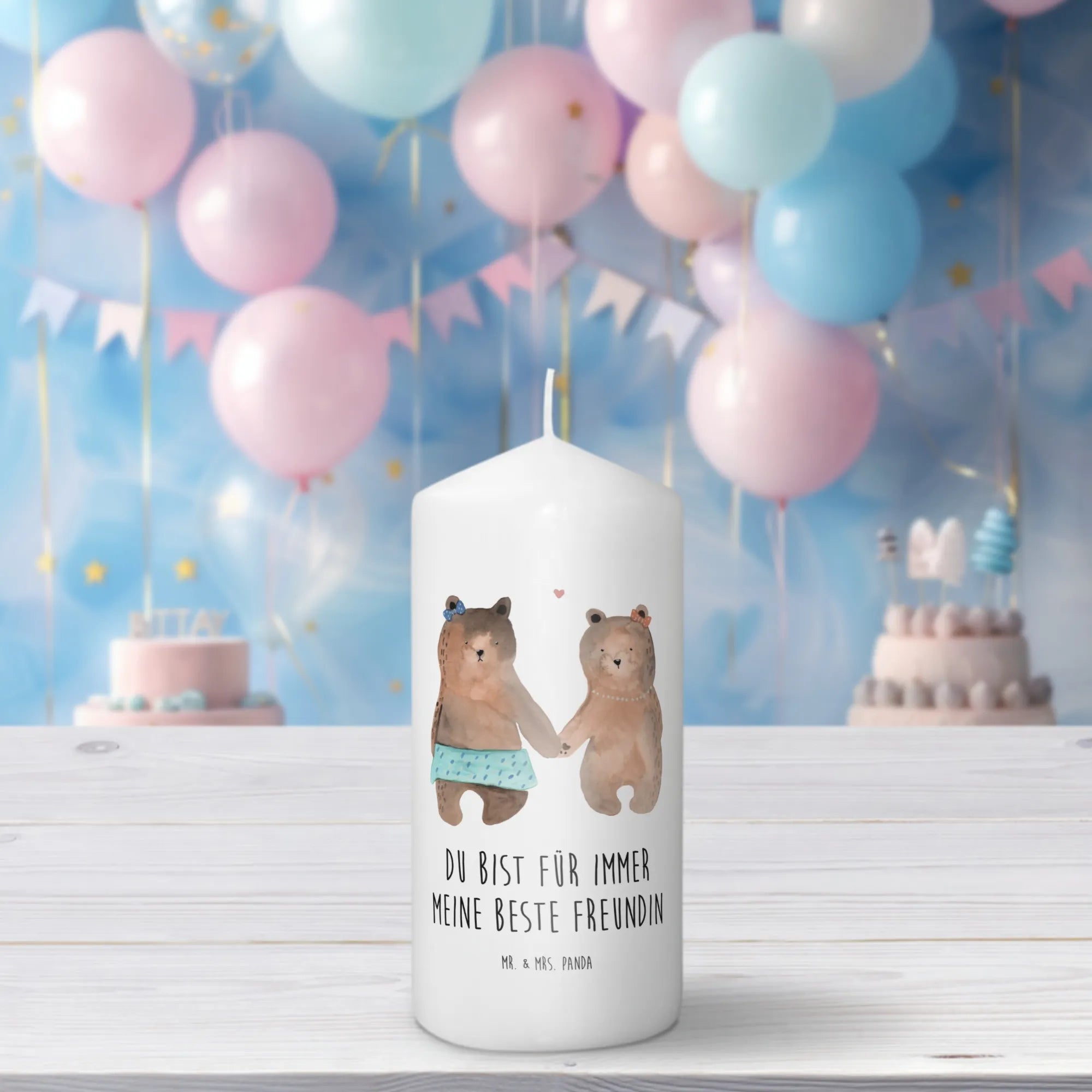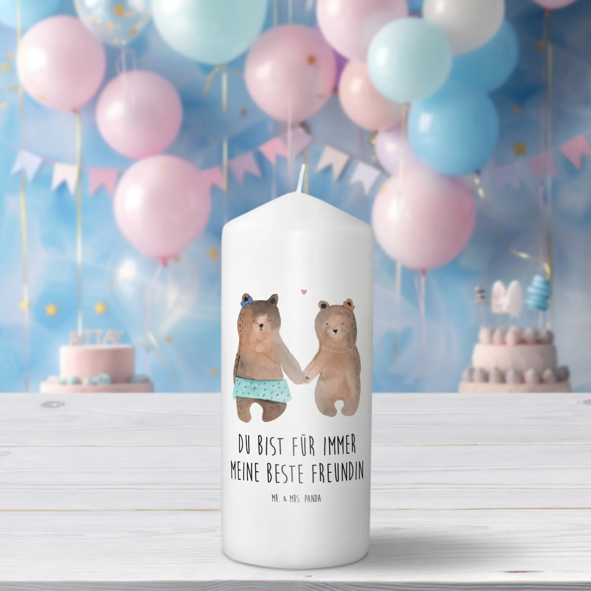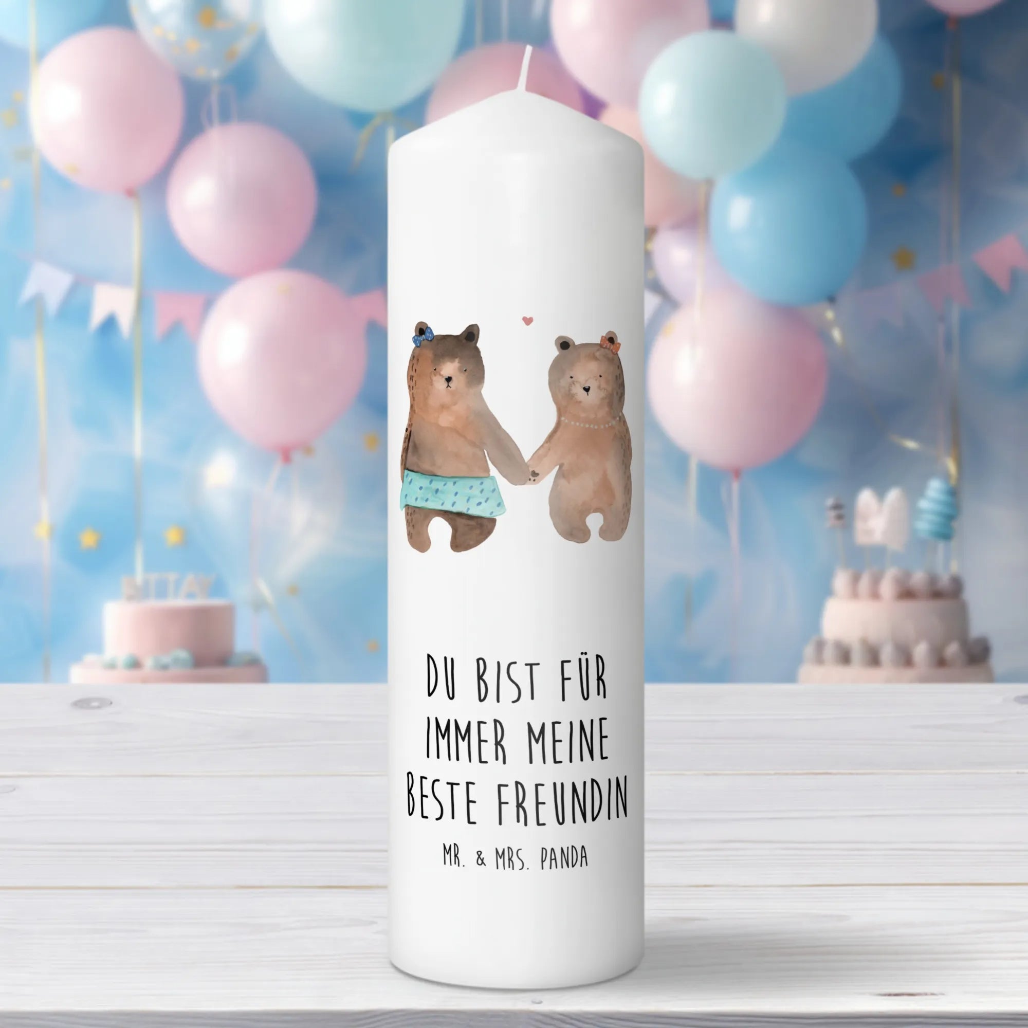 Introducing the charming Bear Friend Candle from the delightful collection by Mr. & Mrs. Panda—a truly unique gift for anyone who holds their friendships dear! This exquisite candle features two adorable teddy bears hand-in-hand, celebrating the bond of friendship without the need for any text. Whether it’s a birthday, a special occasion like a confirmation or baptism, or simply to say ‘I appreciate you,’ this candle radiates warmth and joy, making it an exceptional Taufkerze (baptism candle), Kommunionskerze (Communion candle), or gift for any birthday celebration.