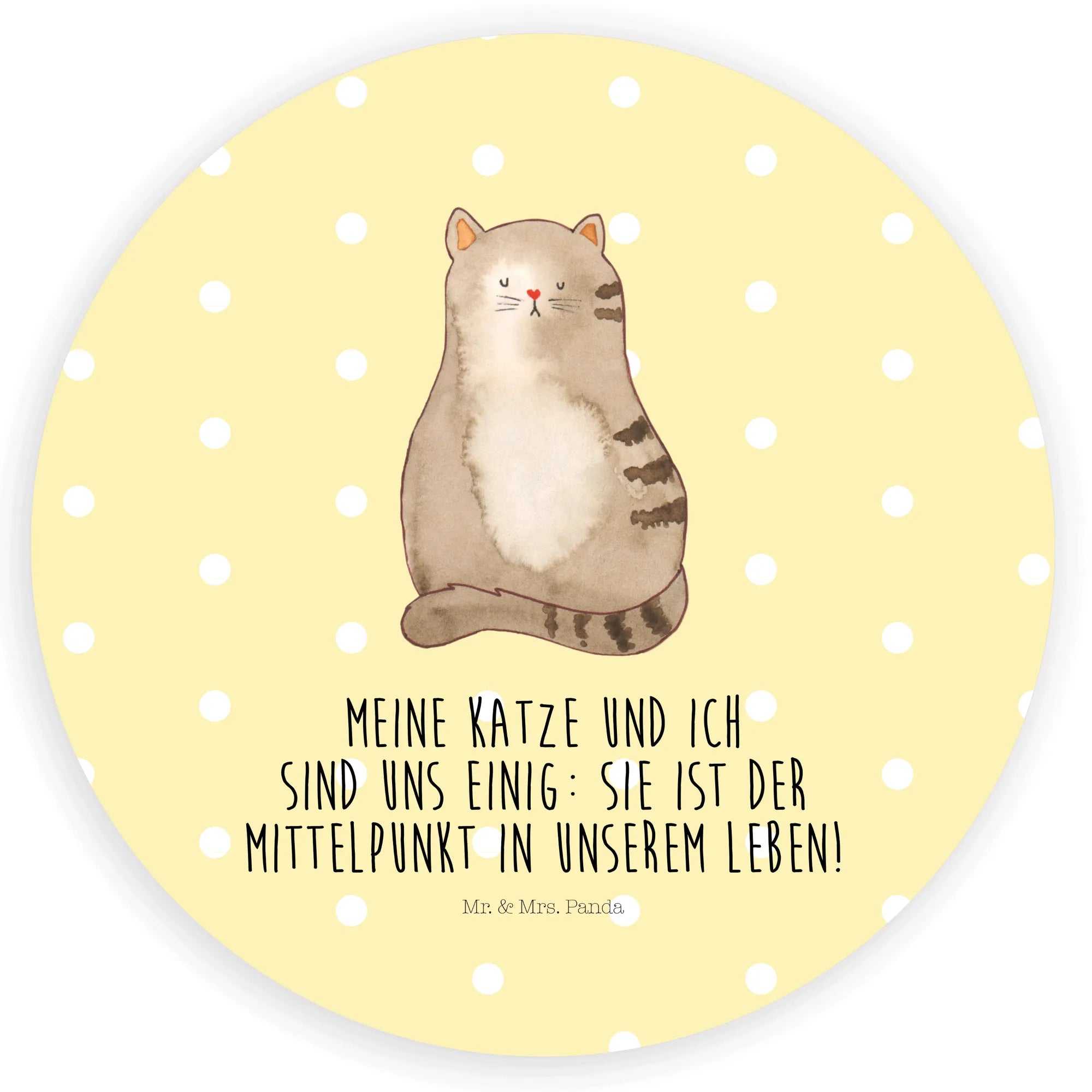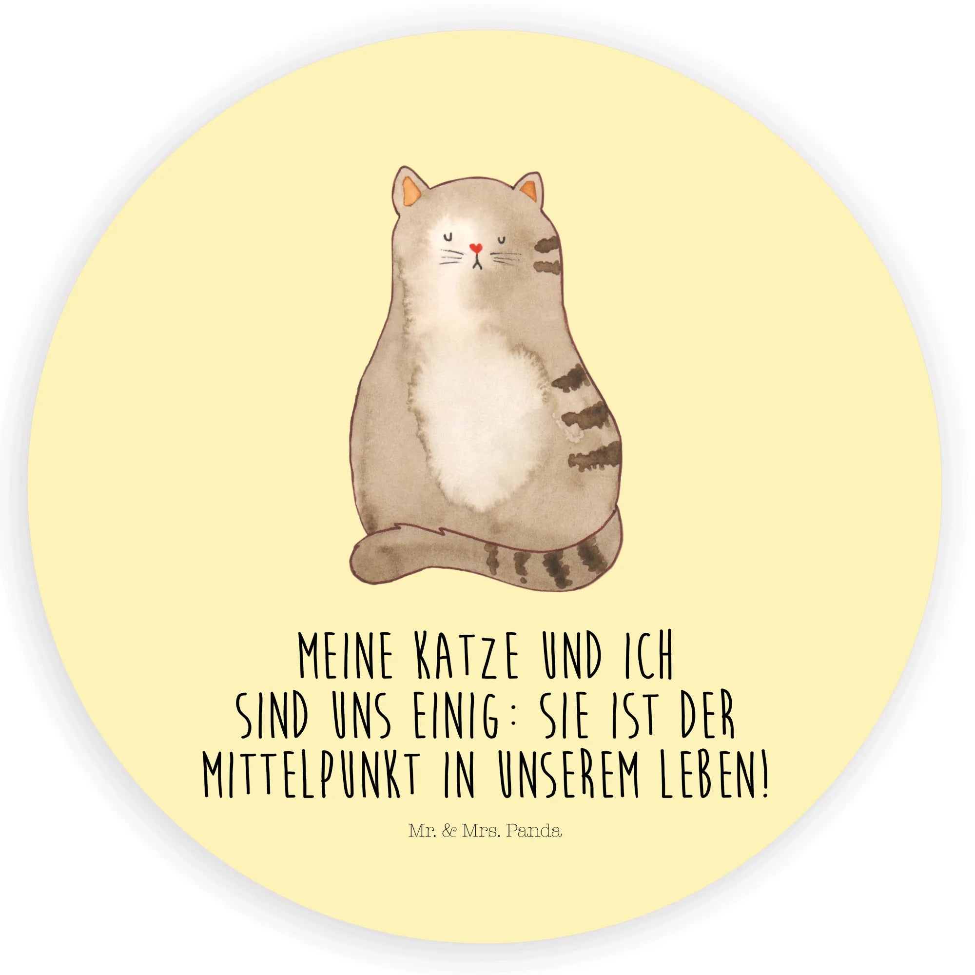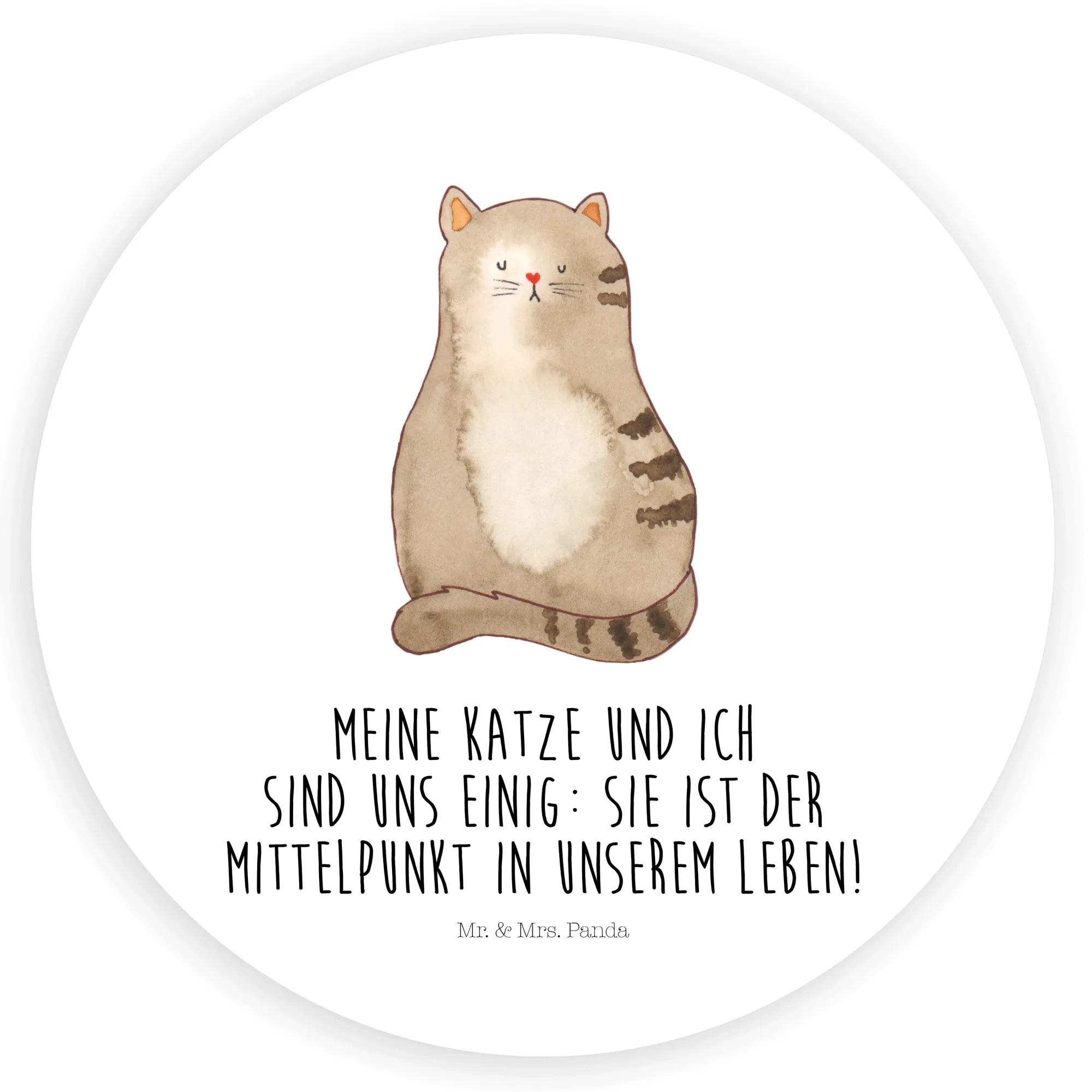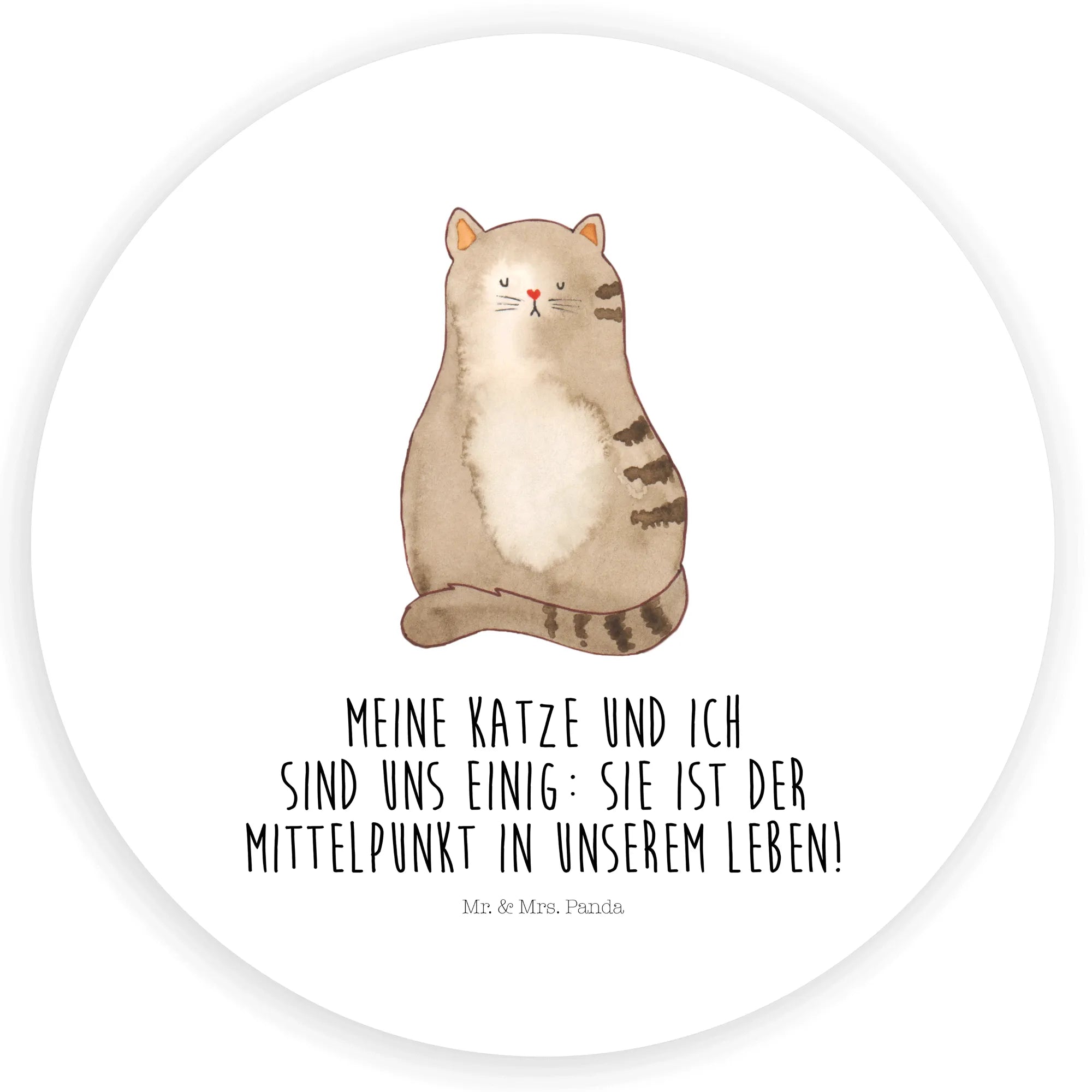 Ein liebevoller Aufkleber aus der Katzen - Kollektion von Mr. & Mrs. Panda: Unsere sitzende Katze, handgezeichnet von Mrs. Panda, kombiniert süßen Charme mit einem frechen Augenzwinkern. Der stimmige Spruch „Meine Katze und ich sind uns einig: sie ist der Mittelpunkt in unserem Leben!“ macht diesen runden Aufkleber zum perfekten Geschenk für echte Katzenfans und Katzenhalterinnen.