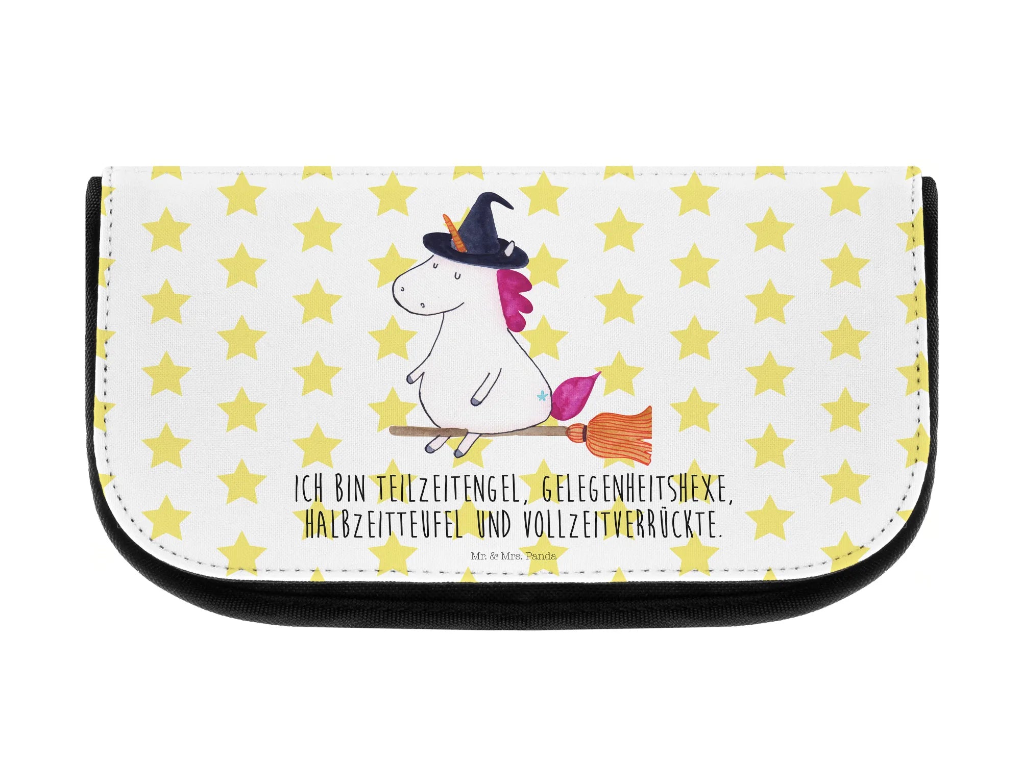 Crafted from high-quality kunstfaser, this cosmetic bag is as durable as it is stylish. It features a stunning depiction of a unicorn riding a broomstick complete with a witch's hat, making it a magical addition to your daily routine. The color palette is not only bright and lively but also uniquely designed, showcasing Mrs. Panda's hand-drawn illustrations that transform an ordinary bag into a unique treasure.