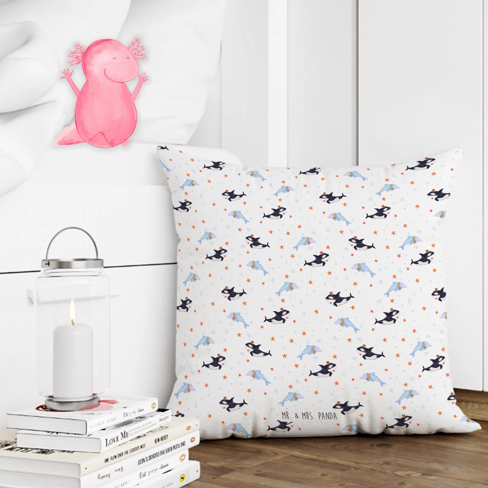 This delightful cushion features a charming illustration of a friendly orca adorned with a dapper cylinder hat, surrounded by a playful underwater setting with a little red fish adding a whimsical touch. Whether you're decorating your bedroom, couch, or even a cozy reading nook, this soft and fluffy cushion brings a cheerful atmosphere into any space.