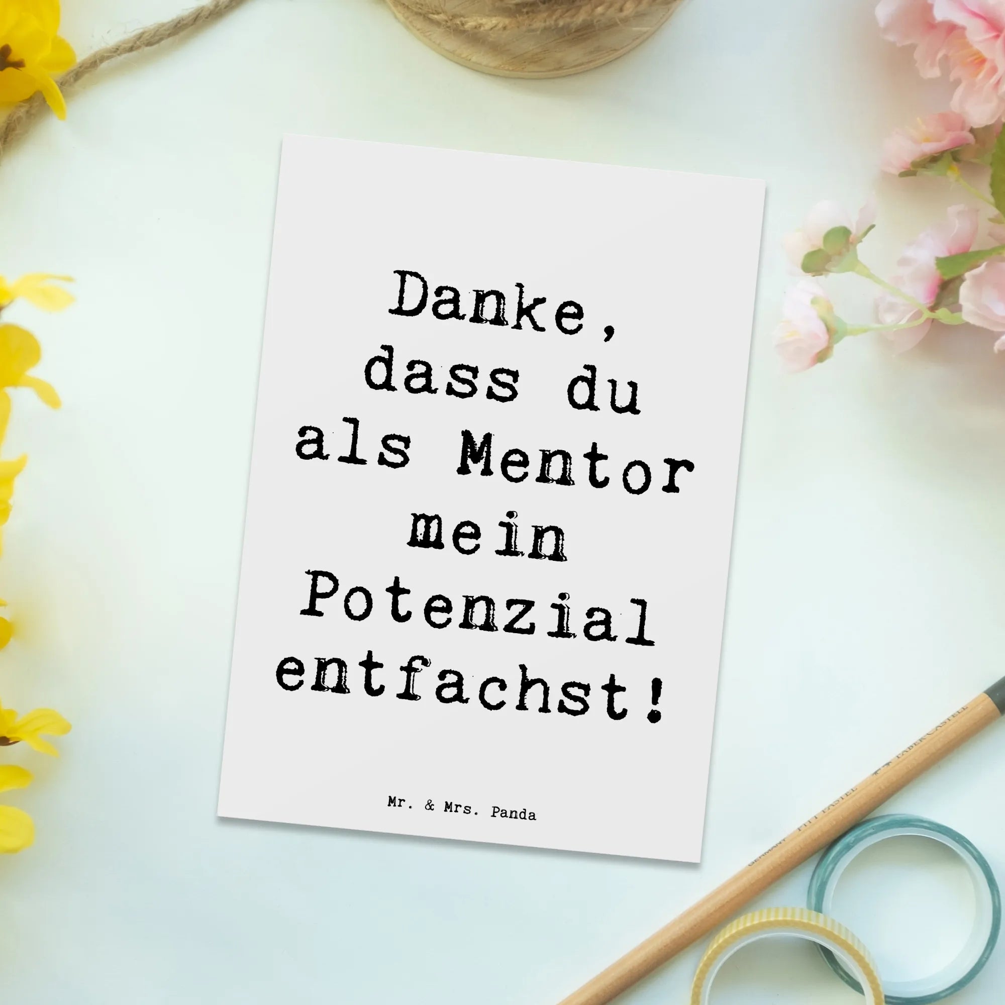 Die Danke-Kollektion von Mr. & Mrs. Panda steht für liebevolle Details und durchdachte Gestaltung. Diese Postkarte ist nicht personalisierbar – das macht sie besonders praktisch: auswählen, persönliche Zeilen ergänzen und fertig. Ideal als Beigabe zu einem Geschenk, als Aufmerksamkeit im Team oder als kleines Dankeschön für interne und externe Mentorinnen und Mentoren.