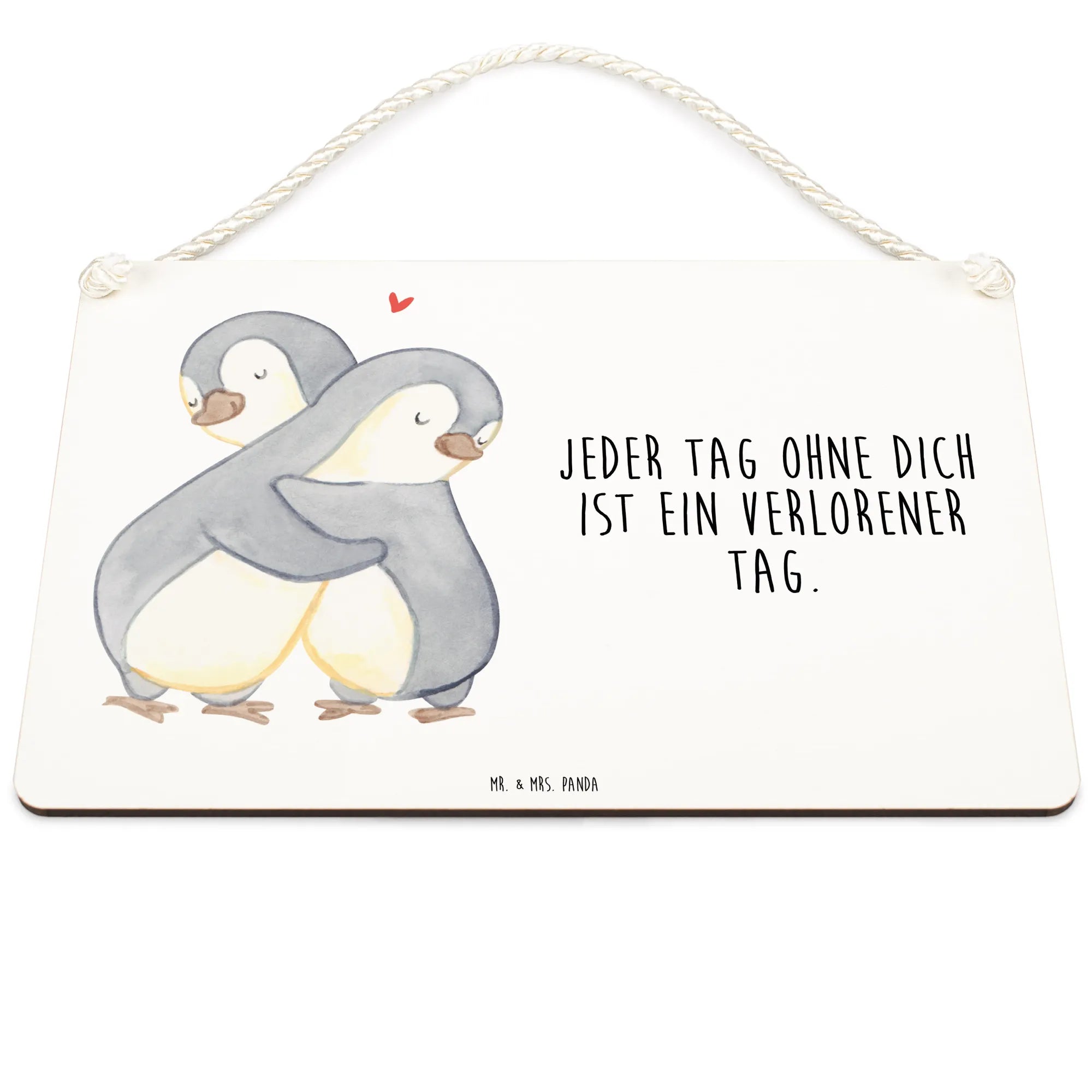 Das wunderschöne Deko Schild "Pinguine Kuscheln" aus der Kollektion Liebe von Mr. & Mrs. Panda ist das perfekte Geschenk für all diejenigen, die ihren Liebsten eine Freude machen möchten! Dieses liebevoll gestaltete Schild zeigt zwei süße Pinguine, die sich zärtlich umarmen und somit die Verbundenheit und die Zuneigung zwischen Partnern symbolisieren. Der Text "Jeder Tag ohne dich ist ein verlorener Tag" spricht das Herz an und eignet sich ideal, um den geliebten Menschen an Valentinstag, Jahrestag oder Hochzeitstag zu überraschen.