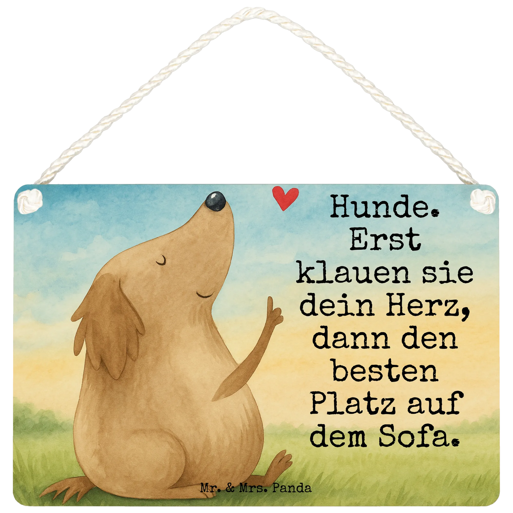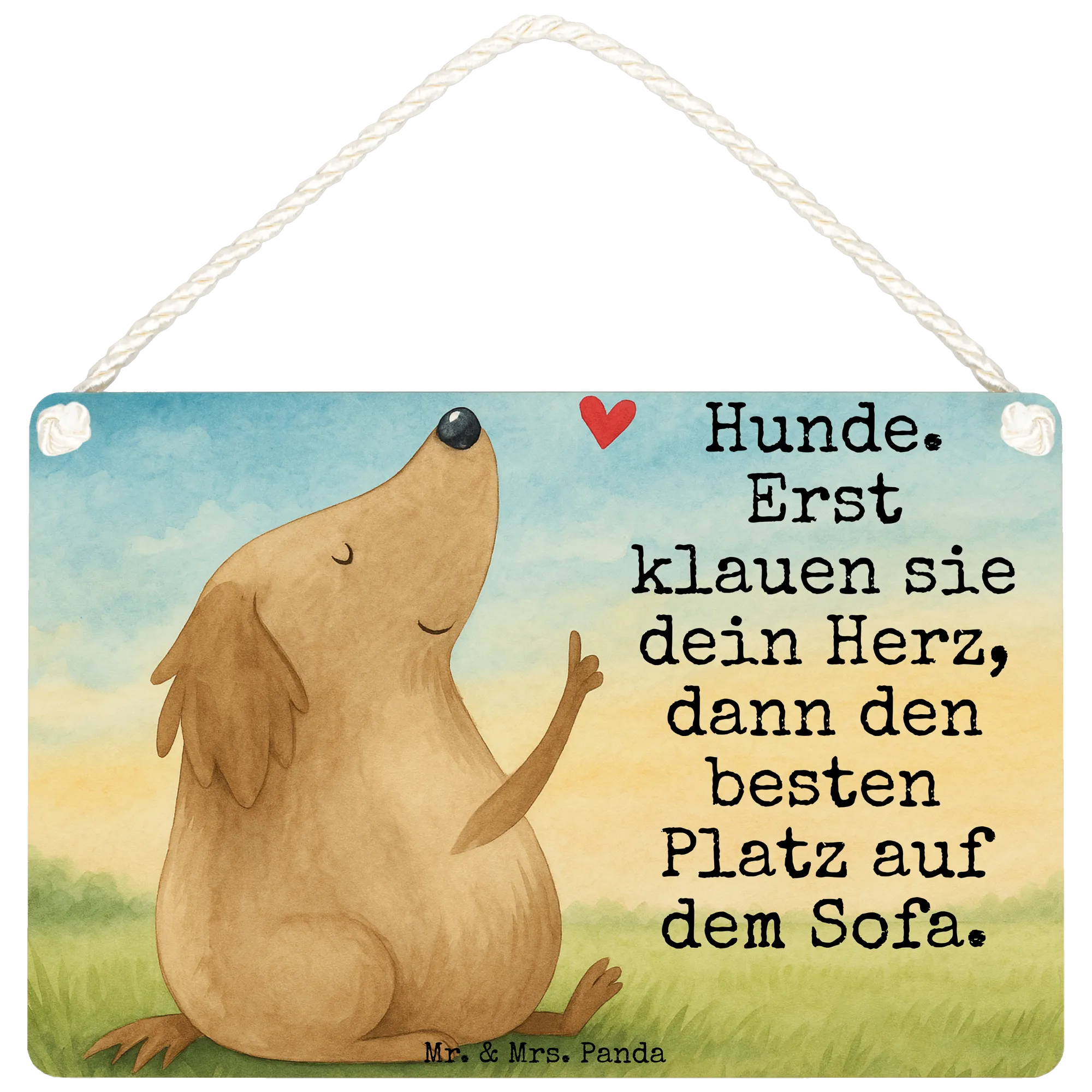 Mr. & Mrs. Panda presents: Unser liebevolles Deko Schild "Hund Liebe" aus der Hunde Kollektion – ein perfektes Geschenk für alle Hundebesitzer und Tierfreunde. Das Motiv zeigt einen fröhlichen Hund, der ein kleines Herz zeigt, kombiniert mit dem herzlichen Spruch „Hunde. Erst klauen sie dein Herz, dann den besten Platz auf dem Sofa.“ Dieses Schild bringt sofort Wärme und Humor in jeden Raum.