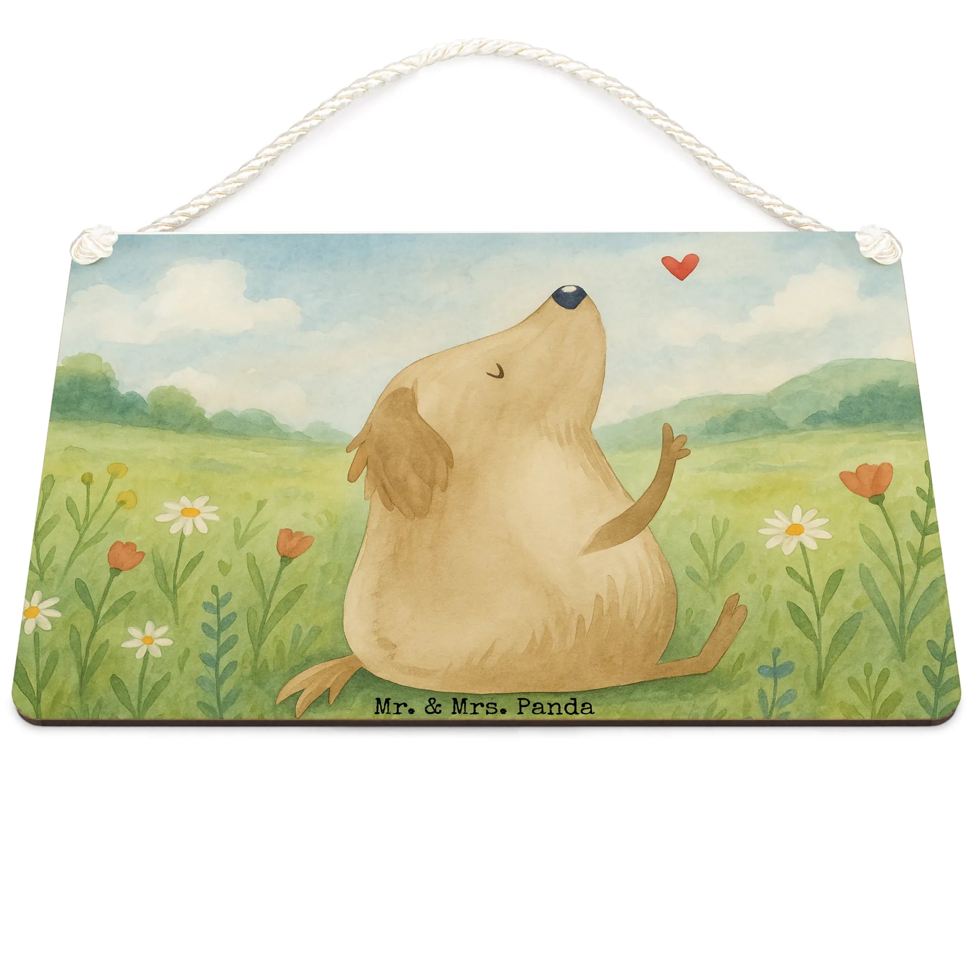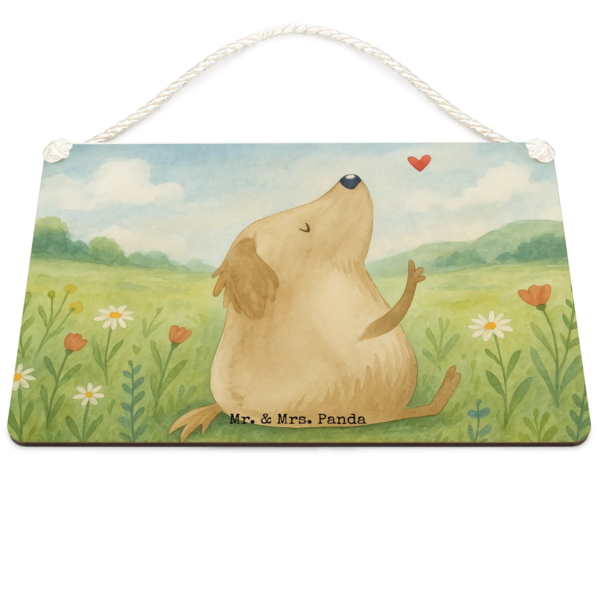 Das handgezeichnete Aquarellmotiv von Mrs. Panda wirkt frisch und freundlich auf dem hellen, weißen Hintergrund. Dadurch kommen die Farben und der Spruch besonders schön zur Geltung. Ob als Türschild, Holzschild für die Wand oder als Küchenschild – dieses Dekoschild passt überall, wo Hundeglück sichtbar werden soll.