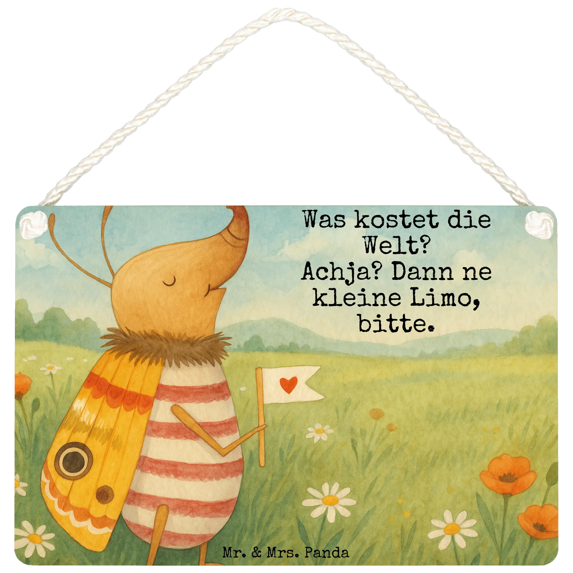 In einer Welt, in der alles möglich scheint, bringt uns ein winziger, vergnügter Nachtfalter zurück zur Einfachheit mit einem herzerwärmenden Motiv. Der Käfer, fröhlich ein Herz auf seiner Fahne tragend, vermittelt eine Botschaft von unbeschwerter Freude und Optimismus. 'Was kostet die Welt? Achja? Dann ne kleine Limo, bitte.' – dieser Spruch lässt uns schmunzeln und gibt uns die Erlaubnis, uns über die kleinen Dinge im Leben zu freuen. Es ist eine humorvolle Erinnerung daran, dass Glück nicht immer teuer oder schwer zu finden ist. Manchmal ist es so einfach wie eine kleine Erfrischung, eine Limo. Dieses Motiv ist perfekt, um jedem Raum eine verspielte und zugleich niedliche Note zu verleihen. Mr. & Mrs. Panda haben es wieder geschafft, alltägliche Weisheit mit einer Prise Spaß zu verbinden.