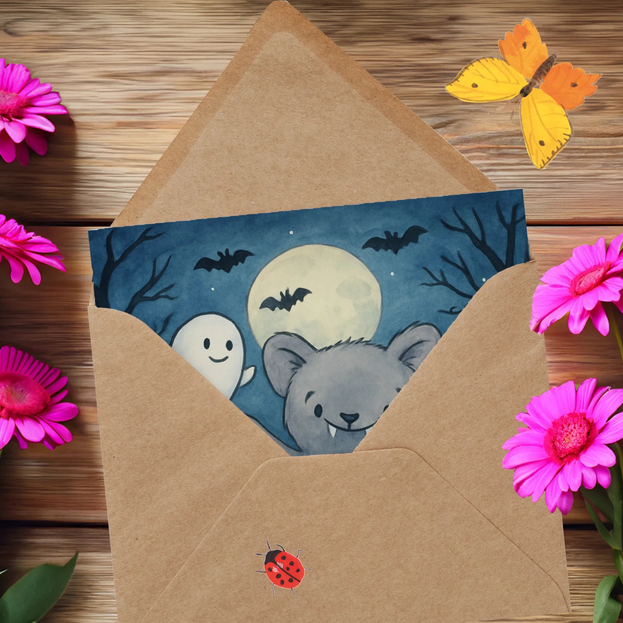 Meet our delightful Dracula Bat, the cutest little creature you'll ever encounter during Halloween! This quirky bat, complete with a friendly smile and adorable tiny fangs, is not your average spooky specter. Surrounded by a playful ghost, a whimsical little skull, and a candle dripping with wax, this scene captures the fun and joy of the Halloween season. It's all about celebrating coziness amidst the chills, as our bat sends out warm vibes instead of frightful ones. Whether you're looking for a fun decoration or a sweet gift to brighten someone's day, this motif certainly adds a sprinkle of magic. It's perfect for creating an atmosphere of playful spookiness that even the littlest ones will adore. Bring home this delightful charm, and let this Dracula Bat remind you of the joy and laughter that Halloween can truly bring!