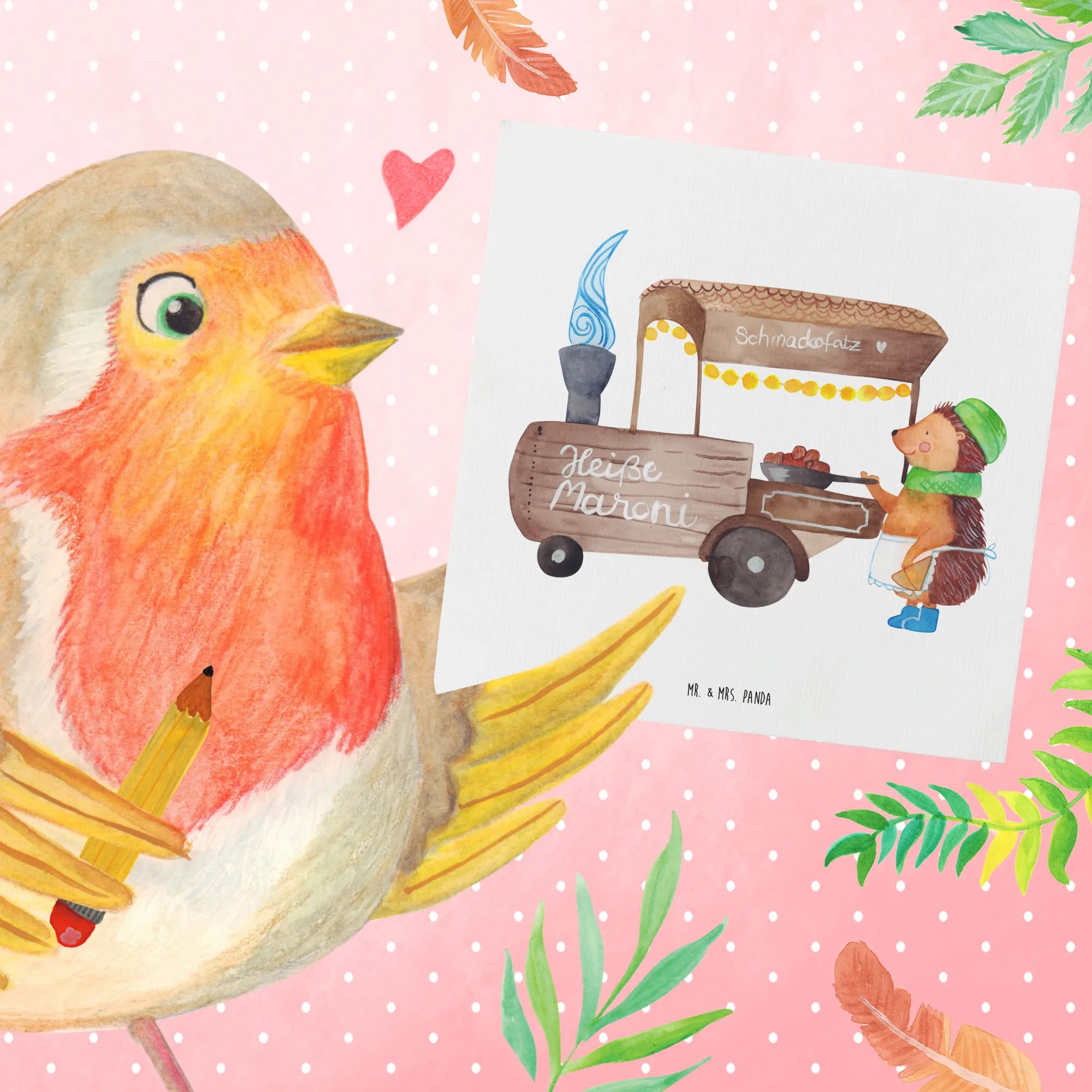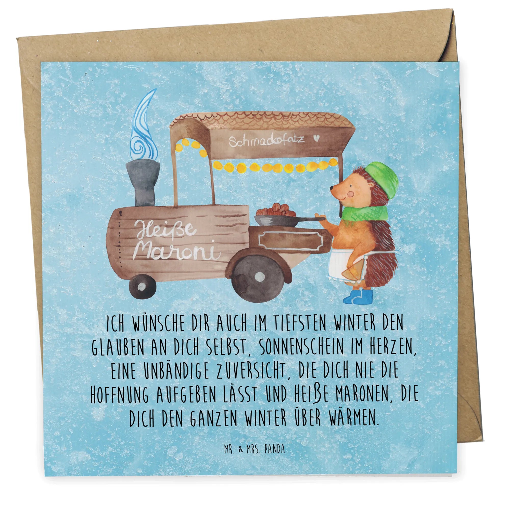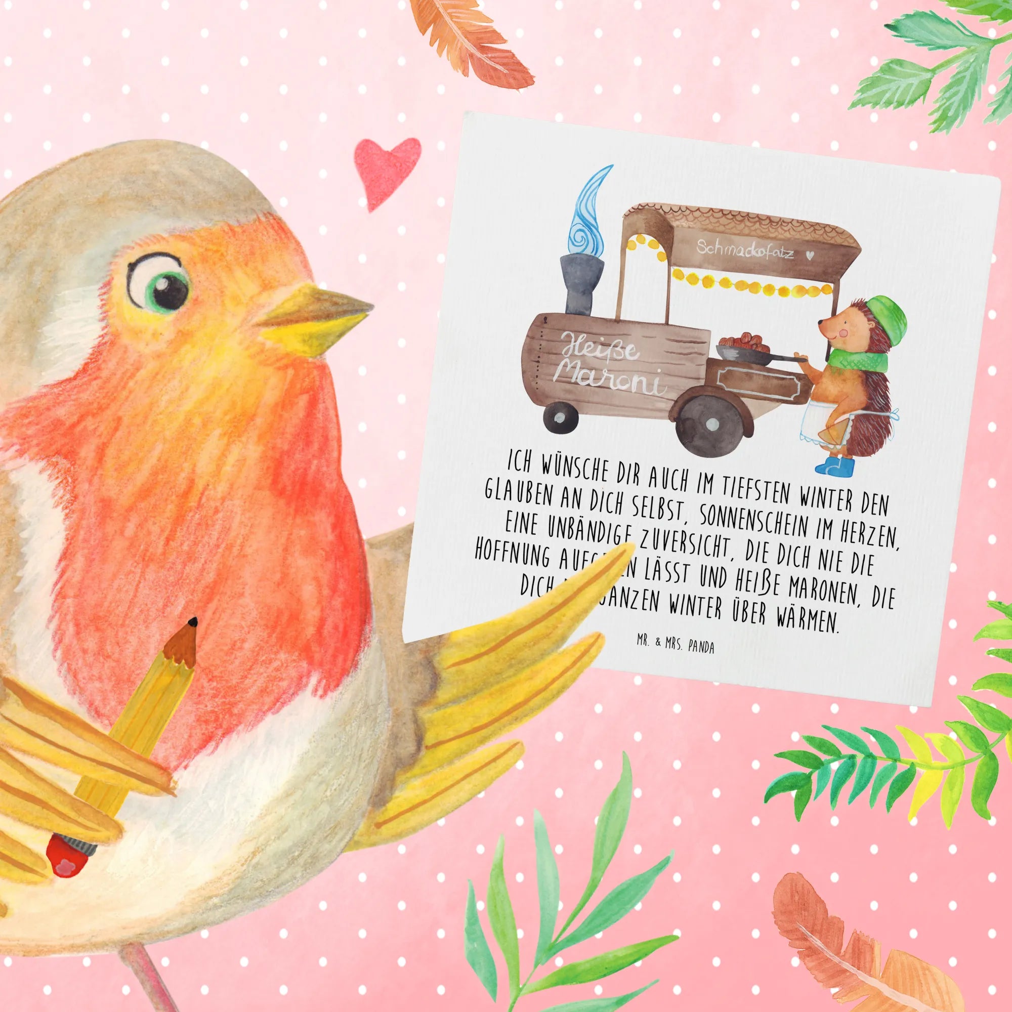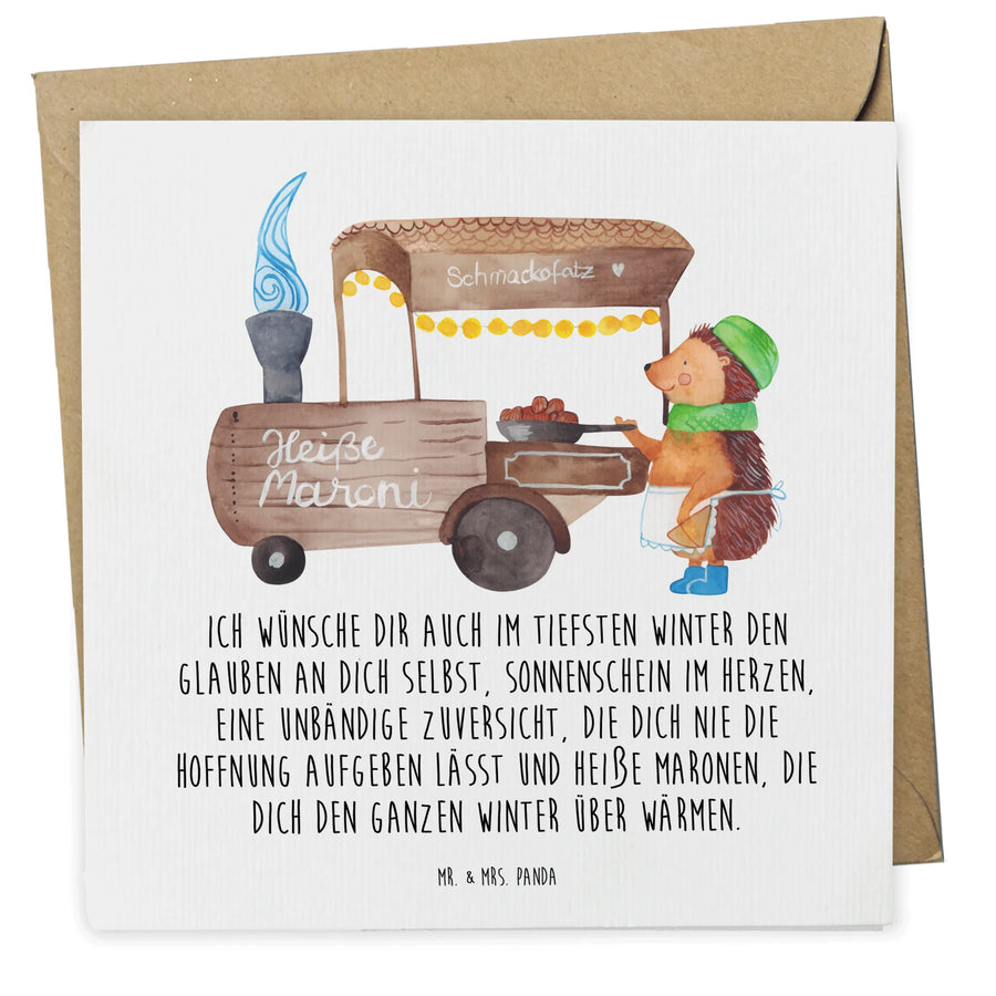 Imagine the delight on your loved one's face as they receive a card adorned with the sweet image of a little hedgehog, donned in blue boots and a fashionable green scarf, cheerfully standing beside his 'Heißer Maroni' cart. This whimsical design instantly captures the essence of winter delights—the roasted chestnuts, the fresh scent of snowy air, and the warmth of holiday gatherings. For anyone looking to send their best wishes this holiday season, this card is a charming, loving way to do it.