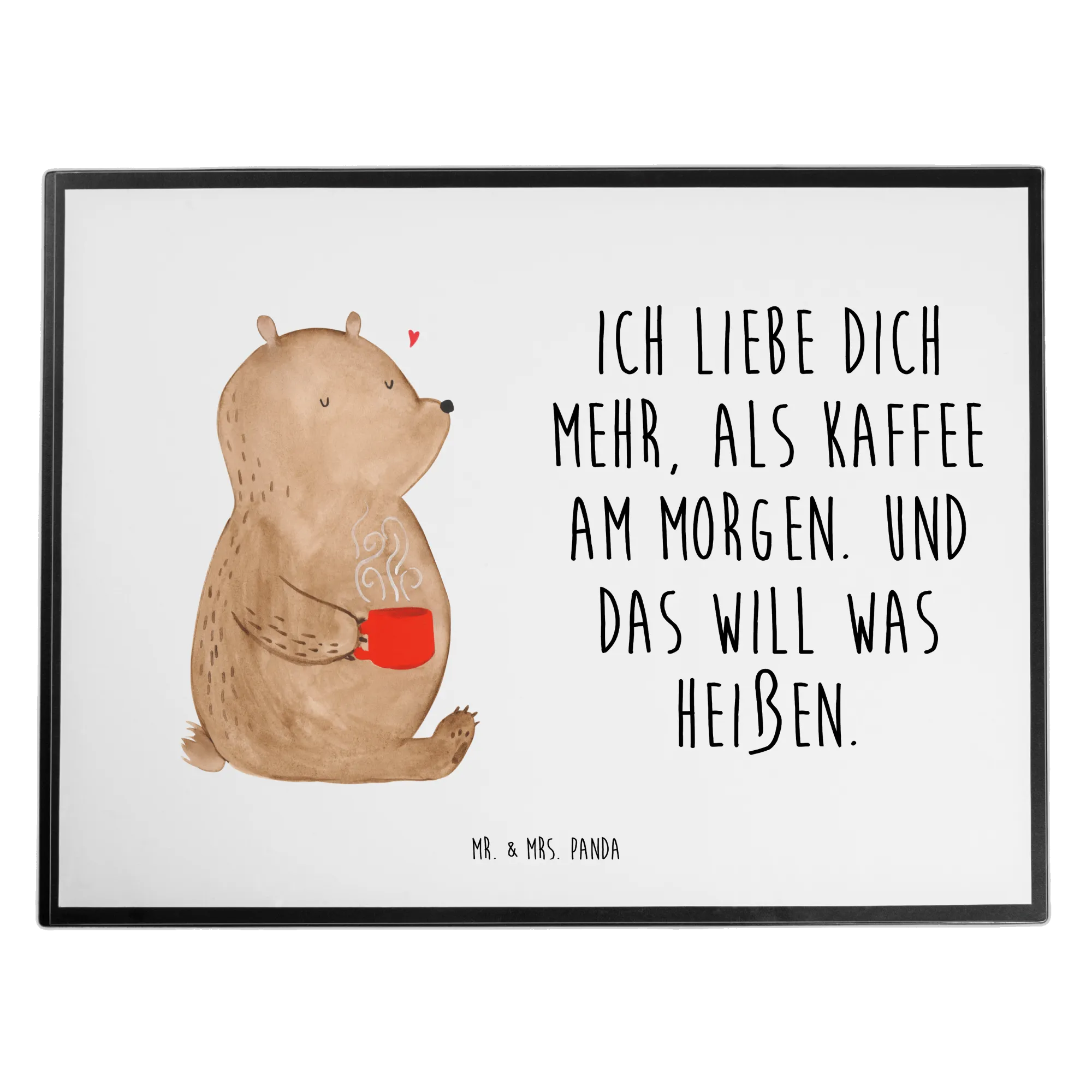 Imagine a cozy morning where a joyful bear savors a steaming cup from his bright red mug, completely at ease. Above him, a little red heart floats, echoing his feelings of love. This charming motif perfectly captures the essence of comfort, affection, and the small joys in life. The saying, 'Ich liebe dich mehr, als Kaffee am Morgen. Und das will was heißen,' is a delightful reminder that love can be as invigorating as your first sip of coffee. Whether you're gifting it to your partner on Valentine's Day or celebrating an anniversary, this motif embodies a token of love that goes beyond words. It's about those moments where love and simplicity intertwine, creating memories that warm the heart as much as a cup of morning brew.