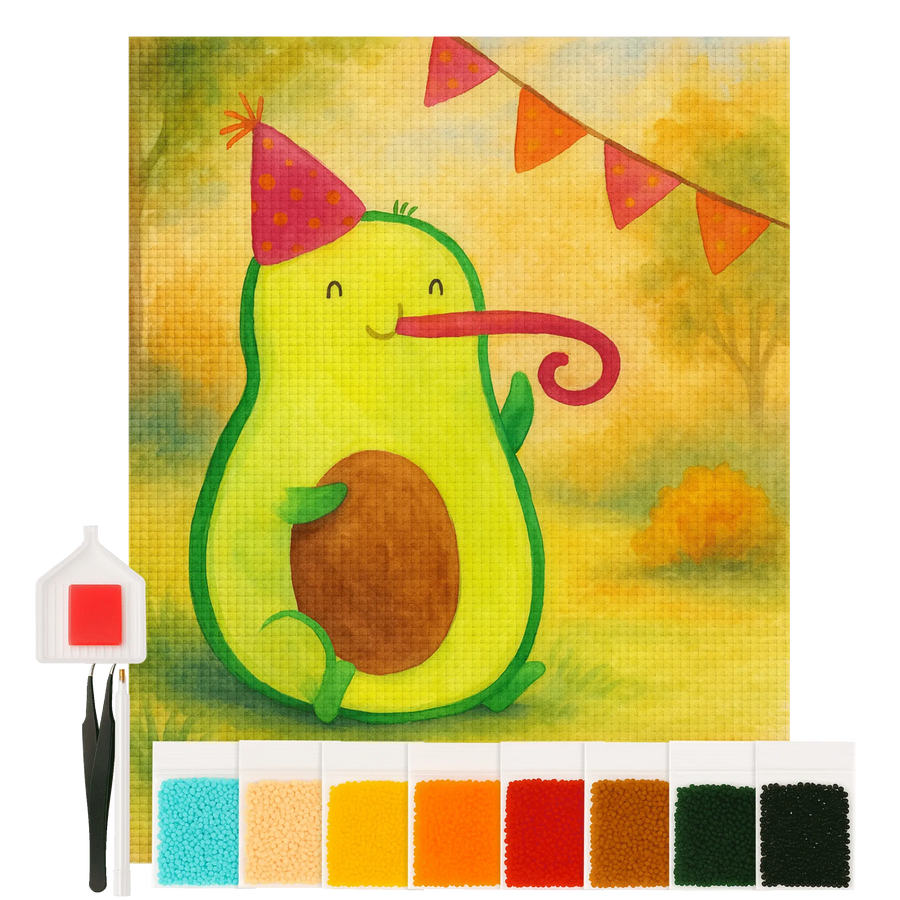 Here comes the cutest avocado you've ever seen, wearing a party hat and blowing into a party horn, ready to kick off some serious celebration! This joyful motif is all about bringing people together and celebrating life. Whether it's a birthday party or just a casual hangout, this avocado knows how to add a spark of joy to your festivities. Its colorful design brightens any room, inviting laughter and cheers. This little fruit is a reminder to let loose and enjoy life's sweetest moments. Embrace the joy that comes with gathering friends and family—this avocado is here to inspire you to party hard and cherish every smile. With its playful essence, it's not just a decoration; it’s a symbol of happiness and connection. So don your party hat and get ready for good times!
