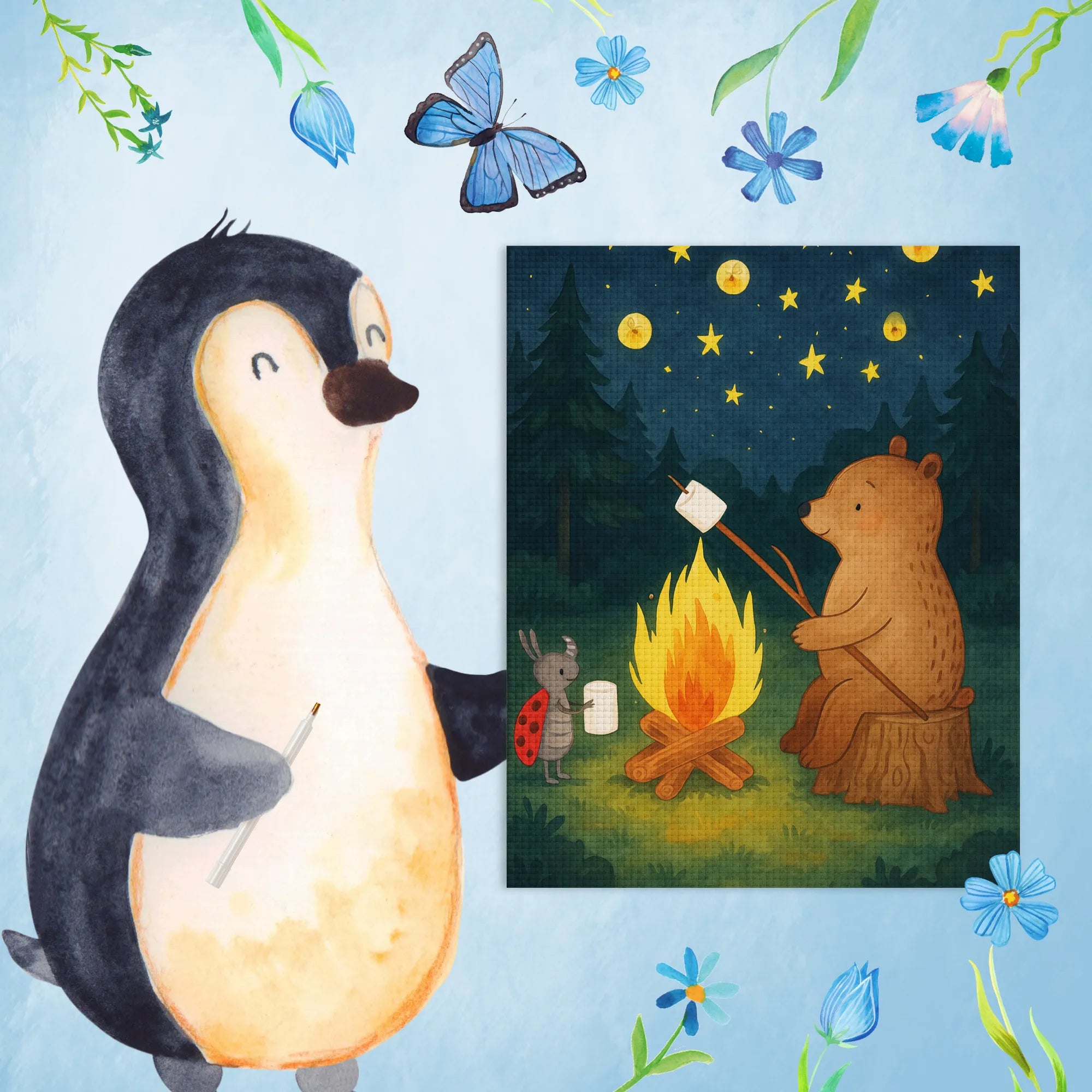 Stell dir vor, es ist eine magische Nacht, in der ein fröhlicher Bär und ein kleiner Marienkäfer gemütlich am Lagerfeuer sitzen. Der Bär ist ganz in seinen Elementen, während er auf einem umgedrehten Baumstumpf Platz genommen hat und mit einem Stock ein Marshmallow über die sanften Flammen hält. Der Marienkäfer, voller Schalk und Freude, lehnt sich an einen Eimer und bewundert die leuchtenden Sterne am Himmel. Die stimmungsvolle Szenerie wird von kleinen Feuerfliegen begleitet, die um das Lagerfeuer tanzen und dem Ganzen einen Hauch von Märchenhaftigkeit verleihen. Es ist der perfekte Moment, um eine Geschichte zu erzählen und die süßen Klänge der Natur zu genießen, während die Nacht ihren Zauber entfaltet. Ein Bild, das nicht nur das Herz erwärmt, sondern auch die Seele berührt und zum Träumen anregt.
