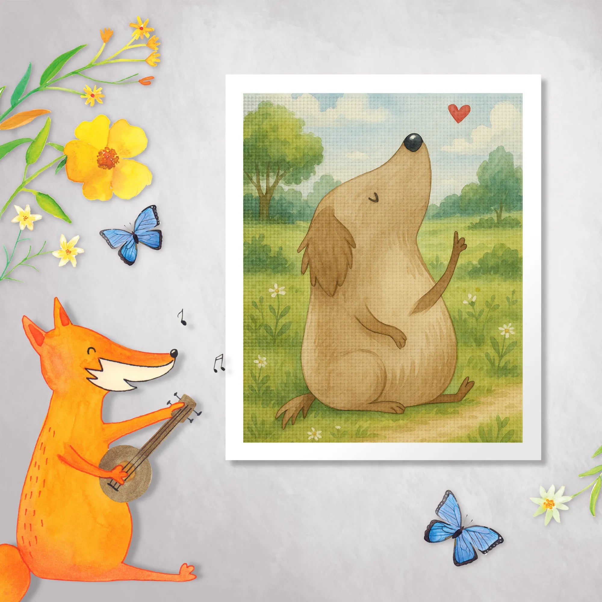 Picture a little pup with big, soulful eyes, eagerly waiting for a belly rub or a playful game of fetch. This motif perfectly encapsulates dog love—a celebration of those joyful moments we share with our furry companions. Each time you look at this art, you remember the wagging tails, the excited barks, and those sweet moments of connection. It’s not just about a pet; it's about friendship and loyalty, wrapped up in a warm, furry package. As a dog owner, you experience a unique brand of happiness that only a faithful companion can provide. The motif showcases not just a dog, but a symbol of joy, comfort, and the unwavering love that fills our hearts. It’s like capturing a snapshot of a beautiful day spent with your best friend, reminding you to cherish those spontaneous moments. Hang this piece in your space and let it fill your world with a dash of warmth and a reflection of that pure, dog happiness that every dog lover knows so well.