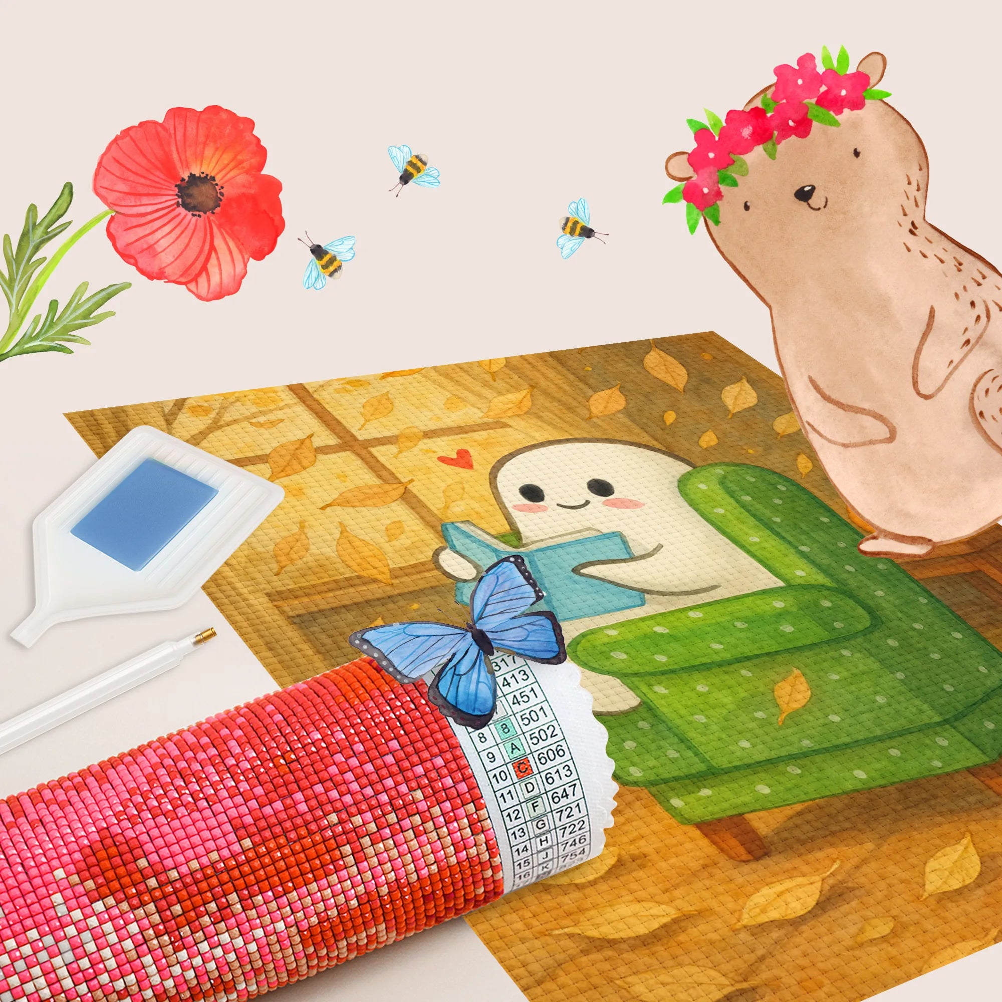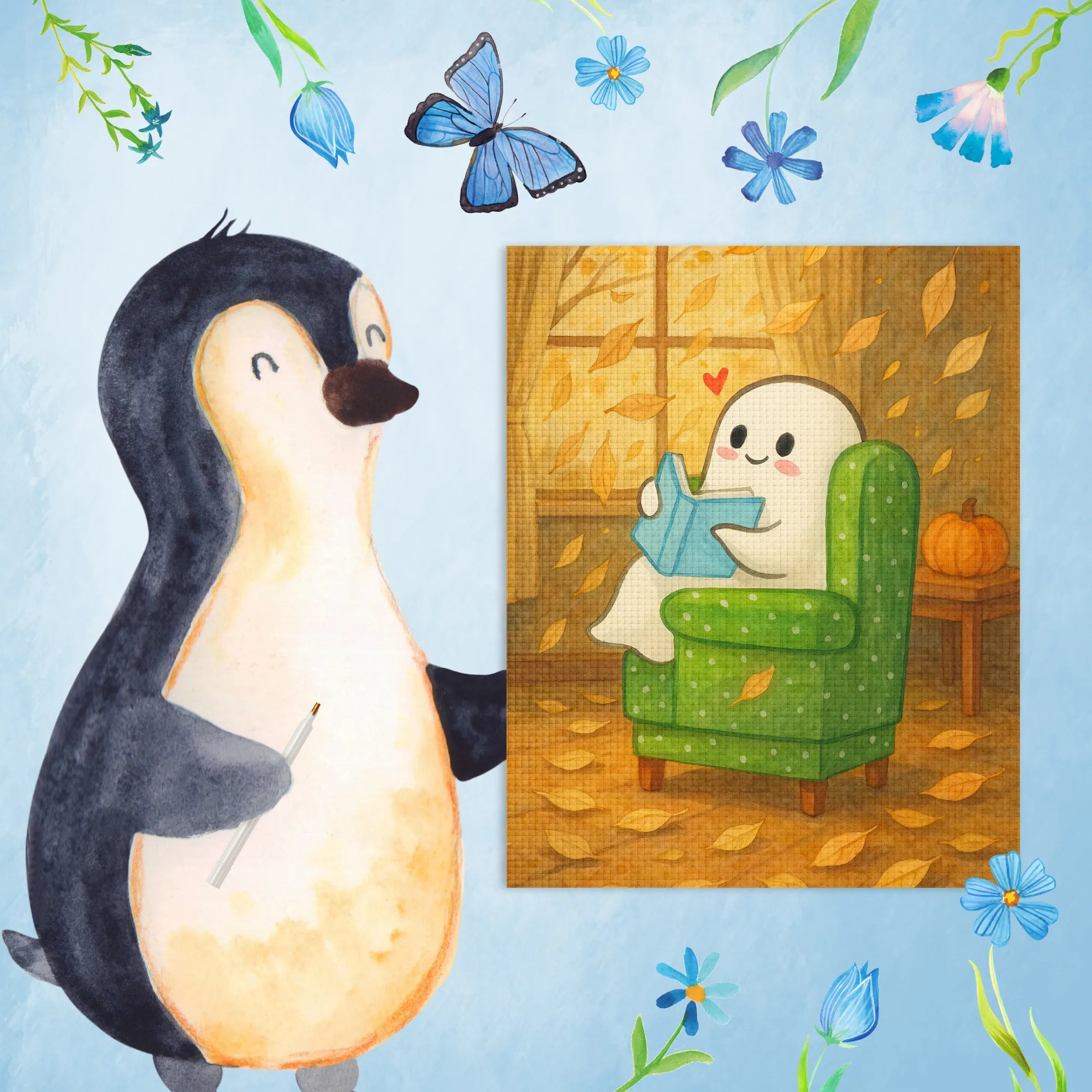 Möchtest du einen ruhigen Herbstnachmittag verbringen? Unser süßes Gespenst macht genau das: In seinem gemütlichen grünen Sessel liest es in einem blauen Buch und genießt die friedliche Ausstrahlung des Moments. Die beliebten Herbstblätter schweben um es herum und ein kleines rotes Herz schwebt darüber – eine schöne Kombination aus Freude und Geborgenheit. Mit seinem glücklichen Lächeln und den rosigen Wangen bringt das Gespenst die perfekte Stimmung für entspannende Lesestunden. Lass dich von der einzigartigen Atmosphäre inspirieren und hole dir dein eigenes herbstliches Lesevergnügen. In der liebevollen Umarmung dieser Szene kannst du die Schönheit der goldenen Jahreszeit voll und ganz genießen und das Glück in den kleinen Dingen finden.