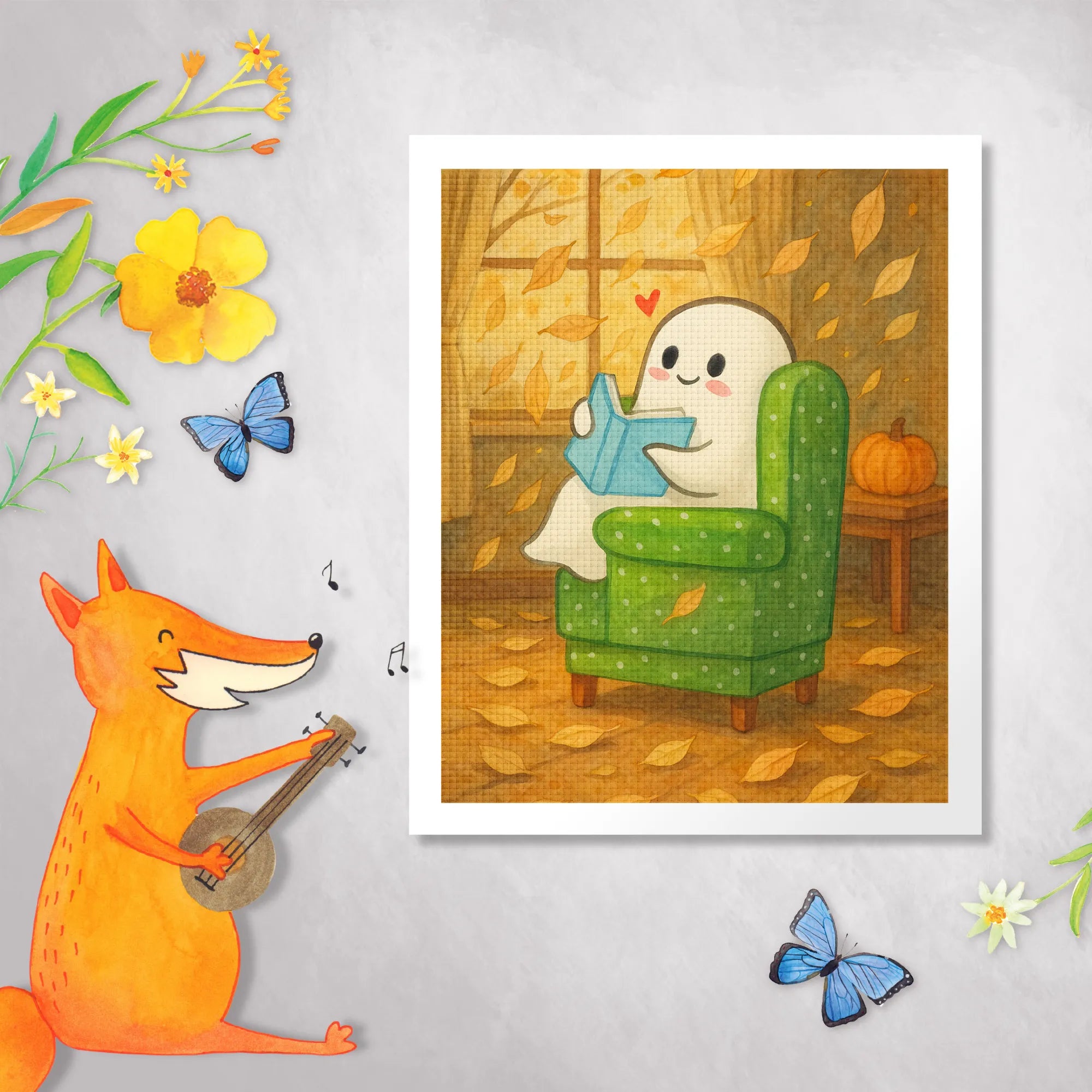 Curling up in a cozy spot with a captivating book sounds like the ideal way to welcome the autumn vibes. Add a cheerful ghost into the mix, and you’ve got a scene that warms the heart! Picture this adorable ghost lounging in a plush green armchair, blissfully turning the pages of a blue book with its sweet smile and rosy cheeks lighting up the room. With colorful leaves gently swirling around, it feels like a celebration of the season—a reminder that stories can transcend beyond the ordinary. So, let’s invite this friendly ghost into our lives, sparking joy and companionship as we cozy up with our own autumn tales. What magic will you discover this fall?