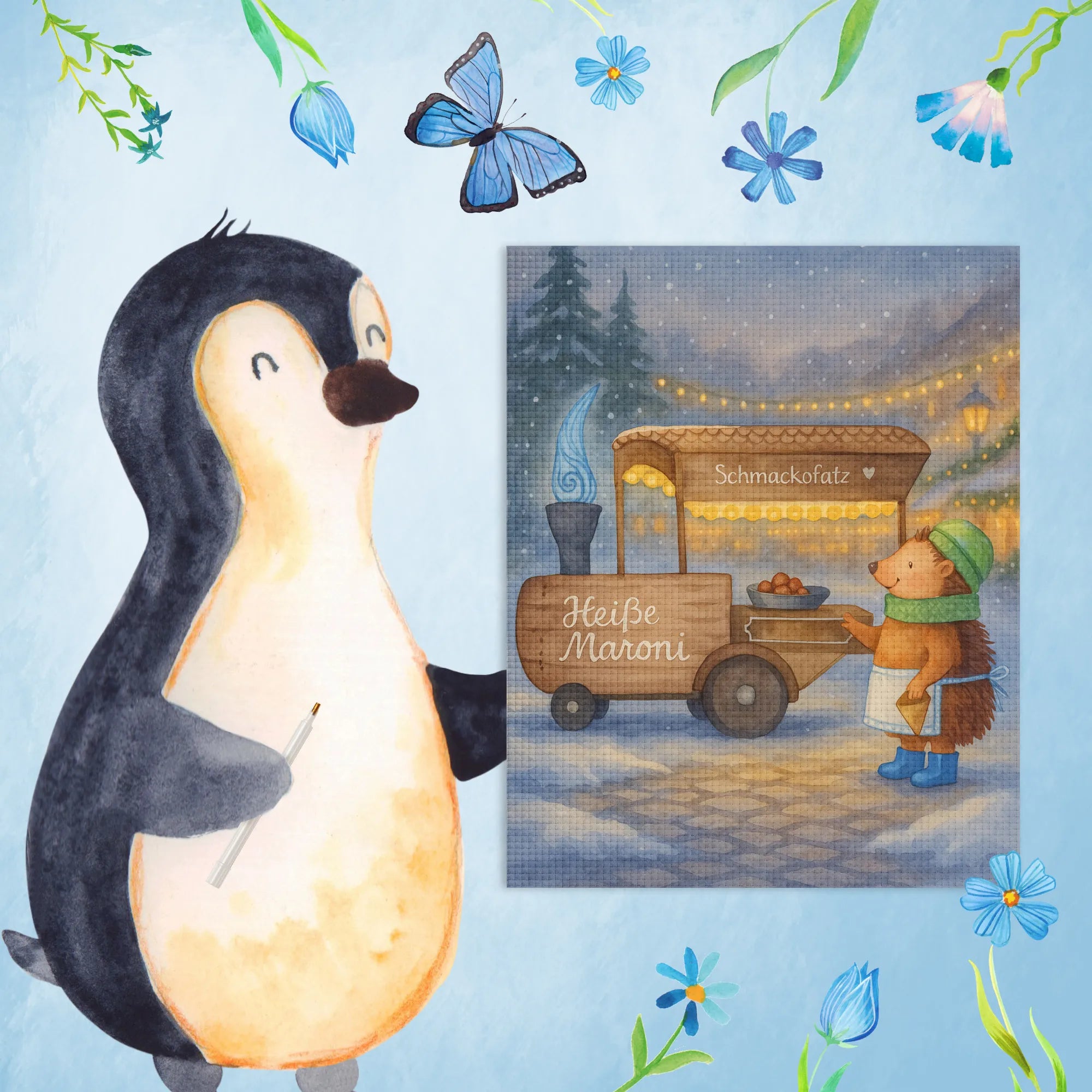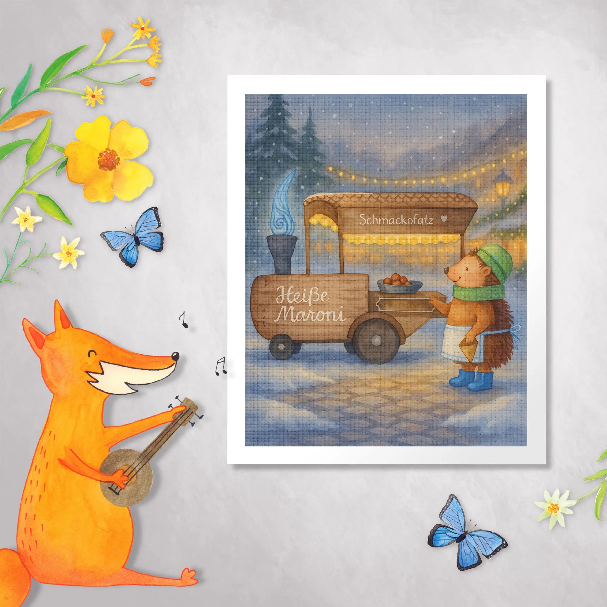 Picture a delightful scene at a Weihnachtsmarkt where our little hedgehog sells the most delicious hot chestnuts. The aroma of roasted Maronen fills the crisp winter air, enticing passersby to stop and relish in the season's charm. With every chestnut he offers, he spreads warmth and joy, making people smile as they gather around to share stories and laughter. This adorable motif captures those moments of connection and nostalgia, reminding us that the joy of the holidays is found in simple pleasures. Let this charming hedgehog inspire you to take a moment, savor the beauty of winter, and cherish the company of friends and family as you warm your hearts with the essence of roasted chestnuts.