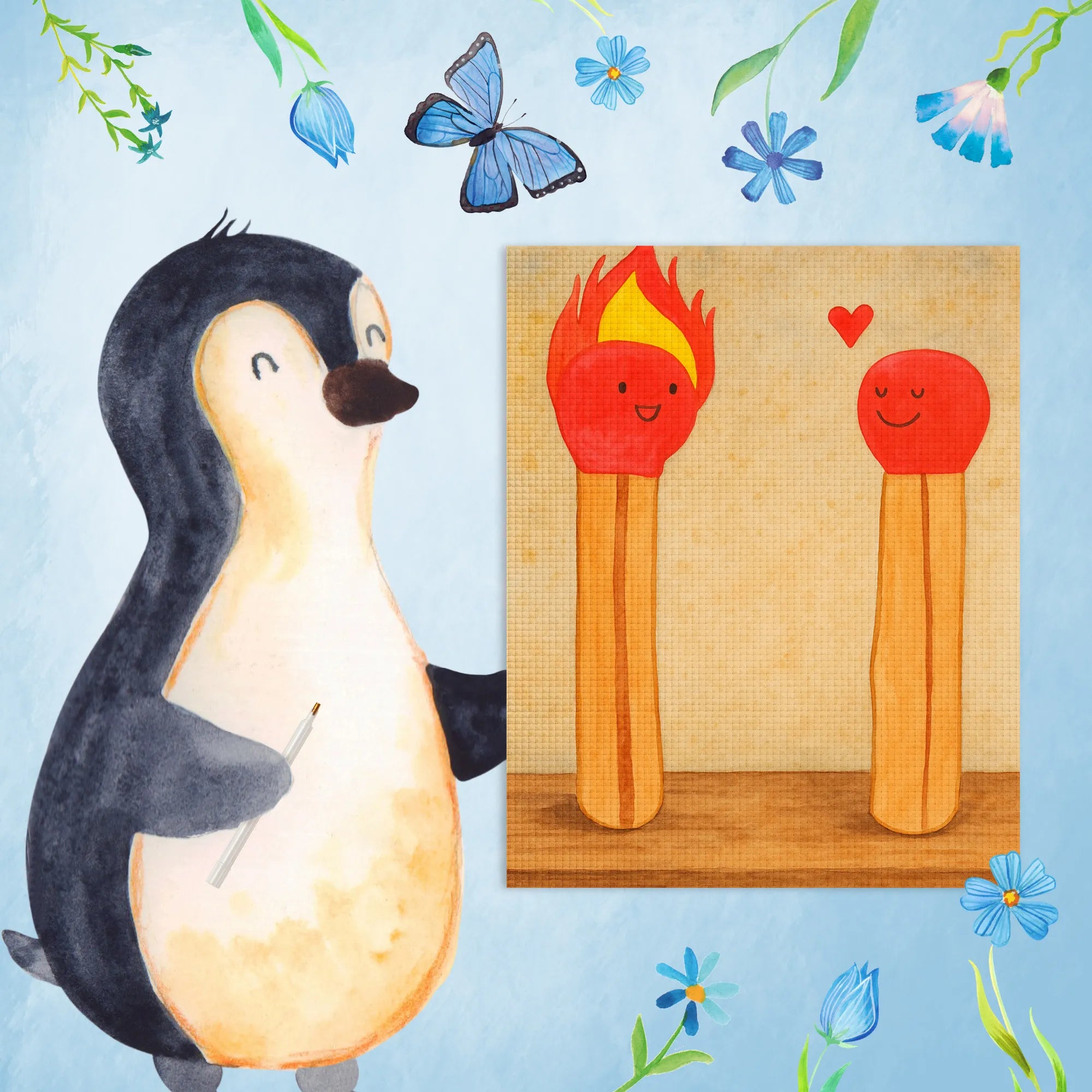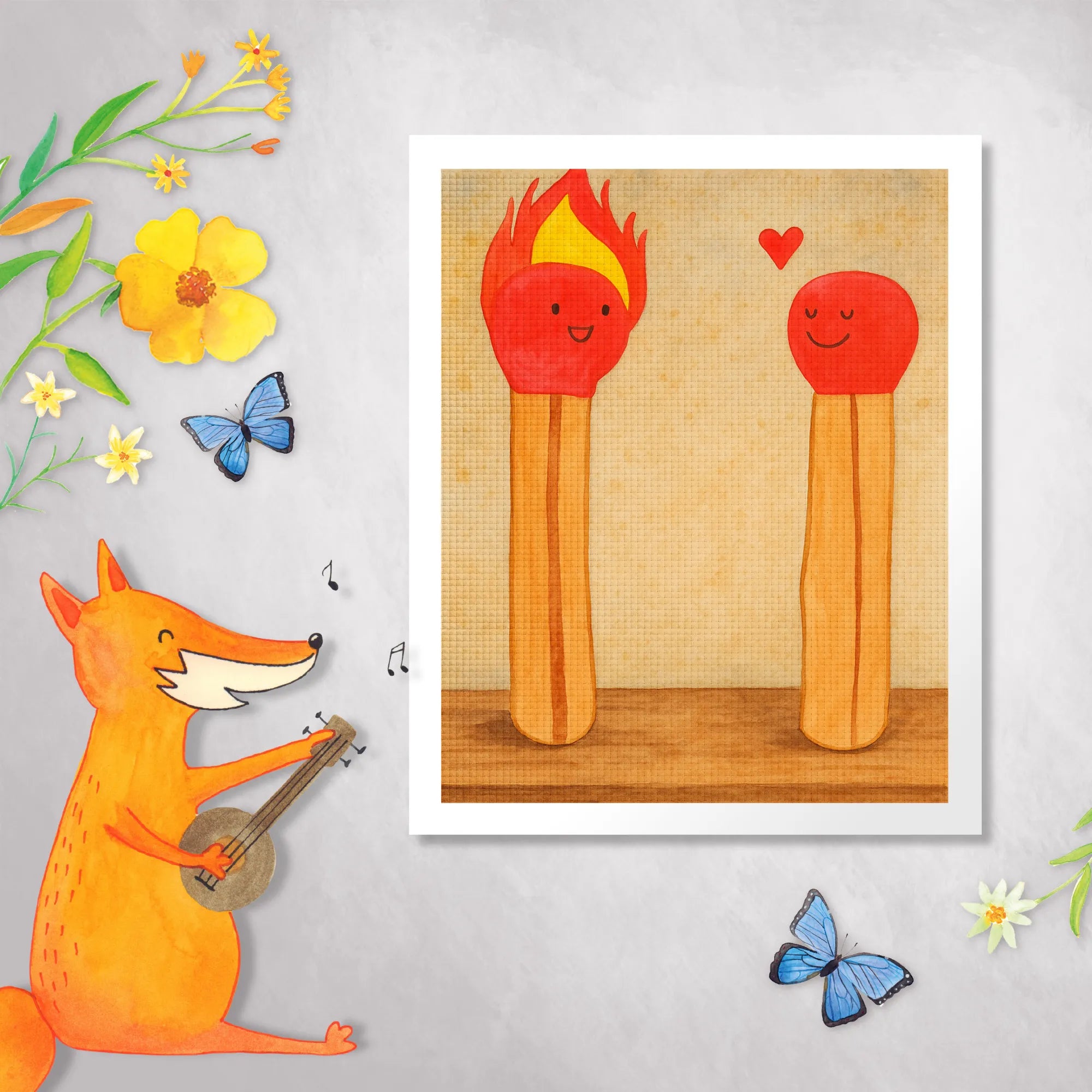 In diesem liebevollen Motiv strahlen zwei Streichhölzer pure Freude aus. Das linke Streichholz, das mit seinen gelben Flammen brennt, symbolisiert das Feuer der Leidenschaft und die Fähigkeit, Wärme zu verbreiten. Es hat ein fröhliches Gesicht, das jeden Raum erhellt. Das rechte Streichholz strahlt ebenfalls Glück aus, auch wenn es nicht brennt. Sein bildschönes Lächeln und die funkelnden Augen zeigen, dass es voller positiver Energie ist. Zwischen den beiden leuchtet ein kleines Herz als Zeichen ihrer tiefen Freundschaft. Gemeinsam erinnern uns diese Streichhölzer daran, wie wichtig ein warmherziger Austausch zwischen Freunden ist und wie sich Freude verbreitet, ganz egal, ob man brennt oder einfach nur strahlt.