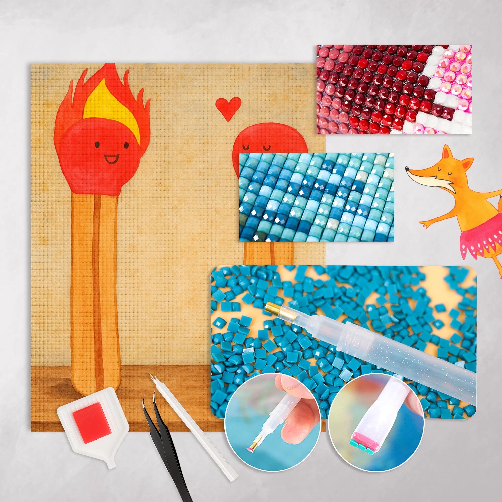 - Complete Set: Canvas (self-adhesive), colored resin diamonds (square), pen, wax, sorting tray & instructions