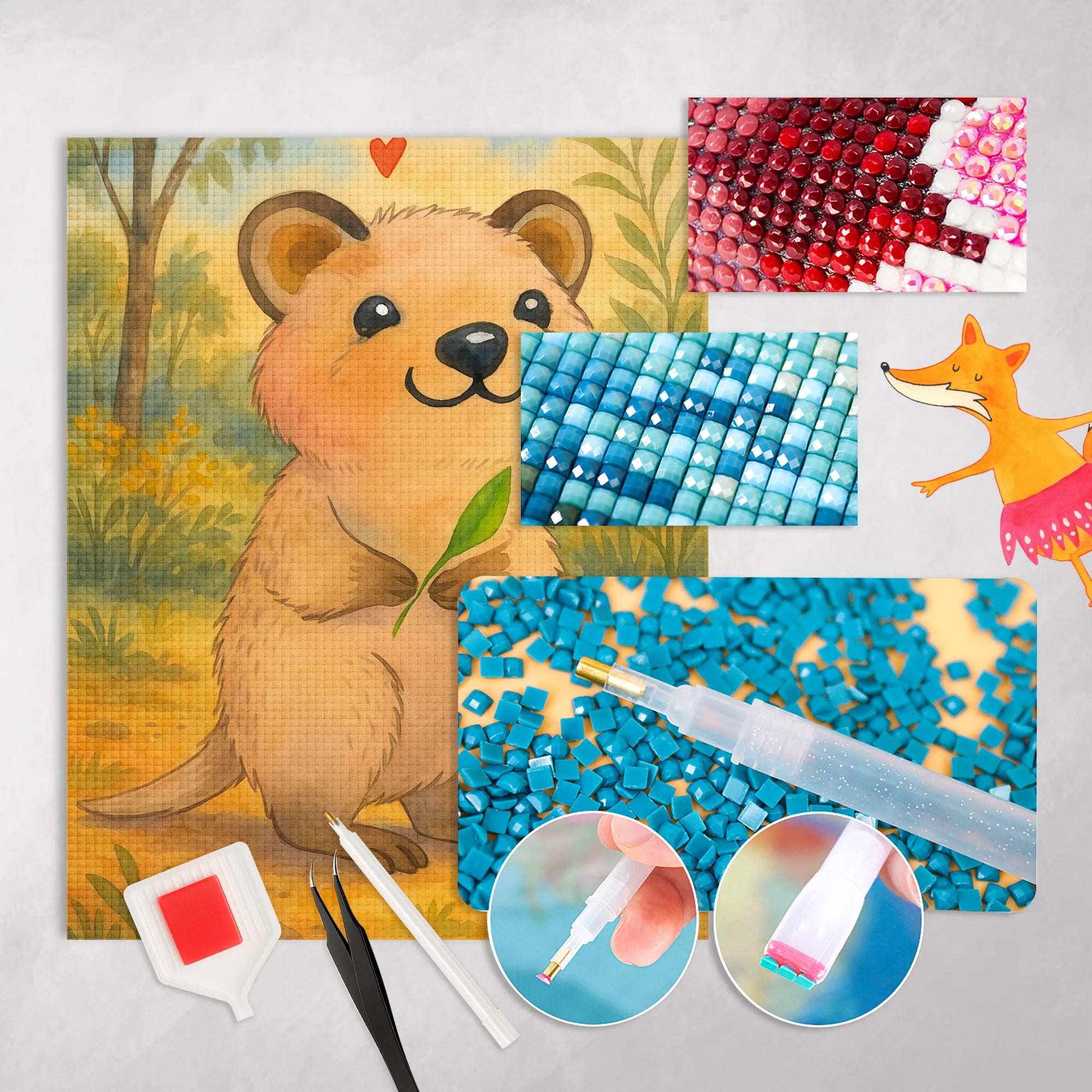 - Complete Set: Canvas (self-adhesive), colored resin diamonds (square), pen, wax, sorting tray & instructions