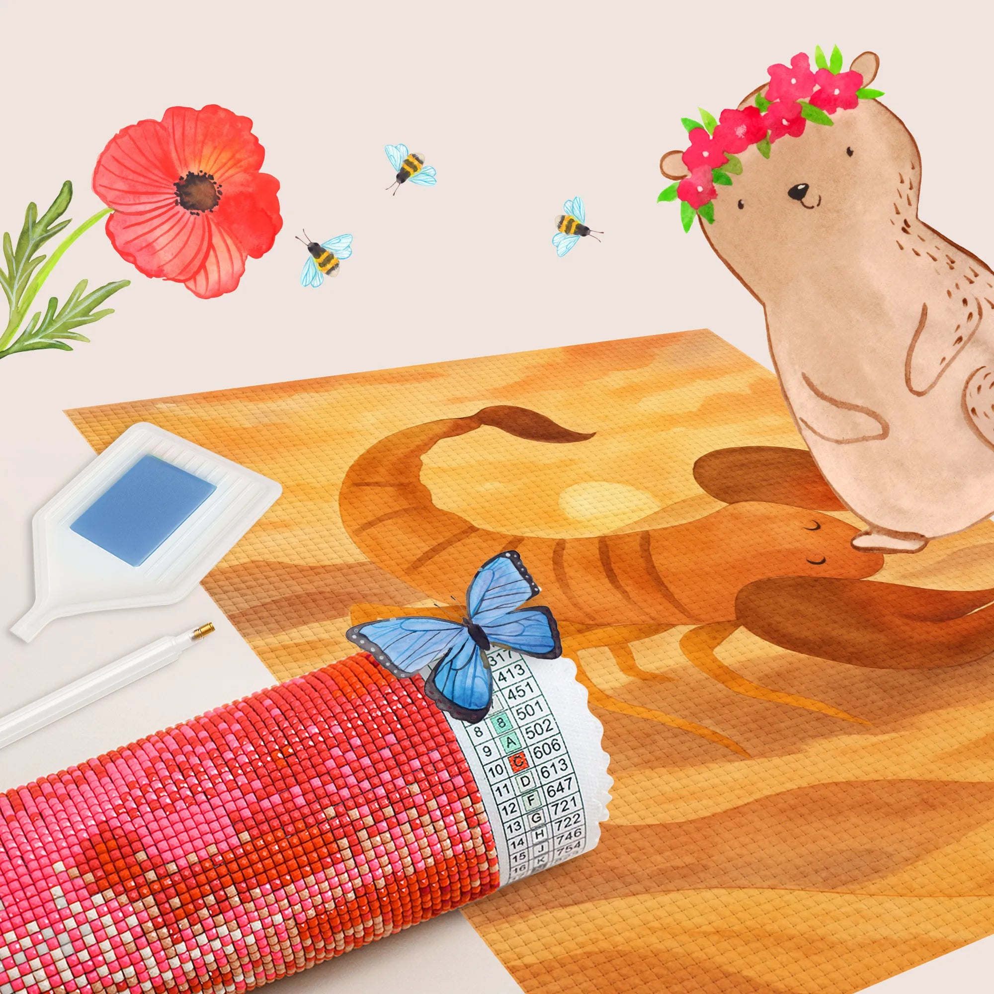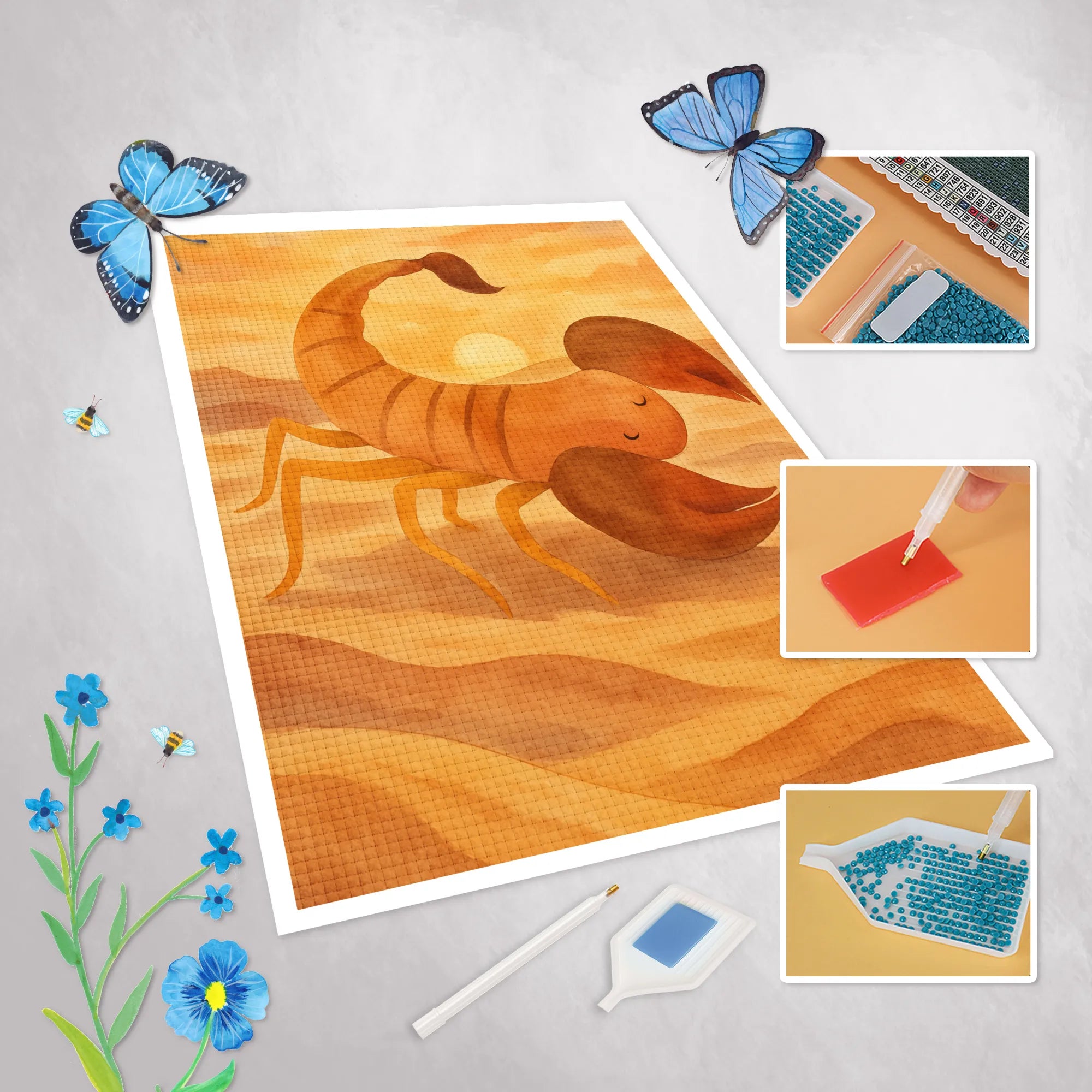 - Complete Set: Canvas (self-adhesive), colored resin diamonds (square), pen, wax, sorting tray & instructions