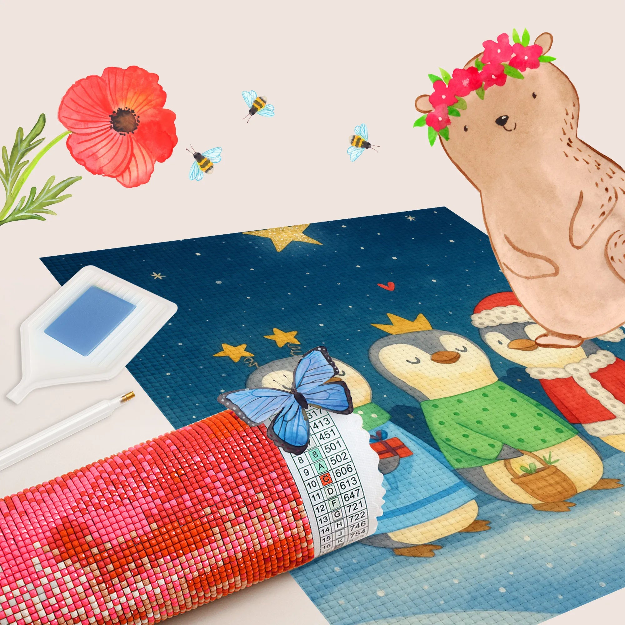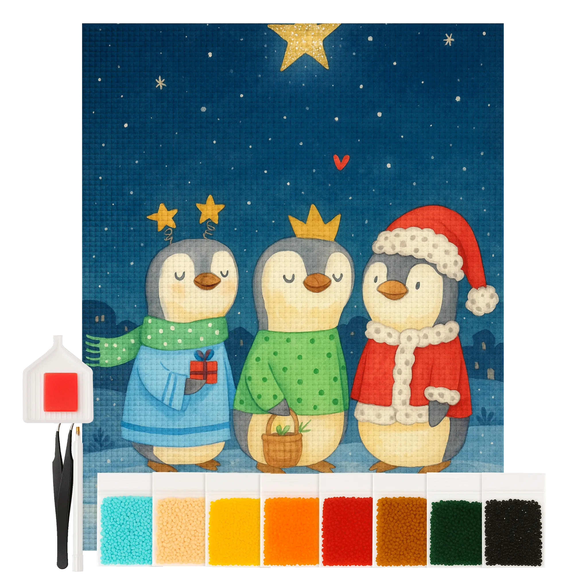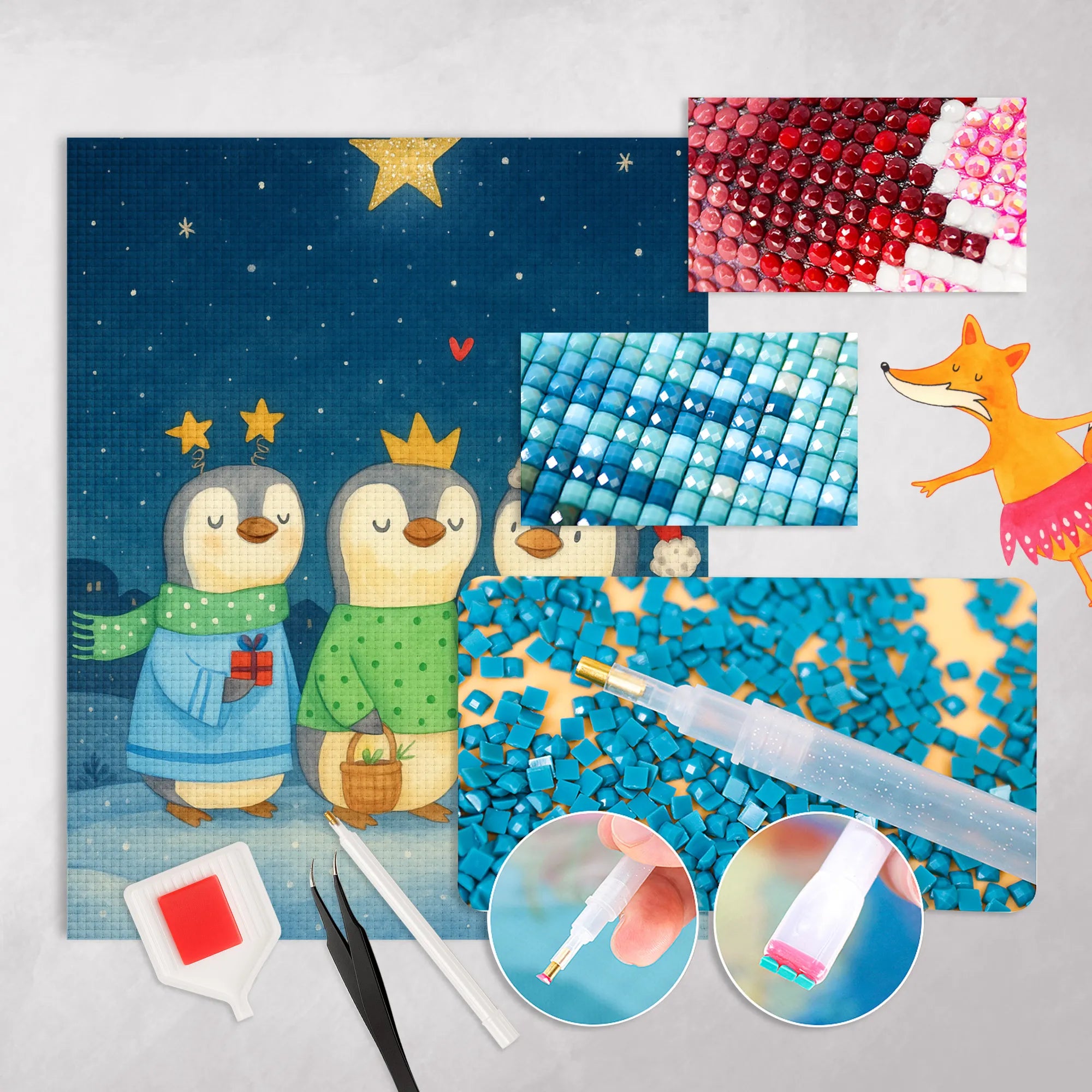 - Complete Set: Canvas (self-adhesive), colored resin diamonds (square), pen, wax, sorting tray & instructions