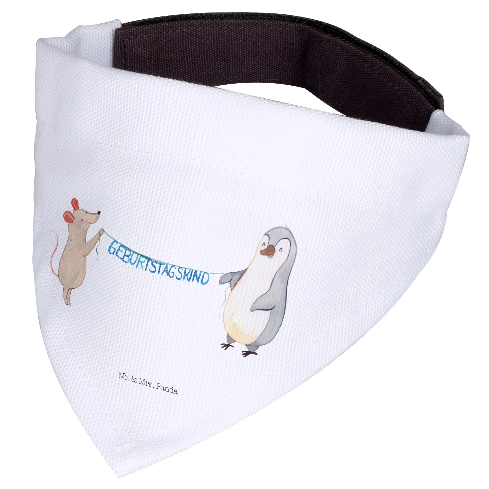 Imagine your dog flaunting this whimsical neckerchief during a birthday party with friends and family. It’s not just any ordinary neckerchief; it’s a vibrant celebration in cloth form! The playful Mouse and Penguin characters, who seem to be holding a garland together, light up the atmosphere of any birthday event with their cheerful presence. Each intricate detail of the design is lovingly hand-drawn with watercolor by Mrs. Panda, ensuring every piece is unique and filled with love.
