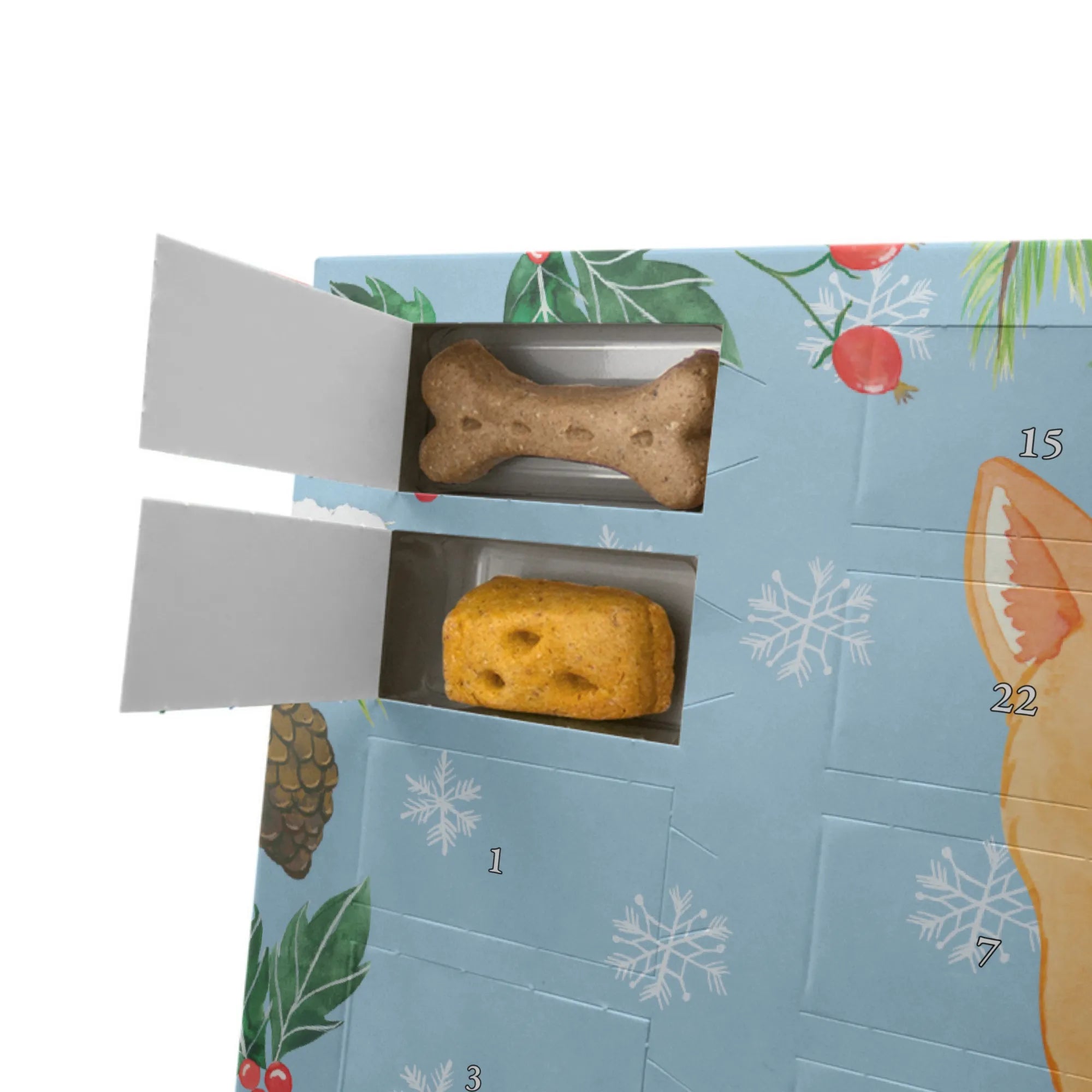 Discover the charm of the personalized dog advent calendar by Mr. & Mrs. Panda, exclusively printed with loving designs and ready to be customized with your loyal friend's name. Experience the joy as your four-legged companion uncovers one of 24 premium treats each day, carefully selected from the finest ingredients without preservatives. A celebration of flavor diversity that reflects love and care in every single reward.