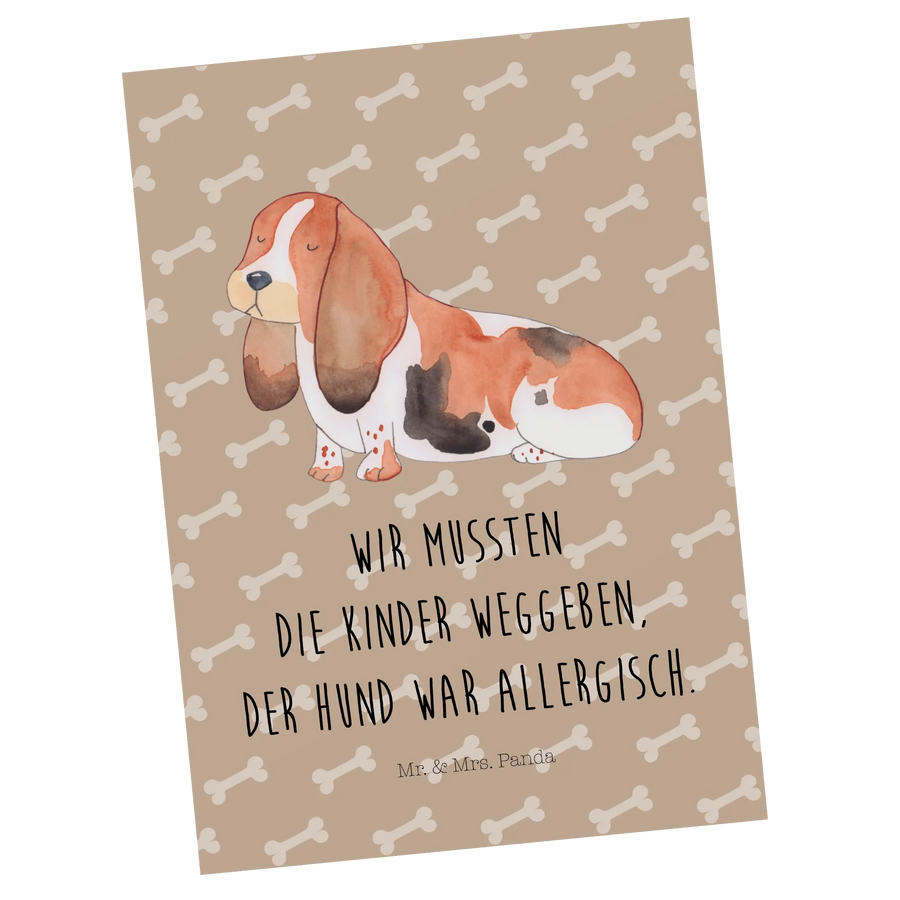 The front of this postcard features a beautifully designed Basset Hound, lovingly illustrated by Mrs. Panda. Imagine your loved ones receiving this thoughtful card, perhaps featuring the humorous slogan "We had to give the kids away. Our dog was allergic." This lighthearted phrase perfectly captures the essence of dog ownership and brings an element of fun to the gift-giving experience. Alternatively, a version without text is also available for those who prefer to pen their own thoughts.