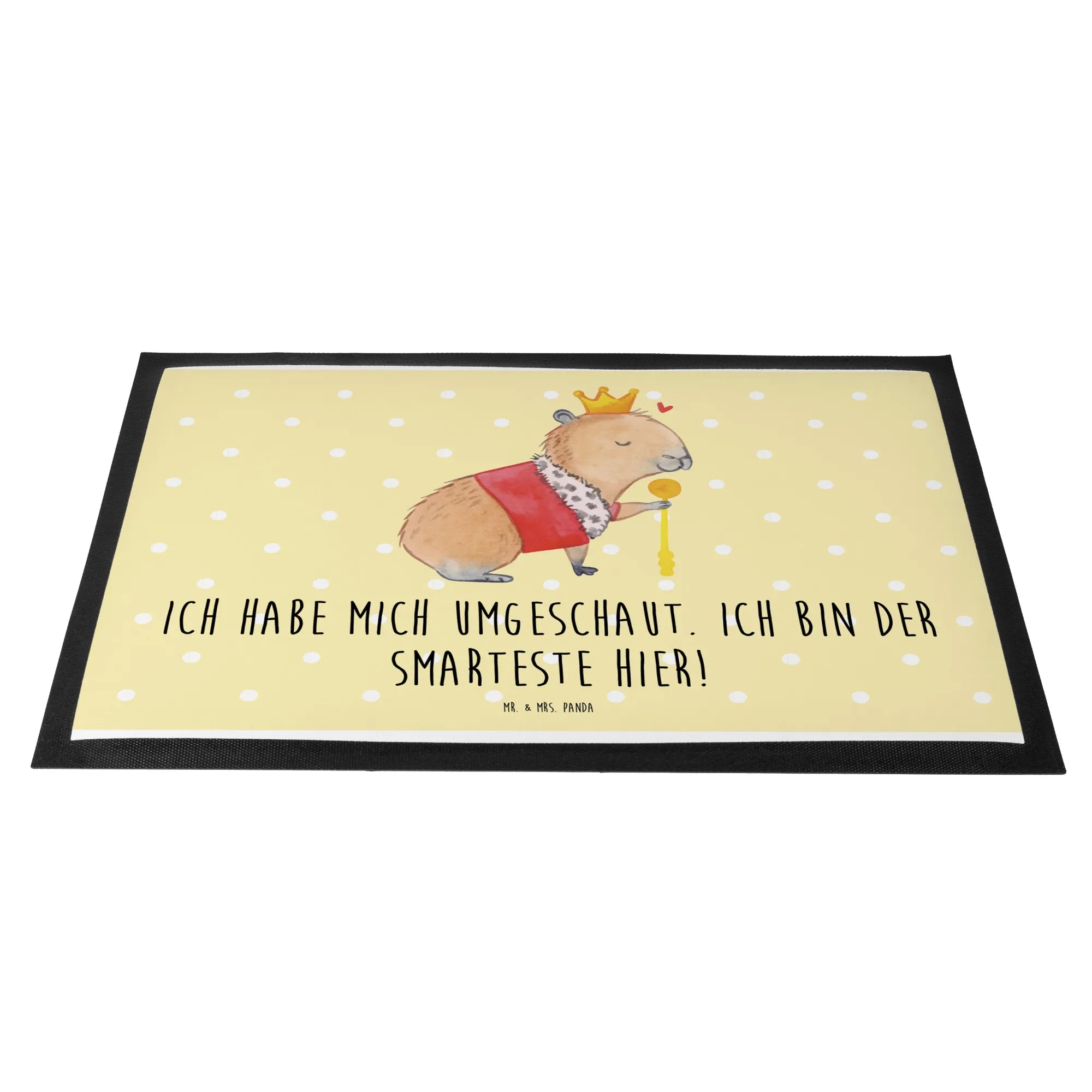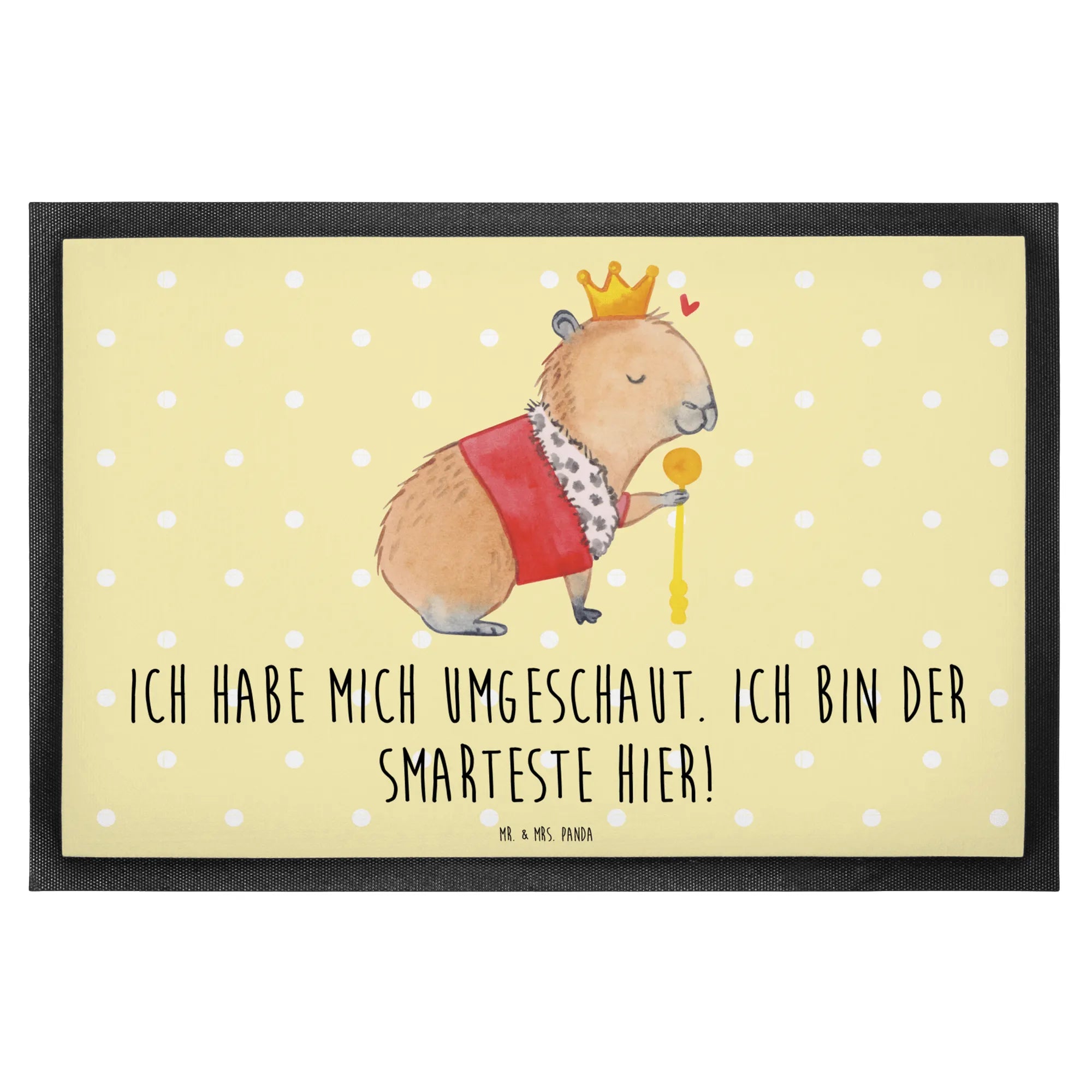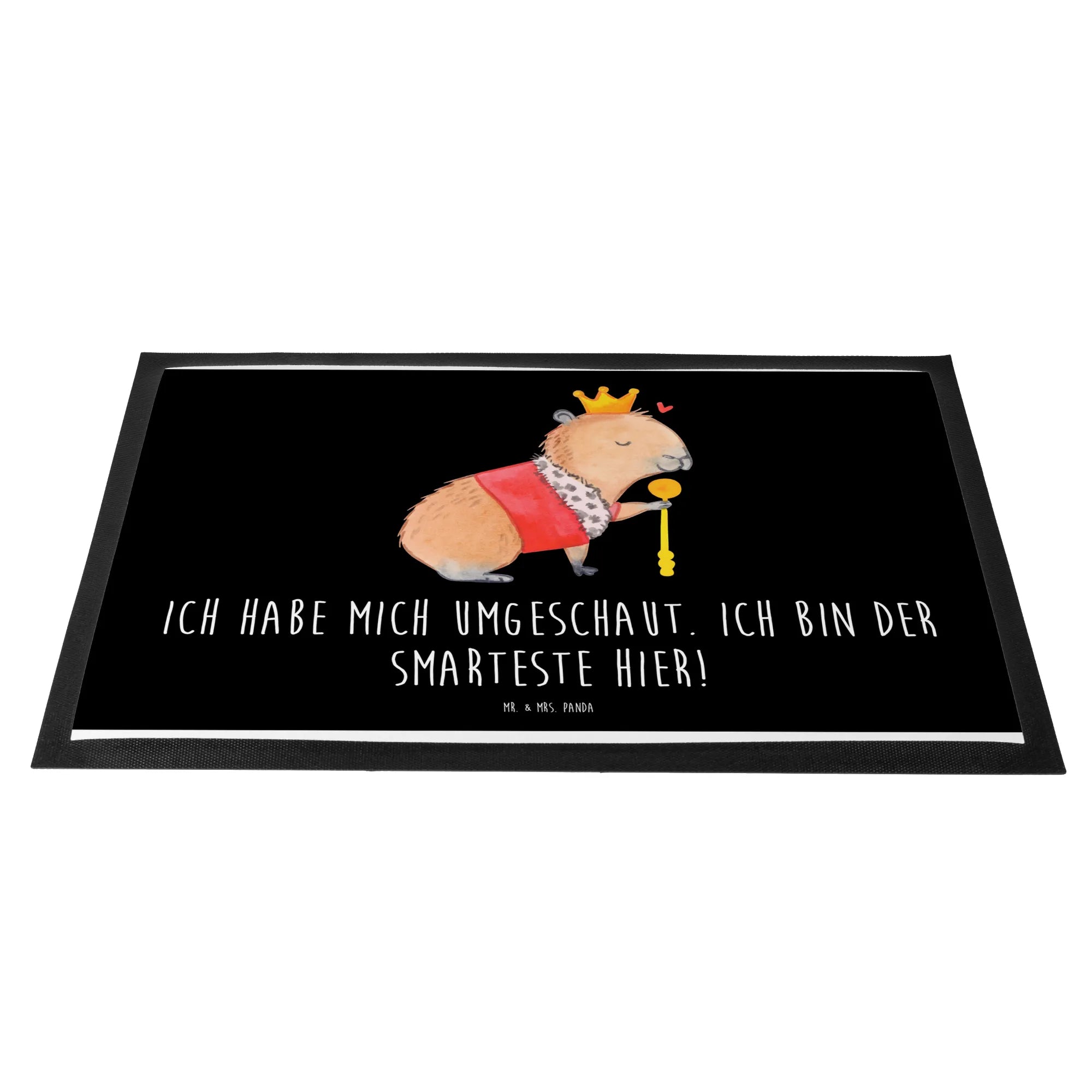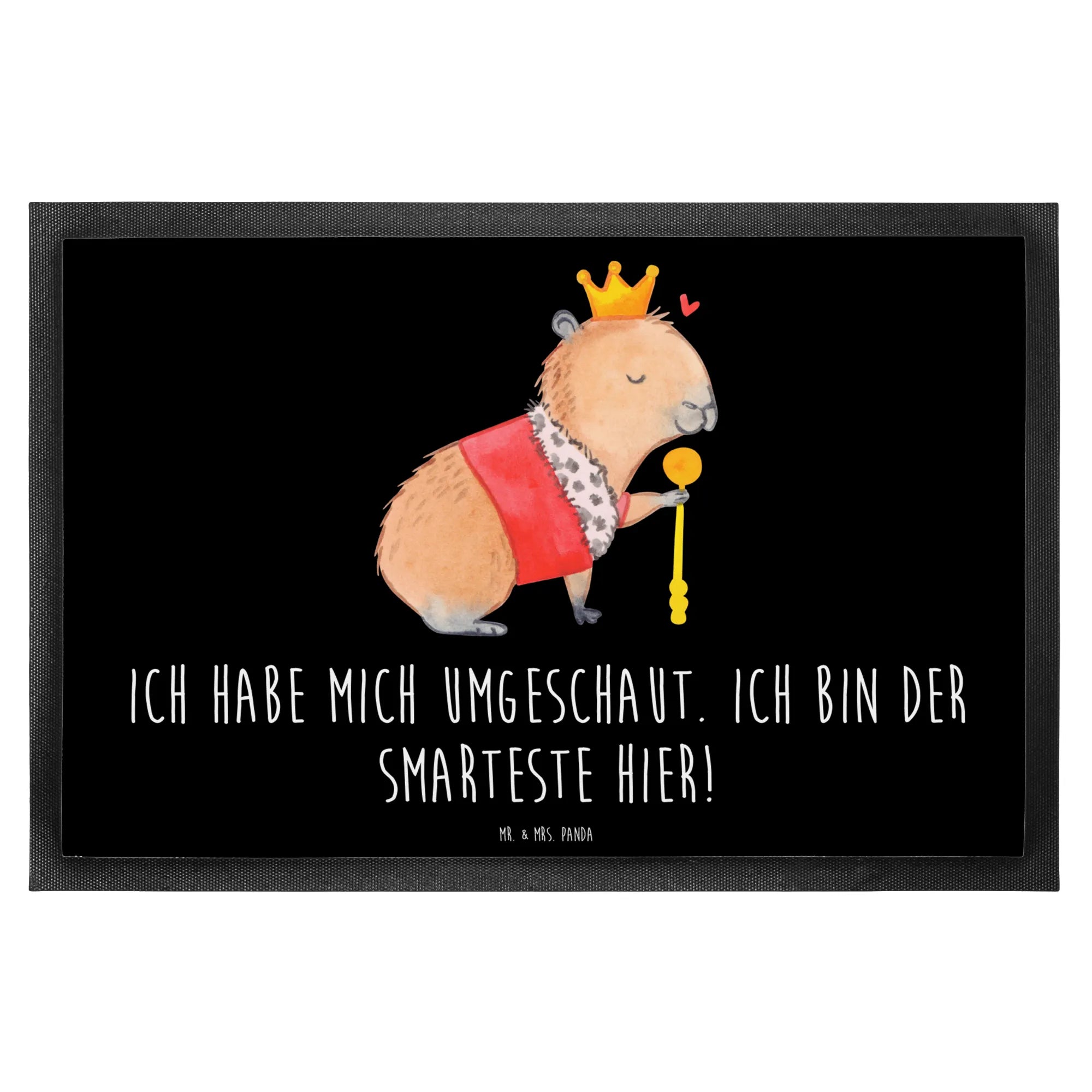 Meet our regal friend, the Capybara King! This charming creature, adorned with a golden crown and a splendid purple cloak trimmed with soft white fur, embodies tranquility and authority. He sits contentedly, his eyes gently closed, while holding his golden scepter firmly in his paw. A small red heart floats nearby, a symbol of his loving essence. This motif beautifully captures the essence of royalty while reminding us that true nobility comes from within. As our Capybara King wisely states, 'Ich habe mich umgeschaut. Ich bin der Smarteste hier!' – a gentle nudge to recognize our own unique wisdom.
