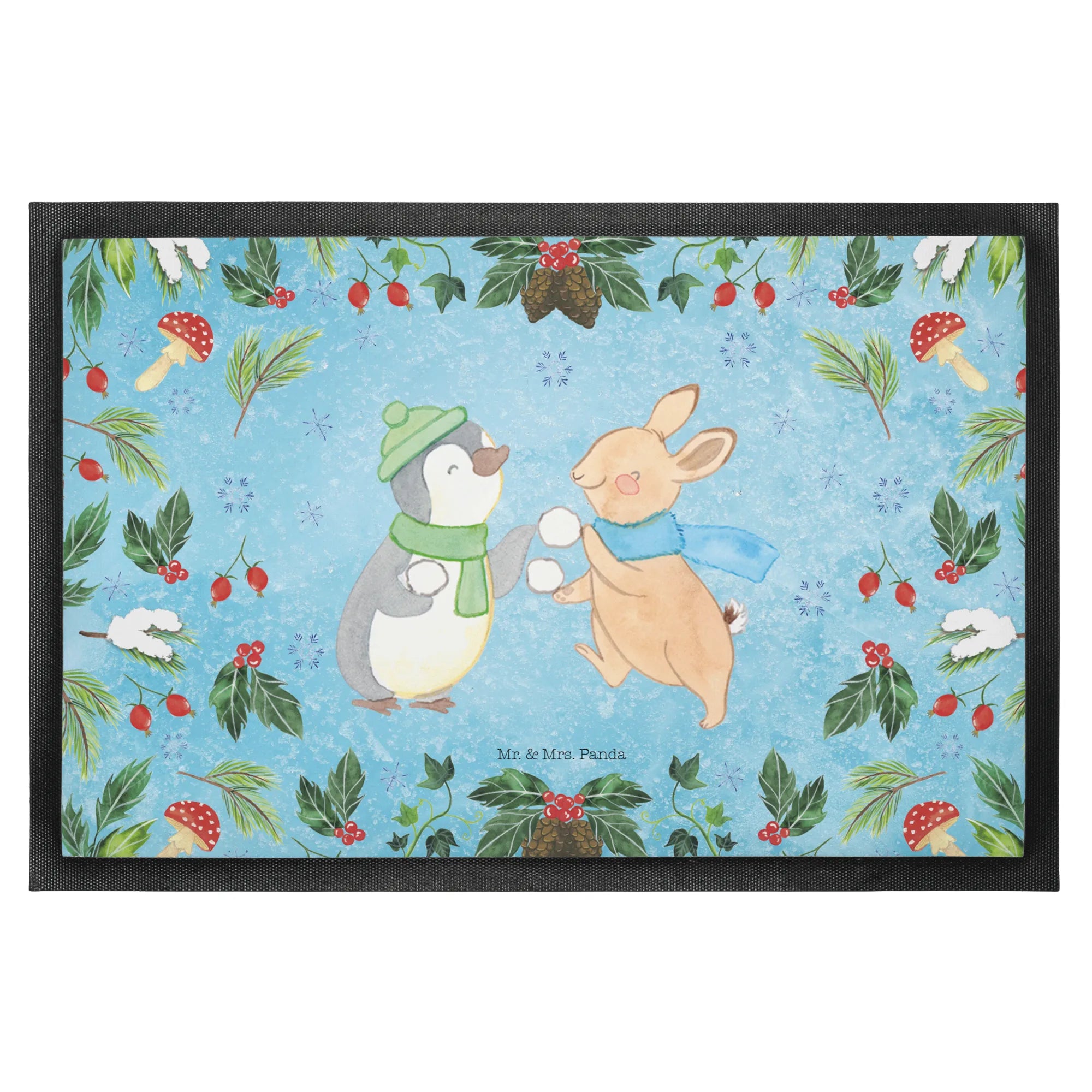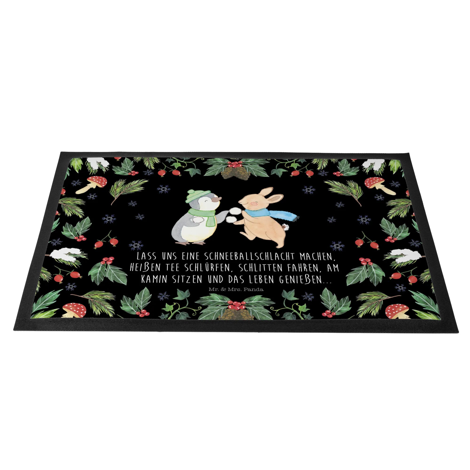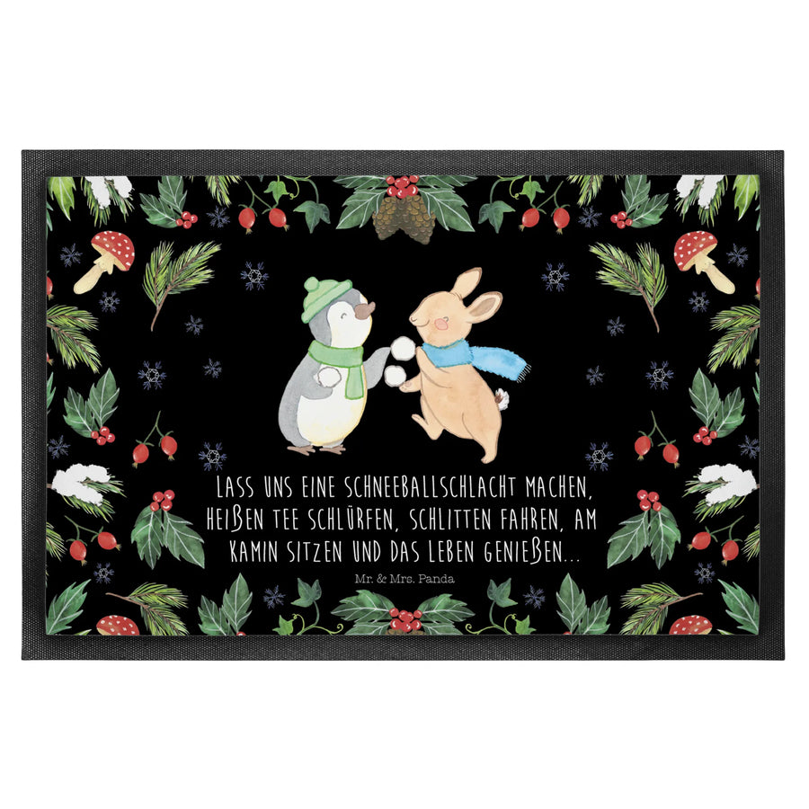 Doormat penguin rabbit snowball fight - 50 x 75 cm - with a saying - Black