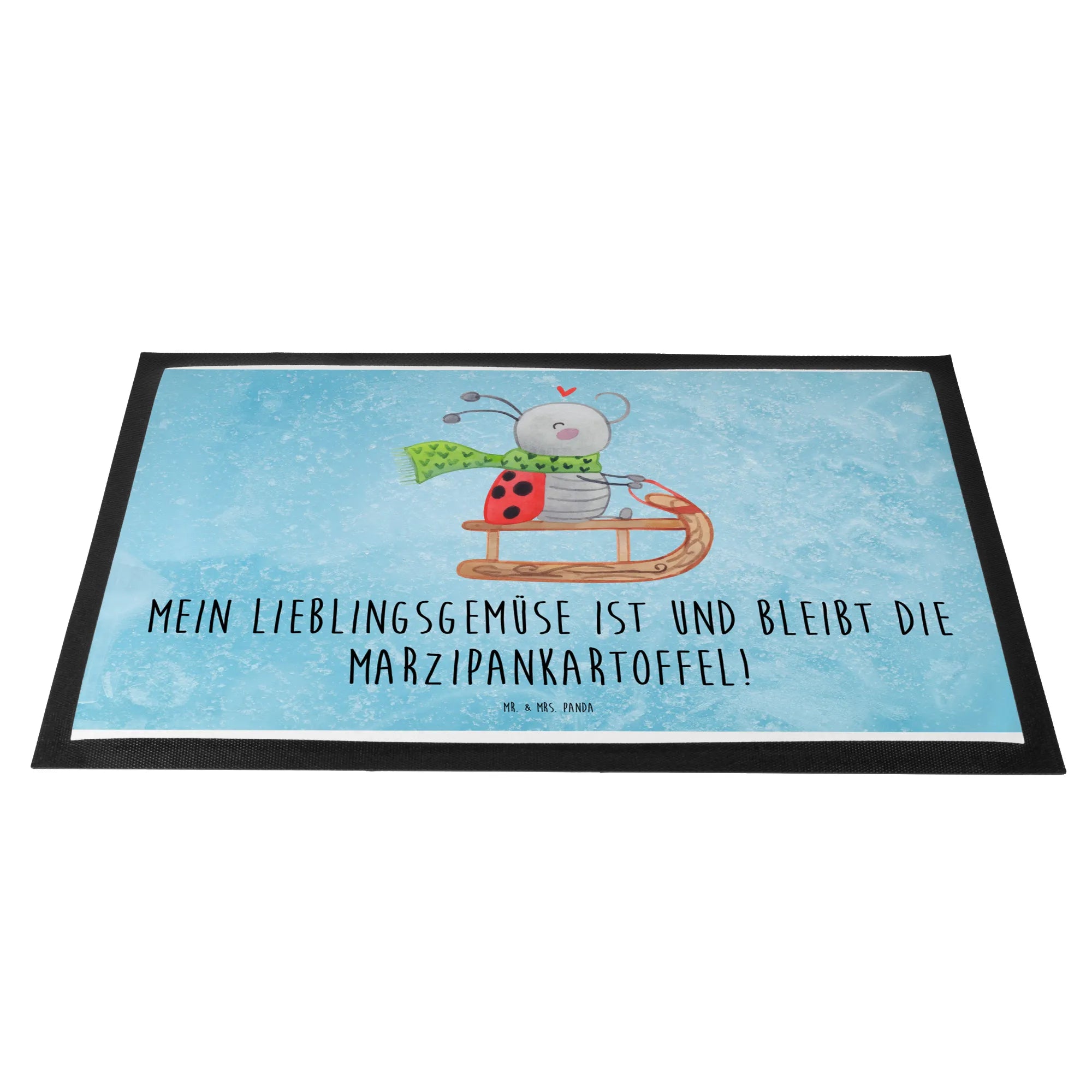 Envision a joyful ladybug, bright-eyed and grinning, as it zooms down the snowy slope on its sled. Wrapped snugly in a green scarf peppered with hearts, it perfectly epitomizes the spirit of winter fun. With a swirling heart floating above, the motif extends an invitation to relish the thrilling moments amidst the winter chill. The catchy slogan, 'Mein Lieblingsgemüse ist und bleibt die Marzipankartoffel!' adds a twist of playfulness, reminding us to savor both winter adventures and sweet treats that warm our souls.