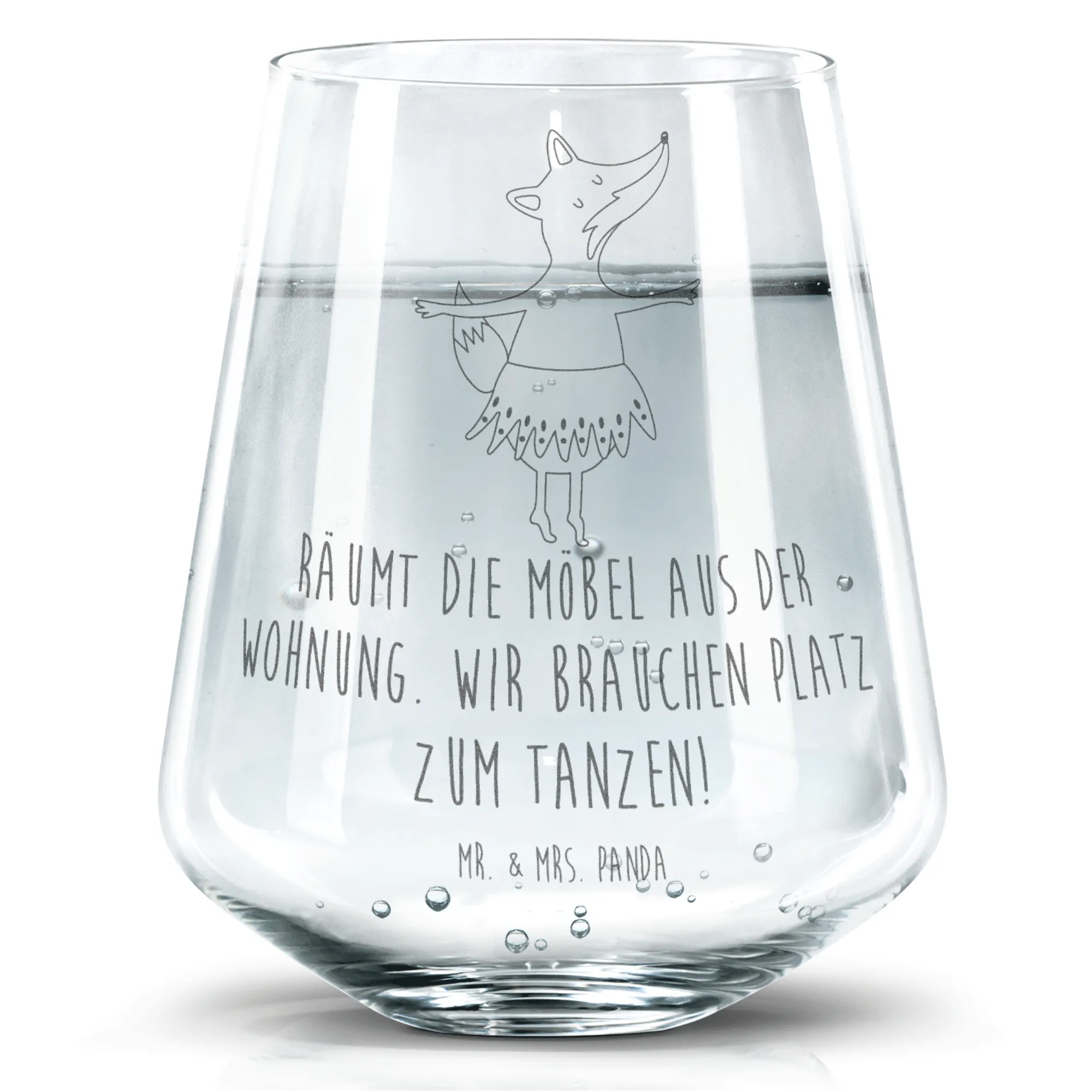 Das Trinkglas "Fuchs Ballerina" aus der Sammlung von Mr. & Mrs. Panda ist das perfekte Geschenk für alle, die das Besondere lieben. Mit seiner zauberhaften Gravur eines tanzenden Fuchses und dem fröhlichen Spruch "Räumt die Möbel aus der Wohnung. Wir brauchen Platz zum Tanzen!" bringt dieses Glas Schwung und Freude in jeden Alltag.