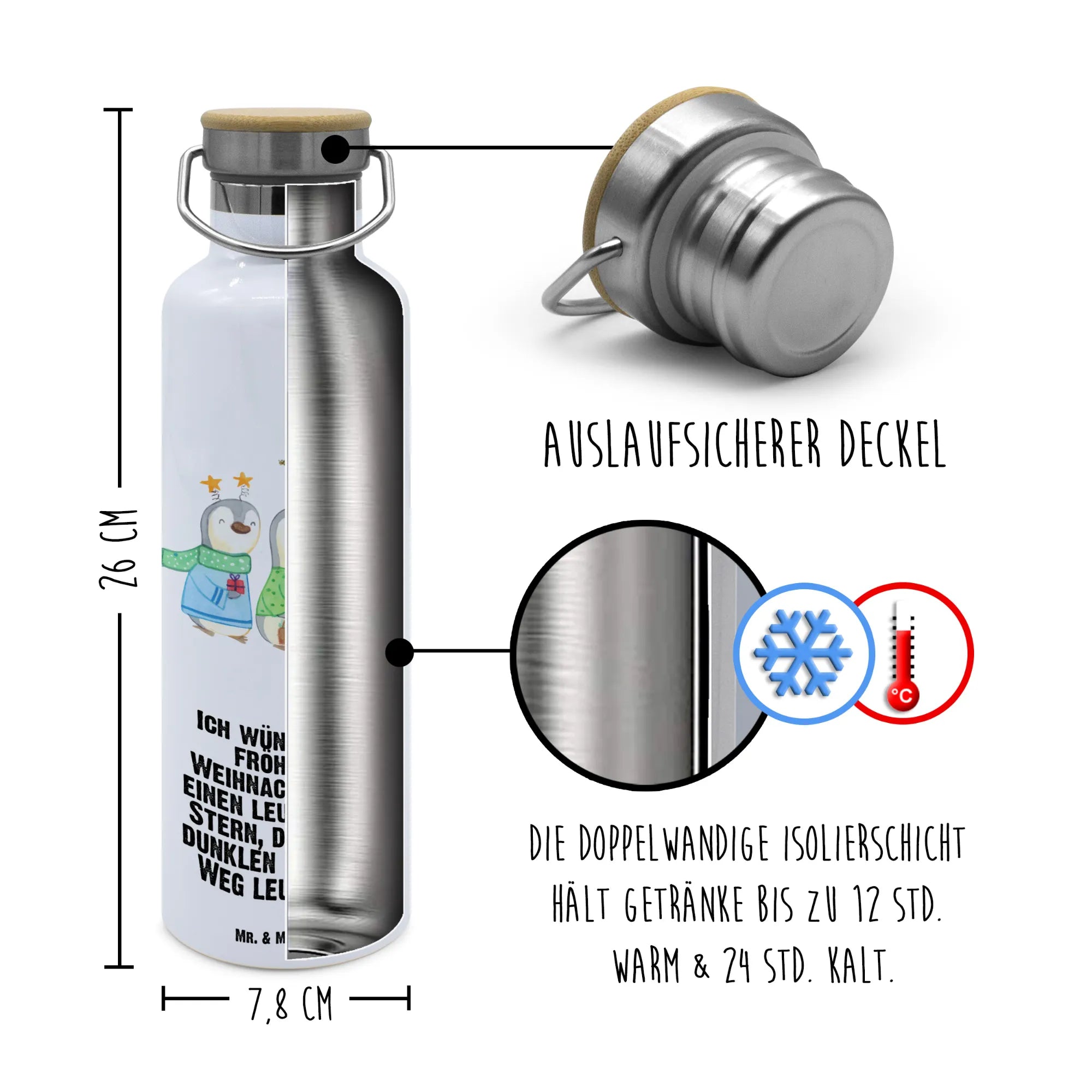 Introducing the charming Drinks Bottle by Mr. & Mrs. Panda! This whimsical bottle is not only practical but adds a touch of fun to your hydration routine. Constructed with double-walled stainless steel and topped with a natural bamboo lid, it offers excellent insulation for both hot and cold drinks. Featuring a spacious capacity of 750 ml (25 oz), and measuring 255 mm (10 in) tall and 78 mm (3 in) wide, it is perfect for school, university, the office, or your next adventure. The inspiring quotes and creative designs will make drinking water feel like a treat! Ideal for bottled fizz too. Don’t forget to wash it by hand for longevity. Lightweight yet durable, it’s the perfect partner wherever you go!
