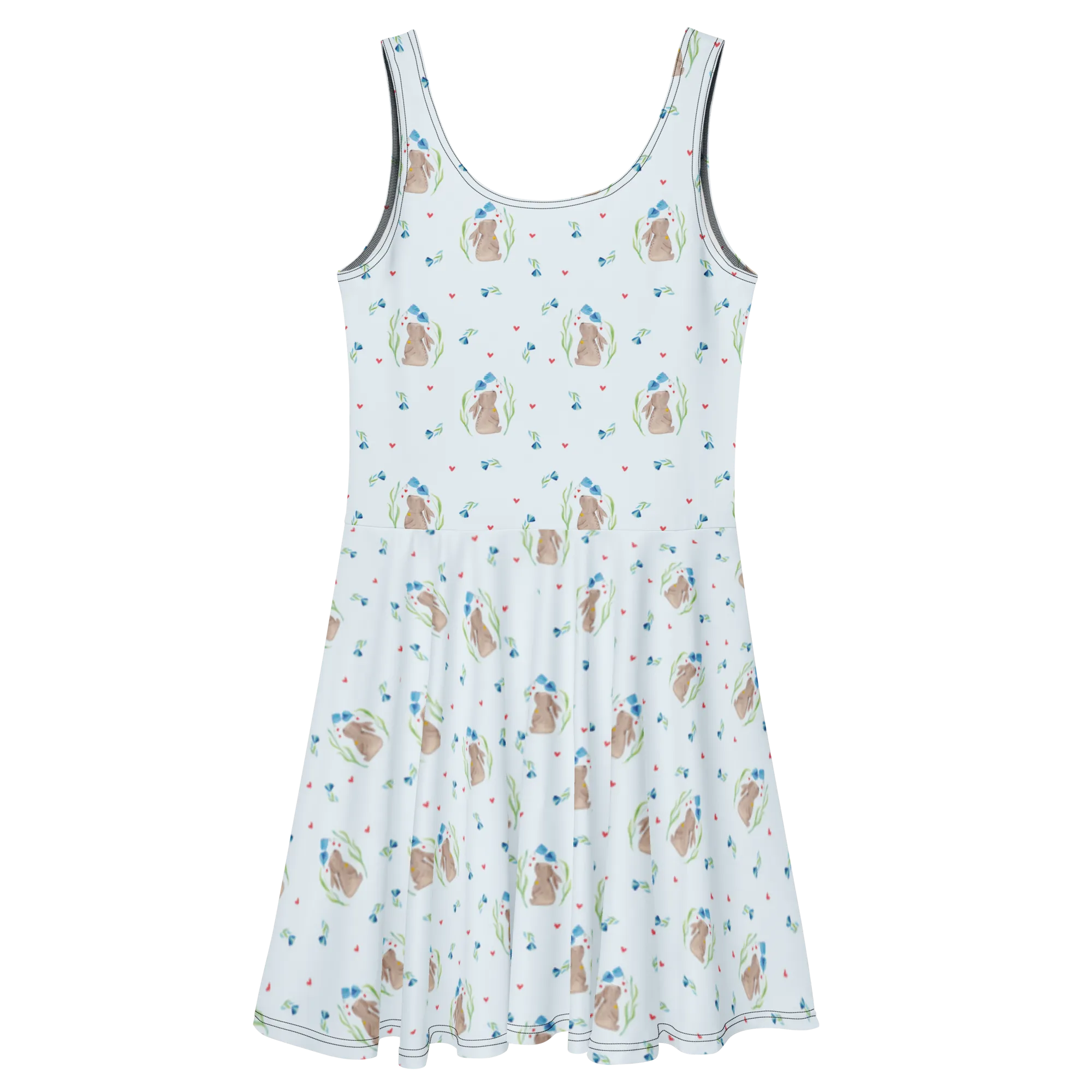 Mr. & Mrs. Panda Sommerkleid „Hase Blume“ – ein verspieltes Skaterkleid aus unserer liebevollen Ostern - Kollektion, das Frühlingsfreude und zarte Träume verbindet. 🐰🌸 Das Motiv zeigt einen süßen Hasen zwischen bunten Blumen, mit einem kleinen Glöckchen um den Hals. Ideal für Ostern, Familienfeiern, Taufen und besondere Anlässe.