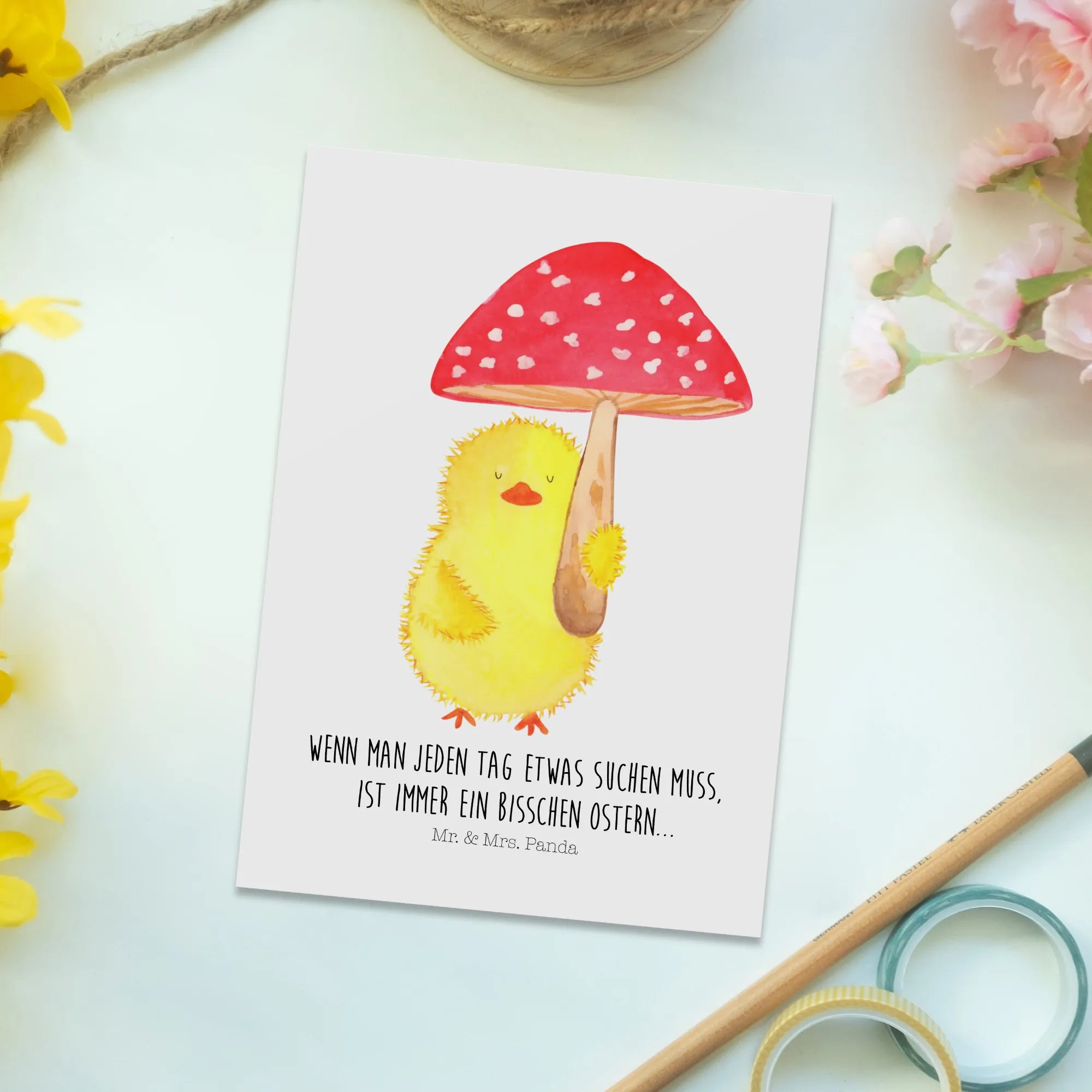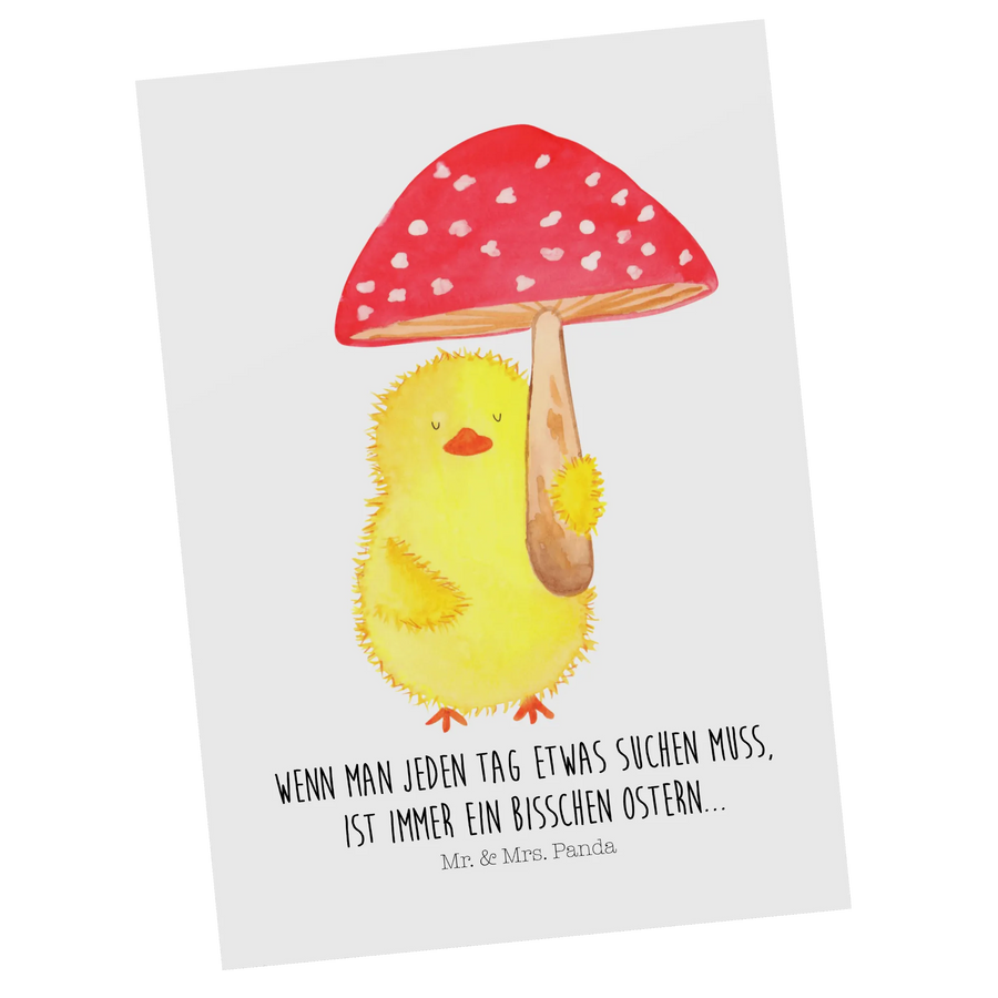 Welcome to a world of delightful surprises with our beautifully crafted Postcard featuring cute Chicks under a charming fly agaric - directly from the enchanting Easter Collection by Mr. & Mrs. Panda! This unique postcard is perfect for sharing warm Easter greetings with your friends and family.