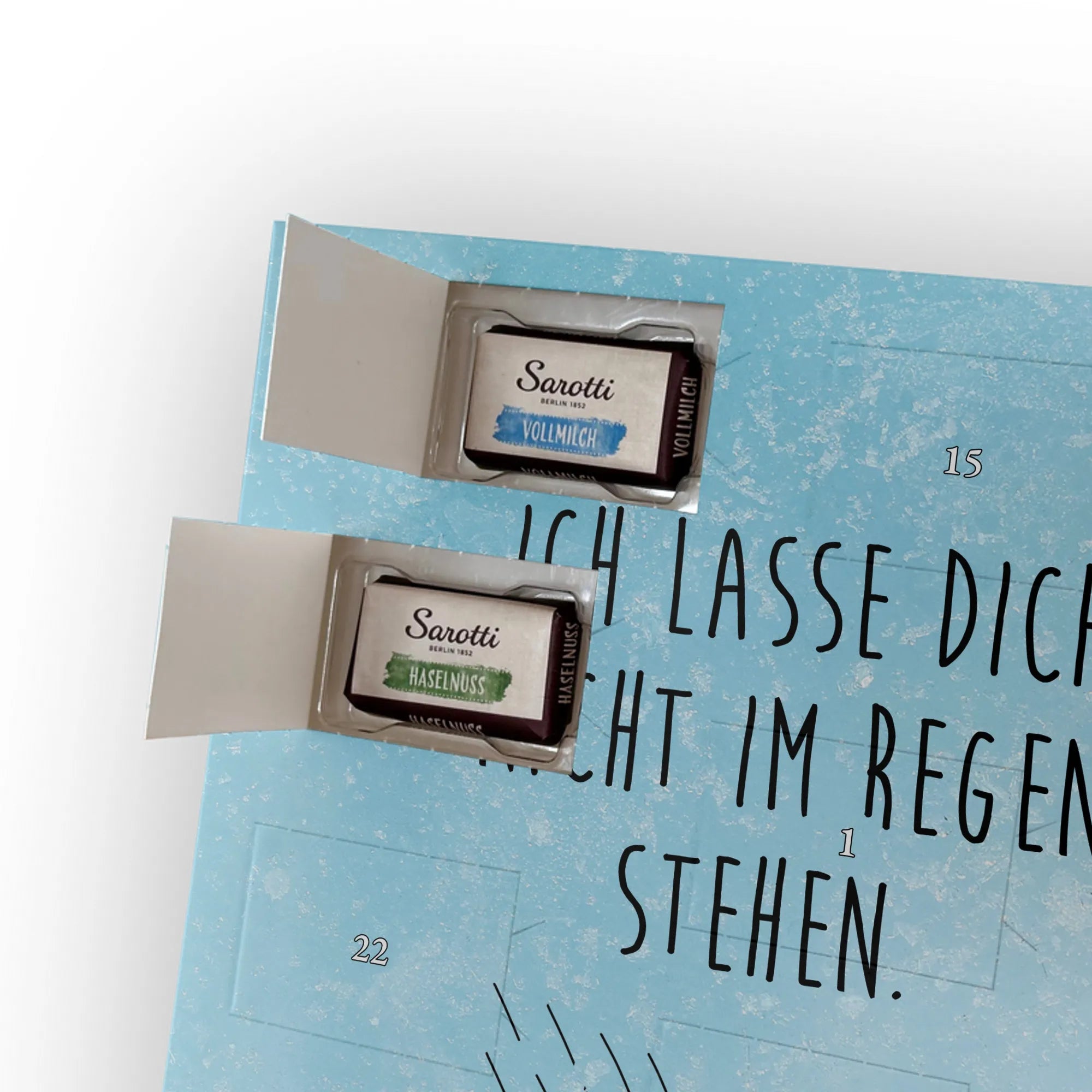 Personalisierter Schoko-Adventskalender mit Foto – das kleine Weihnachtswunder von Mr. & Mrs. Panda! Verschenke jeden Tag Vorfreude: Der Kalender ist liebevoll gestaltet mit unseren herzlichen Illustrationen und Sprüchen, während dein Foto die persönliche Mitte bildet. Bitte lade ein hochauflösendes Foto hoch und prüfe den Bildausschnitt, damit nichts Wichtiges verloren geht. Nutze nur Bilder, für die du die Rechte hast. Die hochwertige, seidenmatte Veredelung und die bedruckten Seitenflächen garantieren ein edles Erscheinungsbild. Maße: 355 mm x 245 mm x 11 mm; lässt sich sowohl aufhängen als auch aufstellen. Achtung: Fotos werden nicht nachbearbeitet oder zugeschnitten; personalisierte Artikel sind vom Rückgaberecht ausgeschlossen. Gefüllt mit 24 einzeln verpackten Schokoladentäfelchen aus den vier Geschmacksrichtungen Vollmilch, Nougat, Zartbitter und Haselnuss – von Sarotti® und Confiserie Heidel®. Insgesamt enthält der Kalender 107 g Markenschokolade. Ein persönliches Geschenk mit süßem Inhalt, ideal für Partner, Familie und Freunde, verpackt mit der typischen Mr. & Mrs. Panda Liebe zum Detail.