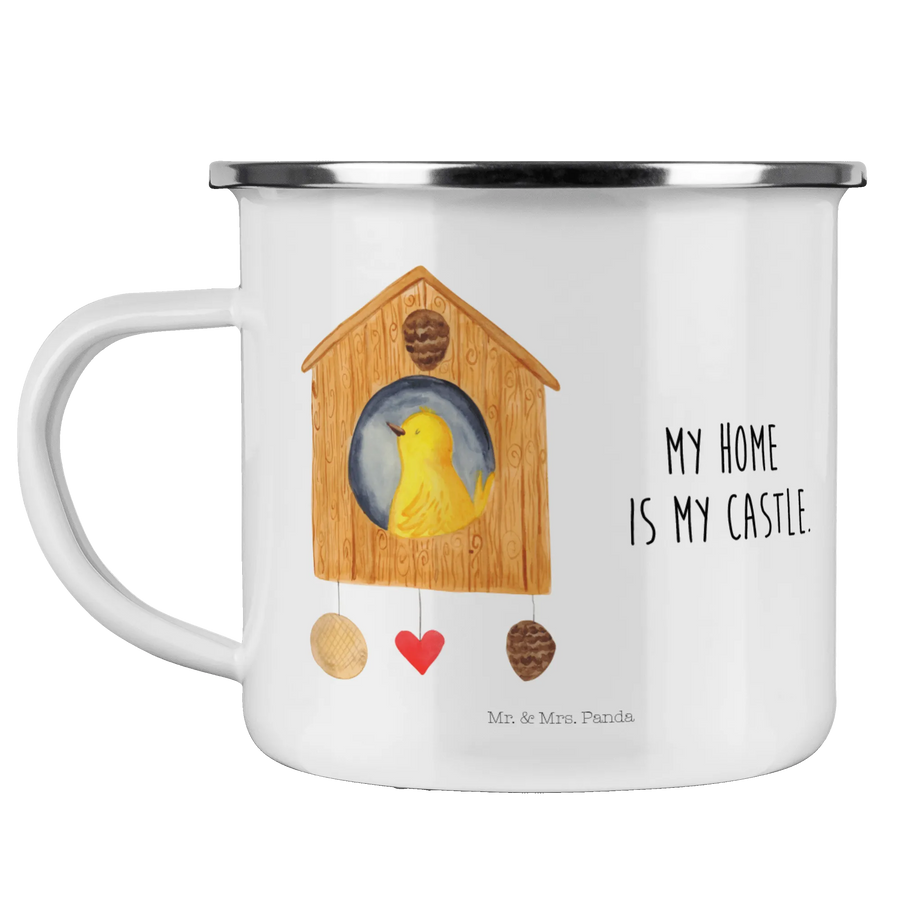 Enamel camping mug Bird House - with a saying - White