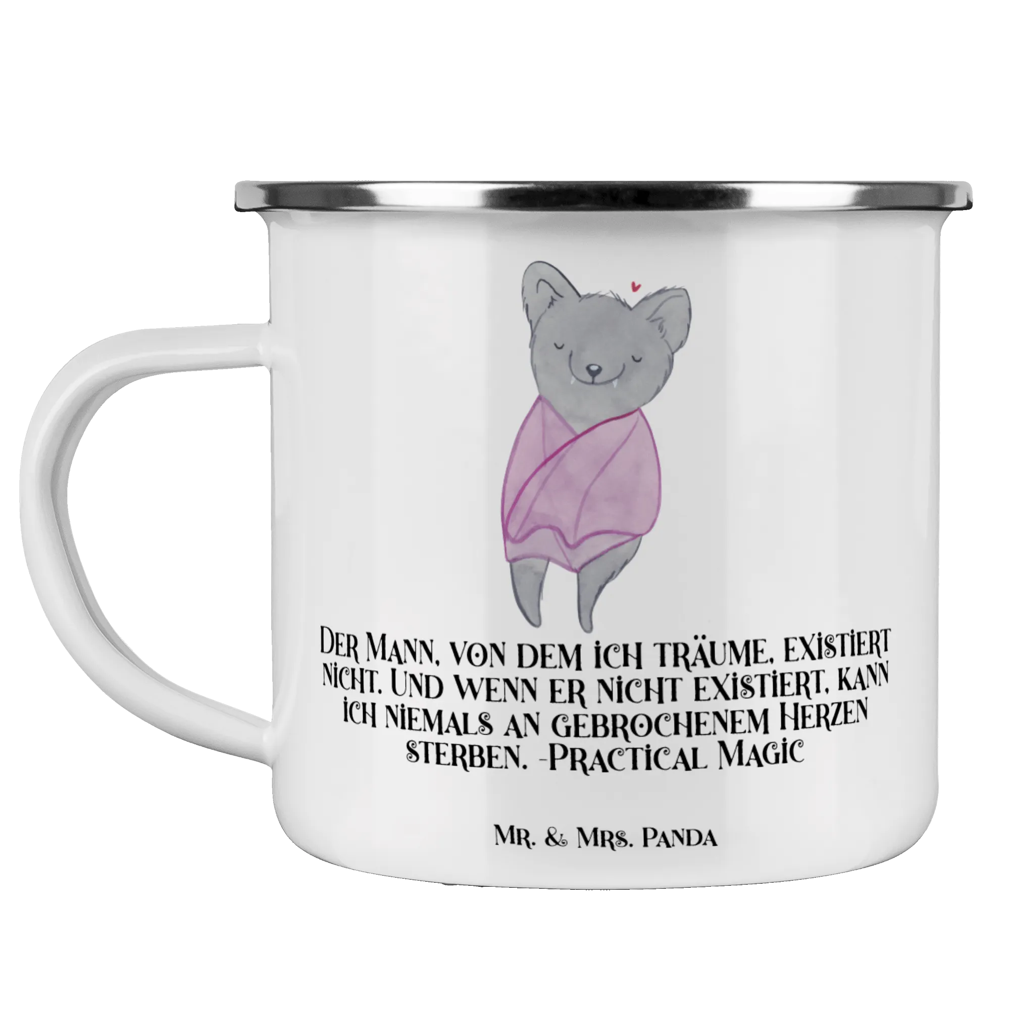 Enamel camping mug Der Mann, von dem ich träume, existiert nicht. Und wenn er nicht existiert, kann ich niemals an gebrochenem Herzen sterben. -Practical Magic