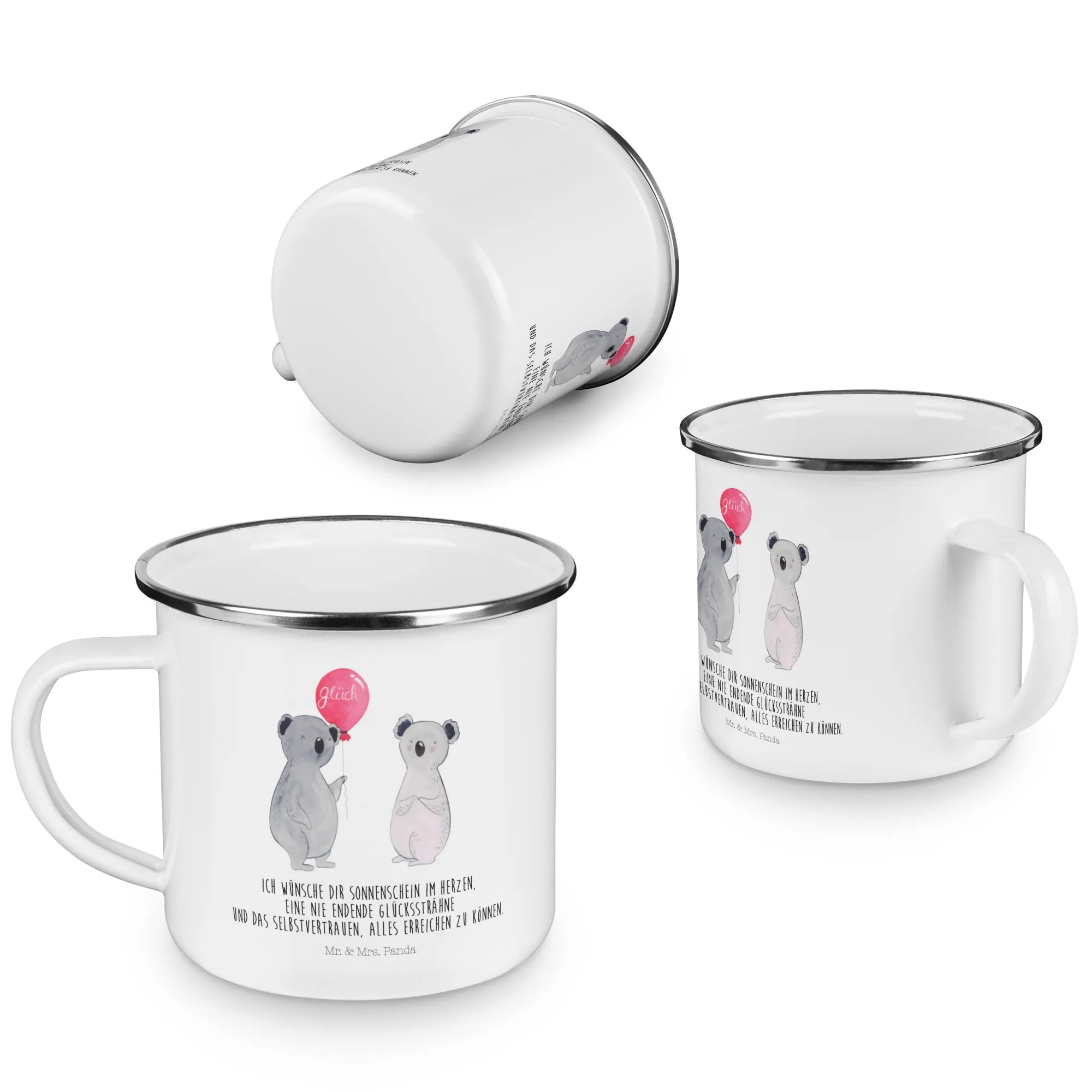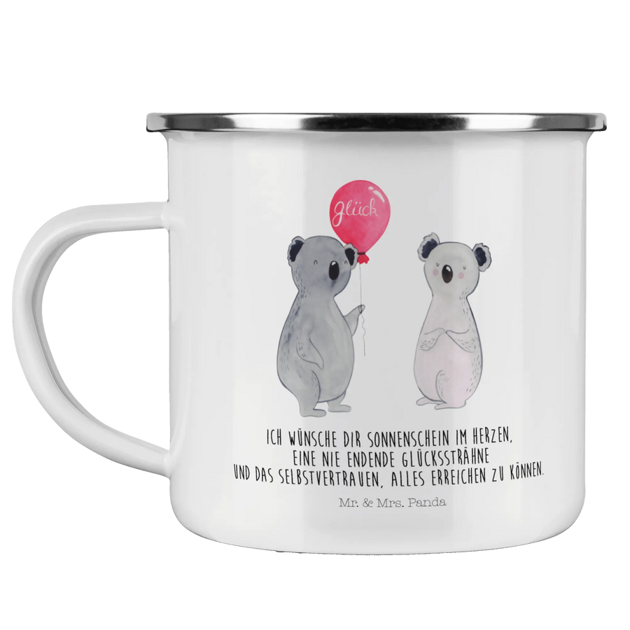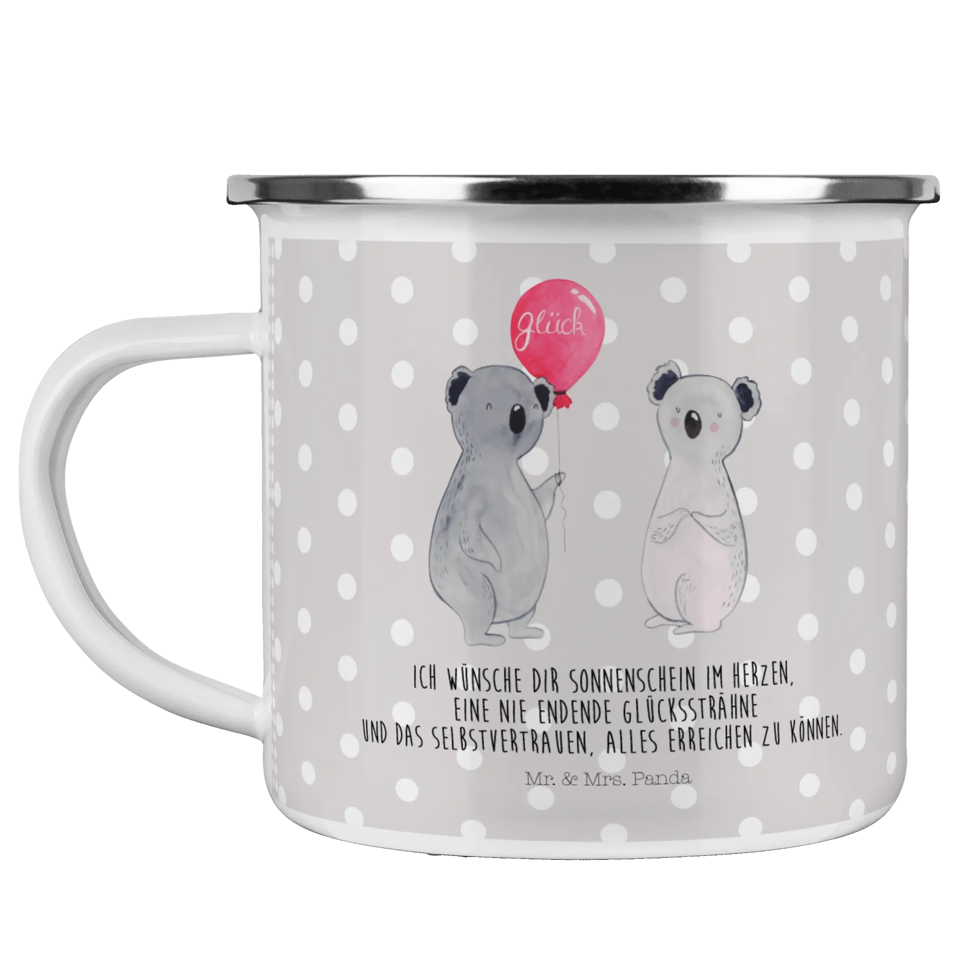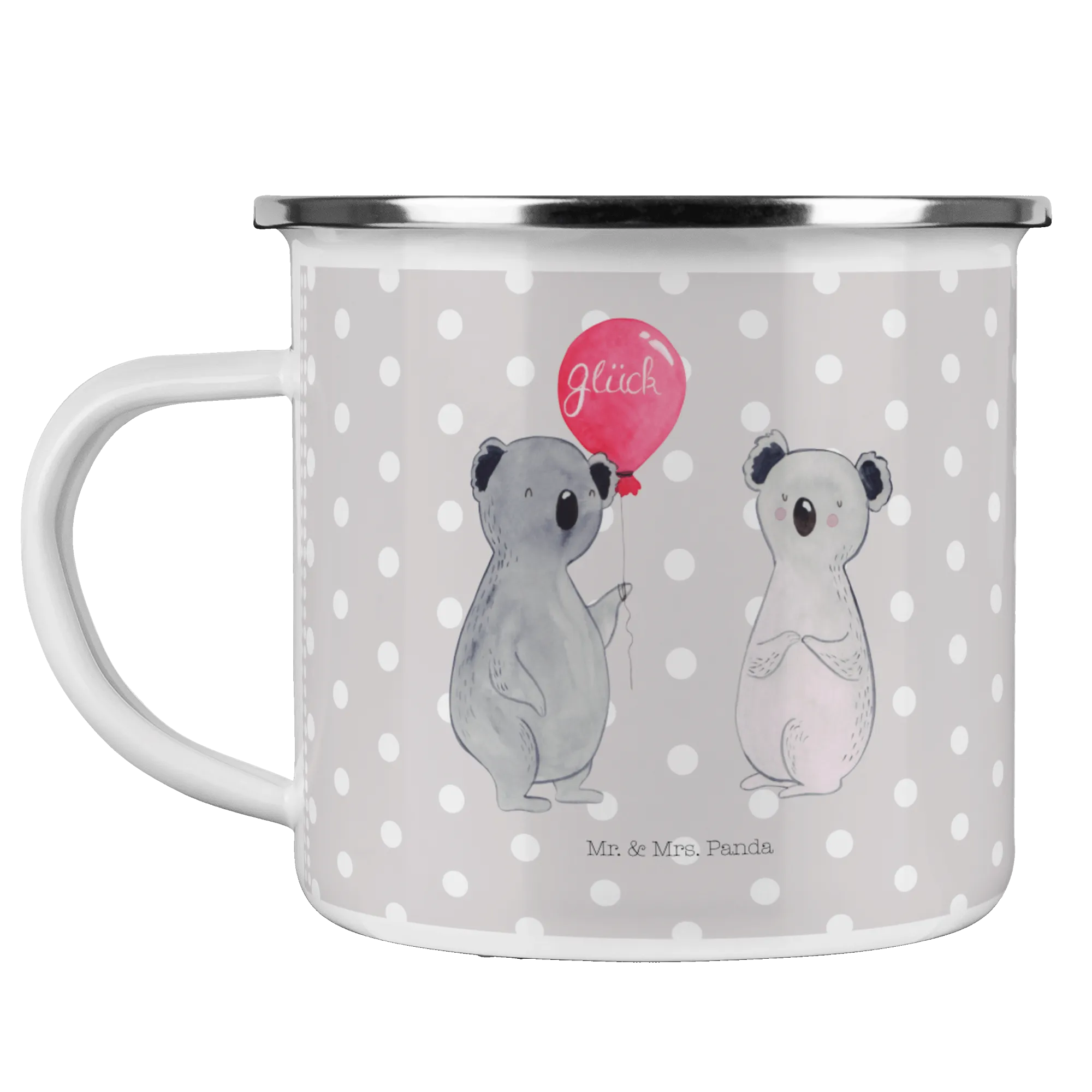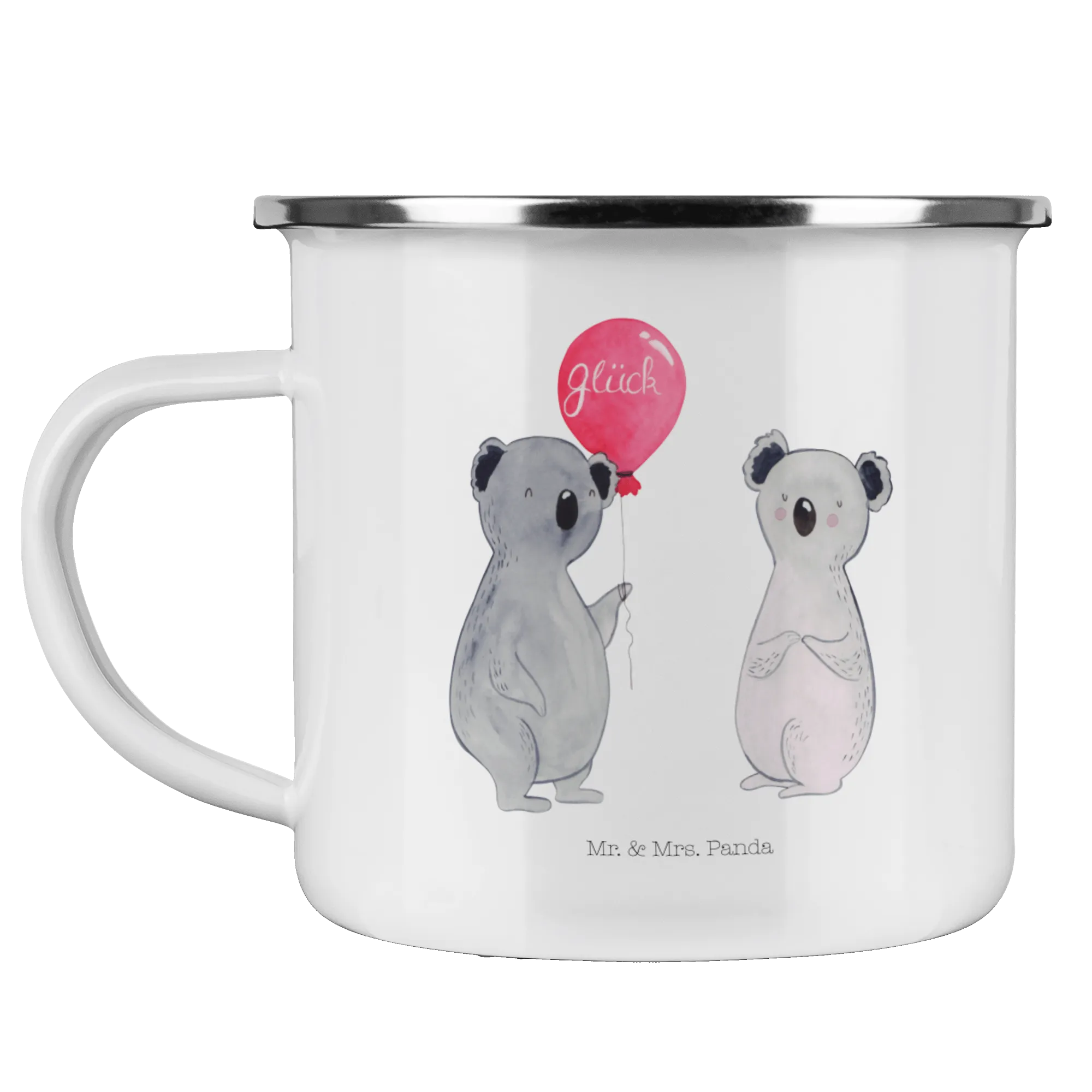 Ideal for those who cherish adventure, this camping mug is perfect for outdoor enthusiasts, hikers, and anyone who loves sipping their favorite drink while surrounded by nature. This fabulously designed enamel mug showcases two adorable koalas bursting with happiness, holding a colorful balloon, symbolizing joy and celebration.