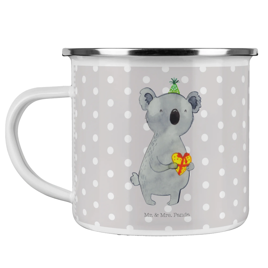 Discover the perfect blend of charm and practicality with our adorable Enamel Camping Mug featuring a delightful Koala design from the enchanting Koala Collection by Mr. & Mrs. Panda! This beautifully crafted camping mug is not just a piece of tableware; it's a warm hug that you can hold in your hands. Picture this: a cute koala, donning a party hat, joyfully presenting a heart-shaped gift. This lovely imagery will bring a smile to your face wherever your adventures take you.